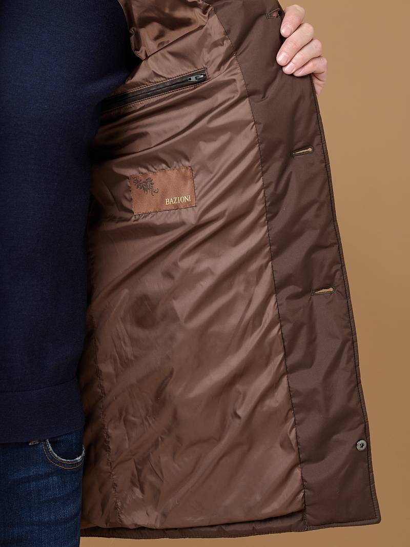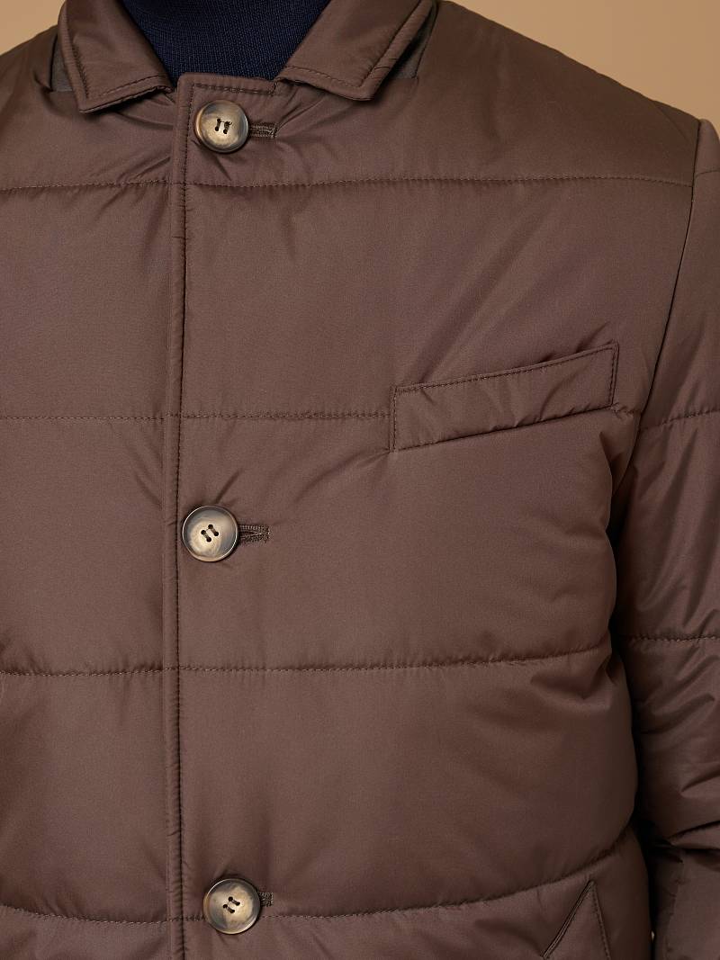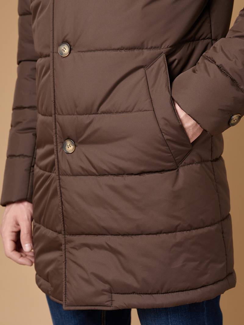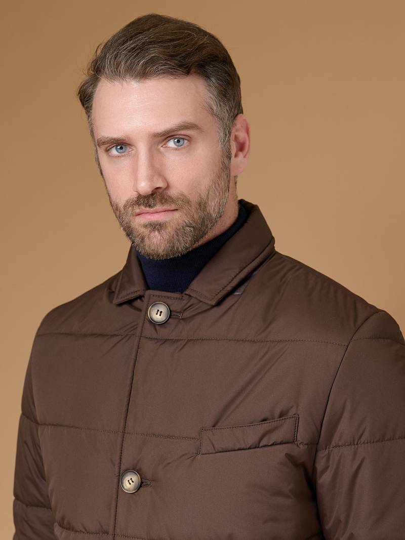 Мужская куртка - пальто утепленная с английским воротником - лацканами, из плащевой пуходержащей ткани c водоотталкивающей пропиткой, которая защищает от ветра, холода и дождя. Ткань верха плотная, практичная, не мнется. Застежка изделия на пуговицы. Полочки и спинка простеганы, на полочках - два кармана с листочками на скрытых магнитах. Спинка со шлицей. Рукава втачные с локтевыми швами. На подкладке - два внутренних кармана на молнии для удобного хранения документов. Утеплитель в изделии характеризуется легким весом, гигиеничностью и гипоаллергенностью, высокими теплоизоляционными качествами, экологичностью и безопасностью. Эластичный материал позволяет комфортно двигаться. Он отталкивает воду и не промокает, сохраняет тепло. Изделие подходит для ежедневного пользования. Длина по спинке - 90см. Ткань верха: 100%полиэстер. Подкладка: 100%полиэстер. Утеплитель: термоплюс 150гр/150гр.