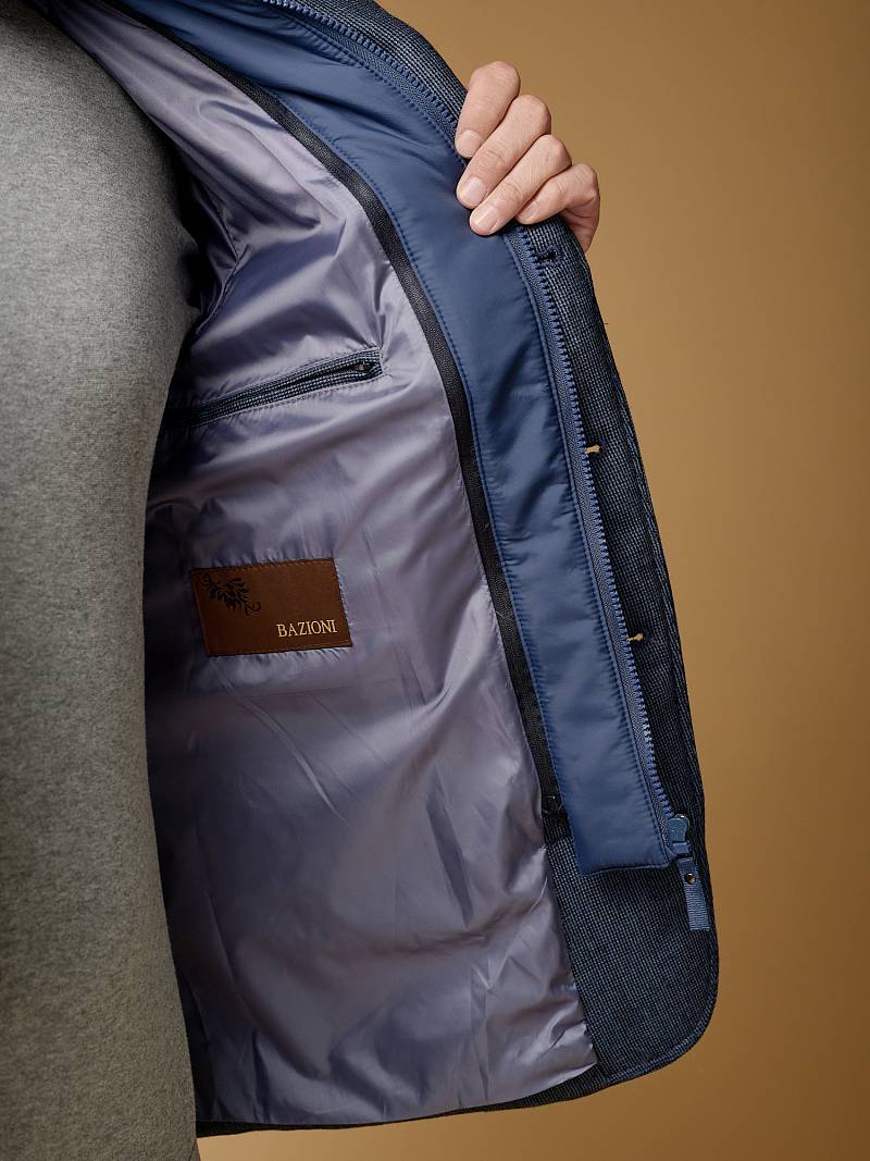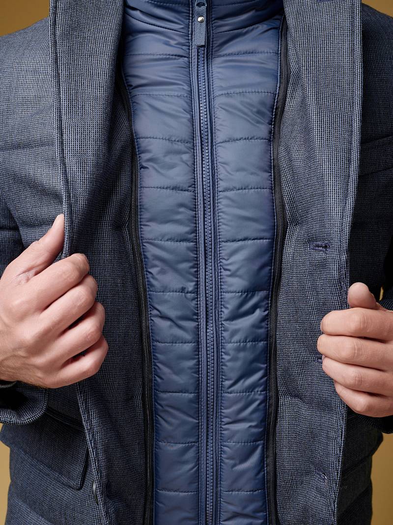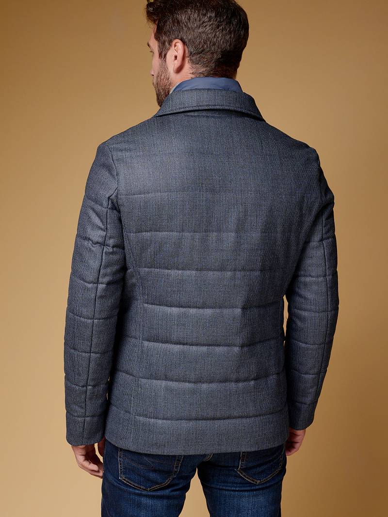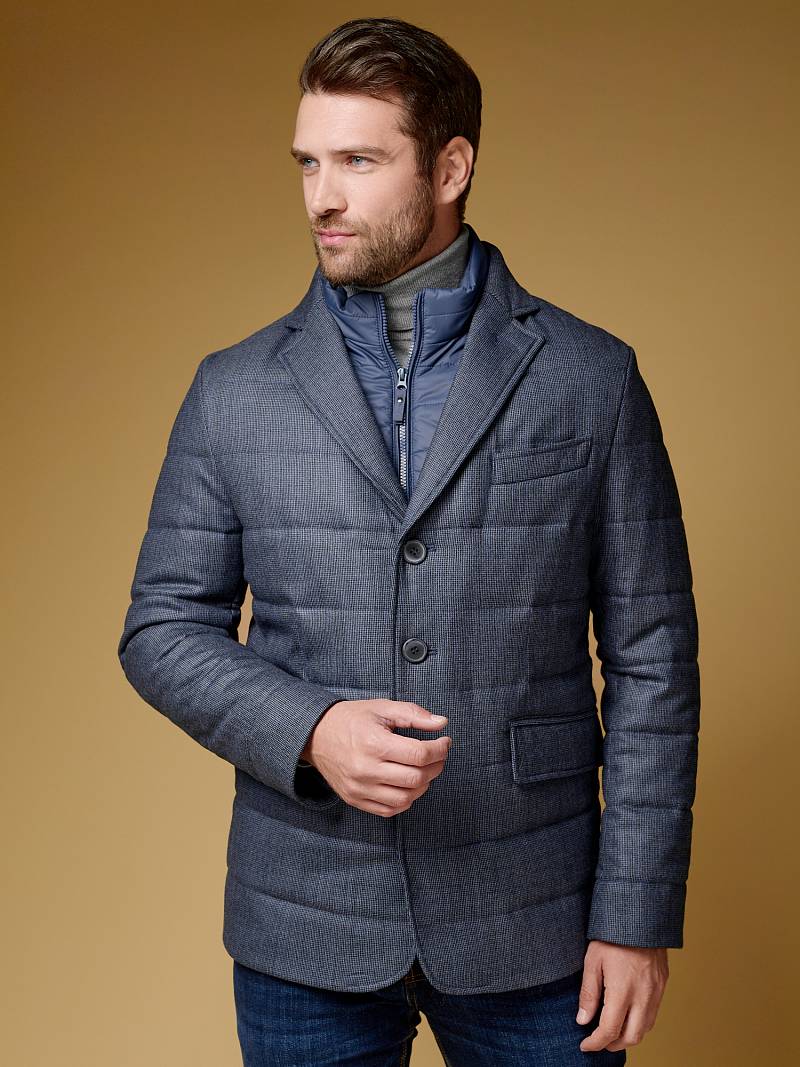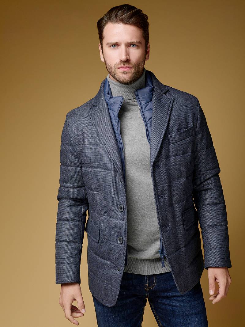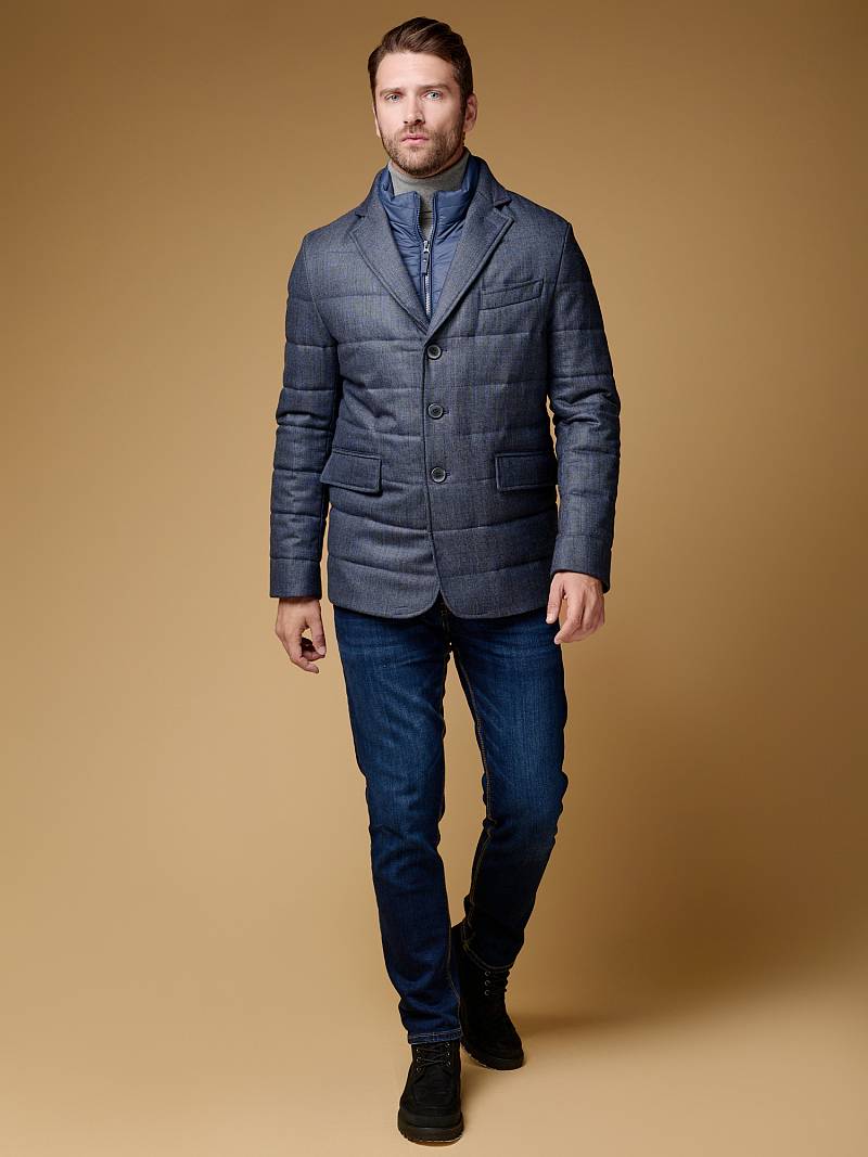 Куртка мужская утепленная из шерстяной ткани с английским воротником и со съемной манишкой. Манишка из пуходержащей ткани с водоотталкивающей пропиткой, защищает от ветра, холода и дождя. Застежка изделия на пуговицы. Полочки и спинка простеганы, на полочках - два кармана с клапанами на скрытых магнитах. Рукава втачные с локтевыми швами. На подкладке - два внутренних кармана на молнии для удобного хранения документов. Утеплитель в изделии характеризуется легким весом, гигиеничностью и гипоаллергенностью, высокими теплоизоляционными качествами, экологичностью и безопасностью. Рекомендуется обработать изделие водонепроницаемым аэрозолем для защиты от неблагоприятных погодных условий. Длина по спинке - 74см. Ткань верха: 100% шерсть. Подкладка: 100% полиэстер. Утеплитель: термоплюс 150гр./150гр.