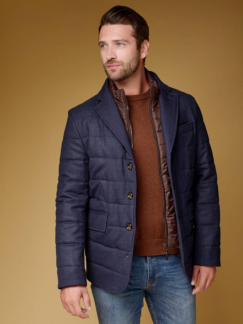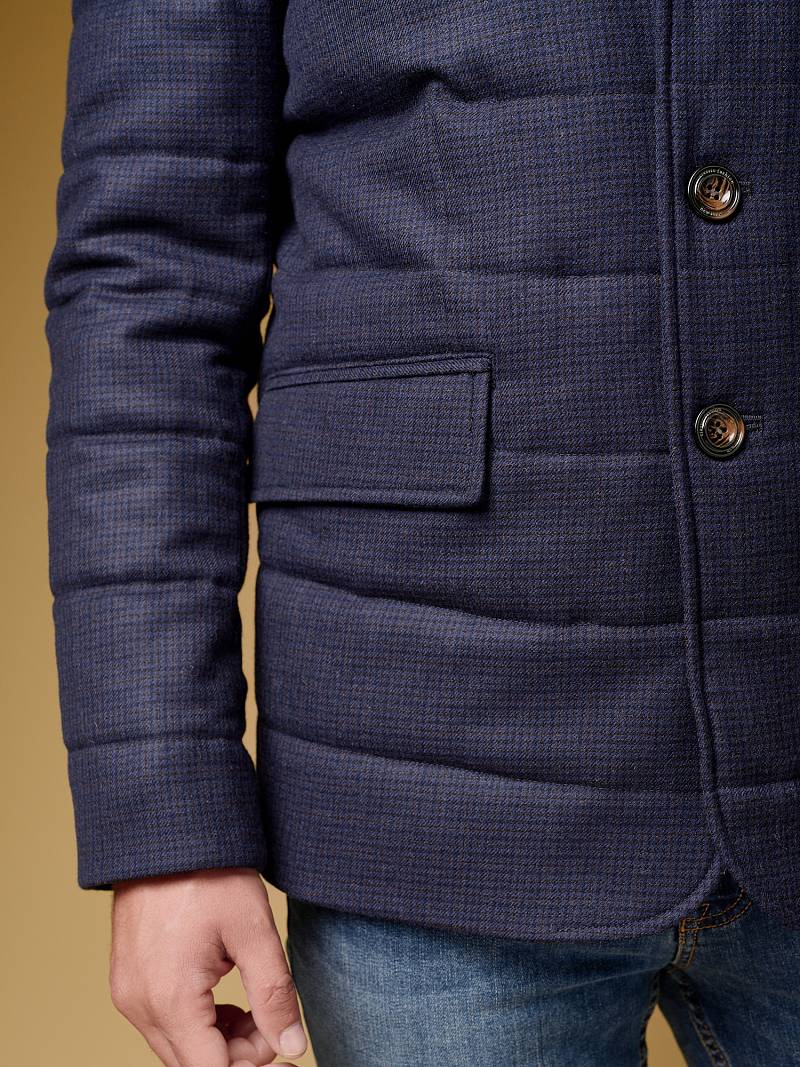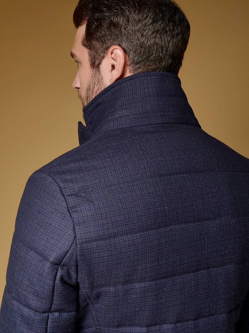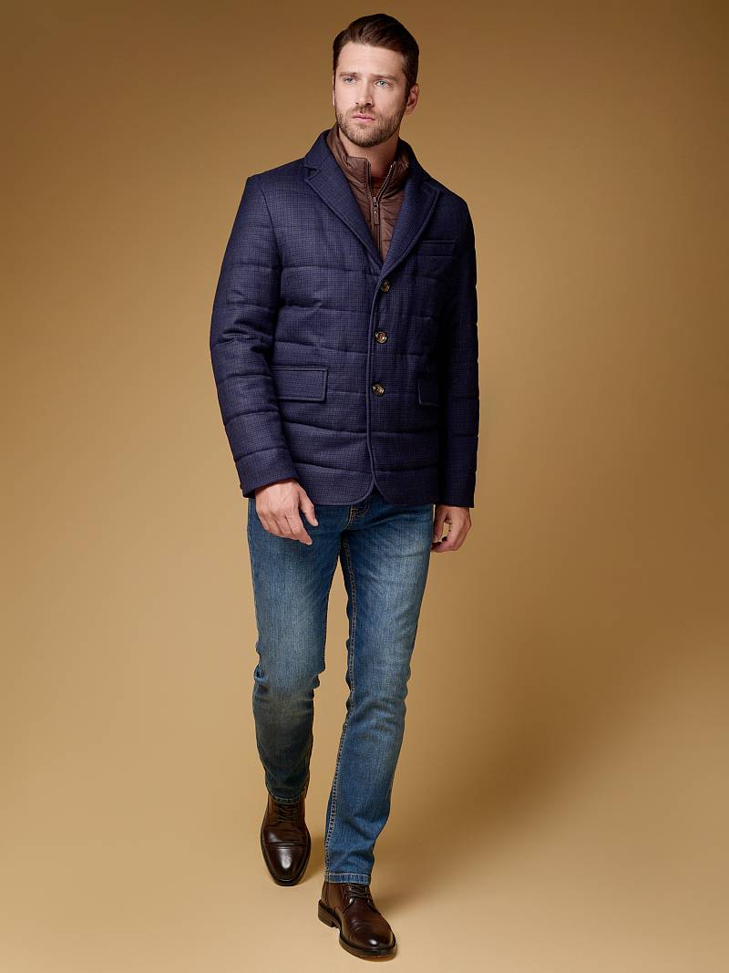 Куртка мужская утепленная из шерстяной ткани с английским воротником и со съемной манишкой. Манишка из пуходержащей ткани с водоотталкивающей пропиткой, защищает от ветра, холода и дождя. Застежка изделия на пуговицы. Полочки и спинка простеганы, на полочках - два кармана с клапанами на скрытых магнитах. Рукава втачные с локтевыми швами. На подкладке - два внутренних кармана на молнии для удобного хранения документов. Утеплитель в изделии характеризуется легким весом, гигиеничностью и гипоаллергенностью, высокими теплоизоляционными качествами, экологичностью и безопасностью. Рекомендуется обработать изделие водонепроницаемым аэрозолем для защиты от неблагоприятных погодных условий. Длина по спинке - 74см. Ткань верха: 100% шерсть. Подкладка: 100% полиэстер. Утеплитель: термоплюс 150гр./150гр.