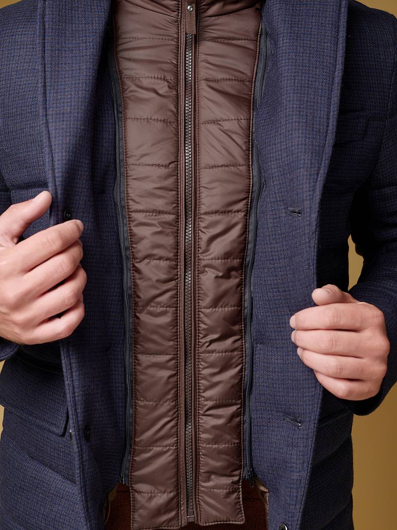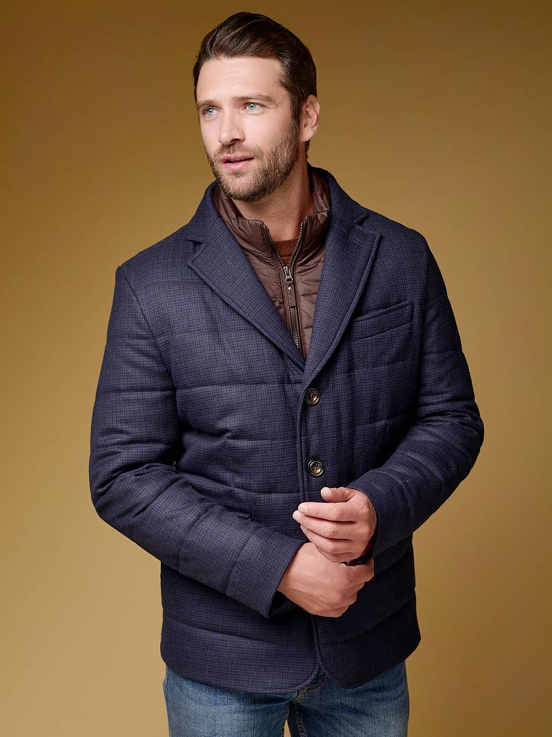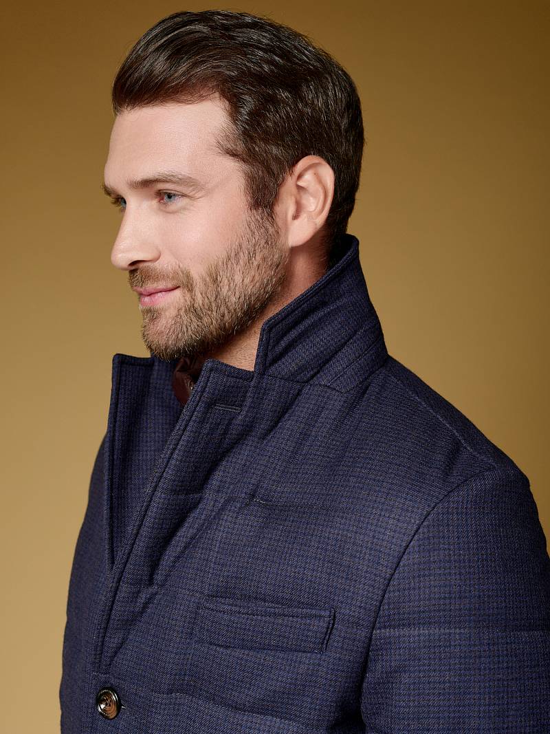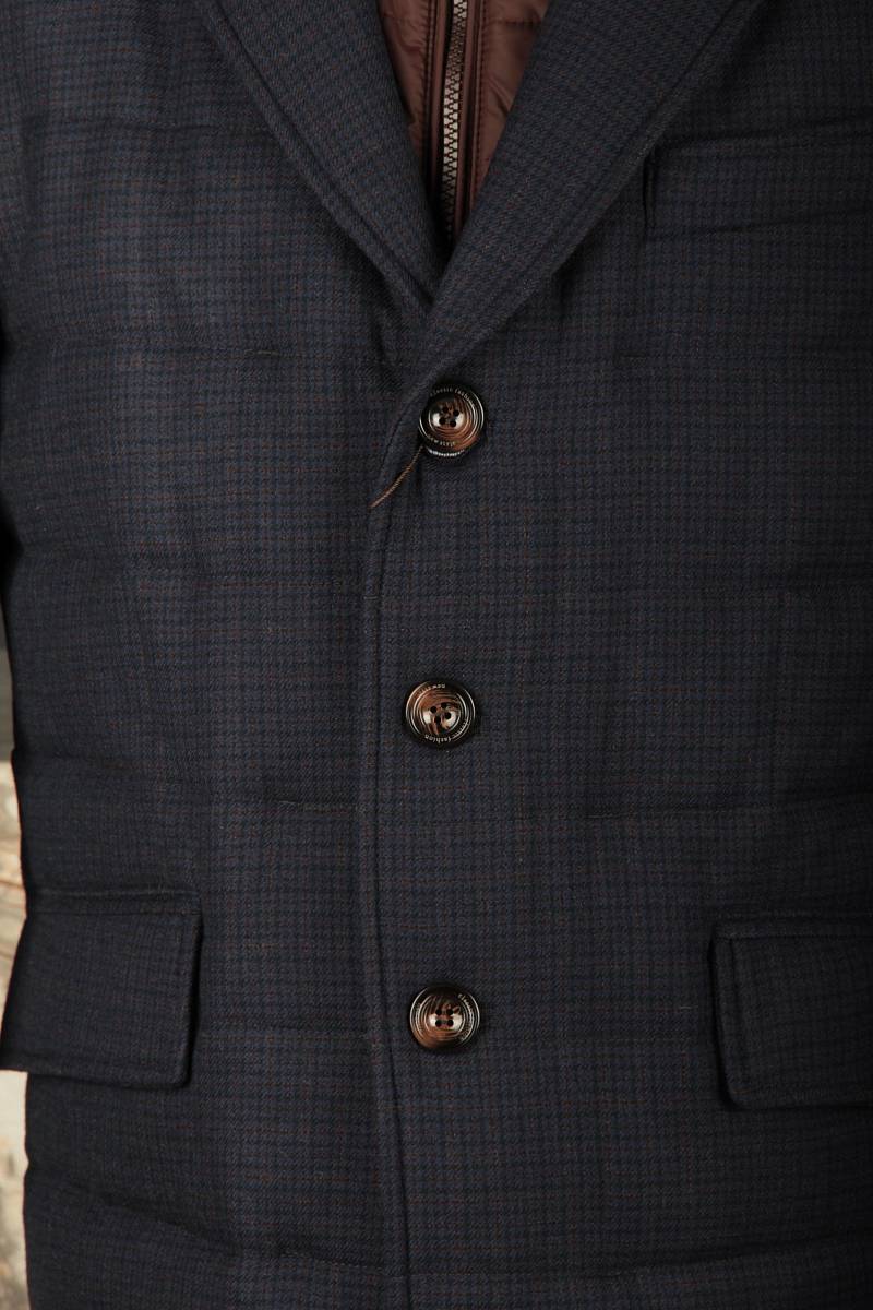 Куртка мужская утепленная из шерстяной ткани с английским воротником и со съемной манишкой. Манишка из пуходержащей ткани с водоотталкивающей пропиткой, защищает от ветра, холода и дождя. Застежка изделия на пуговицы. Полочки и спинка простеганы, на полочках - два кармана с клапанами на скрытых магнитах. Рукава втачные с локтевыми швами. На подкладке - два внутренних кармана на молнии для удобного хранения документов. Утеплитель в изделии характеризуется легким весом, гигиеничностью и гипоаллергенностью, высокими теплоизоляционными качествами, экологичностью и безопасностью. Рекомендуется обработать изделие водонепроницаемым аэрозолем для защиты от неблагоприятных погодных условий. Длина по спинке - 74см. Ткань верха: 100% шерсть. Подкладка: 100% полиэстер. Утеплитель: термоплюс 150гр./150гр.