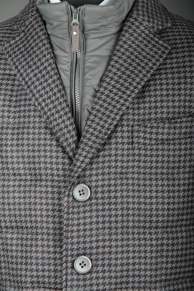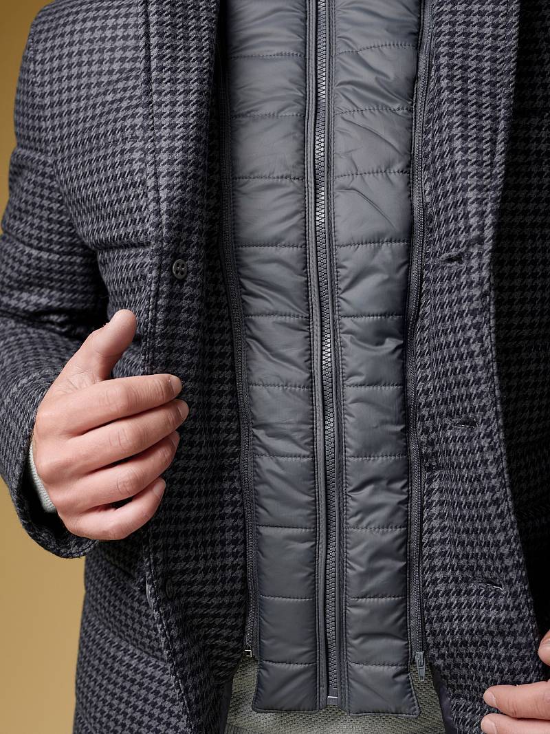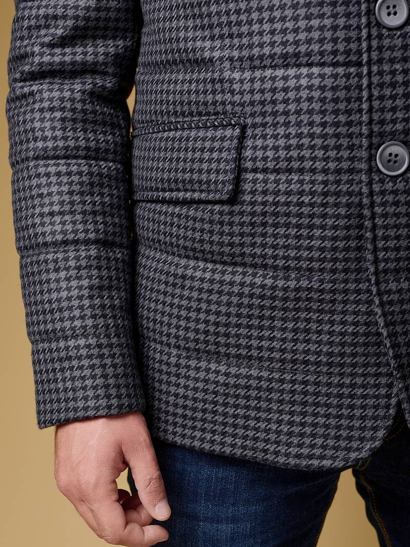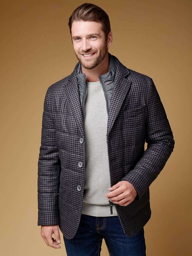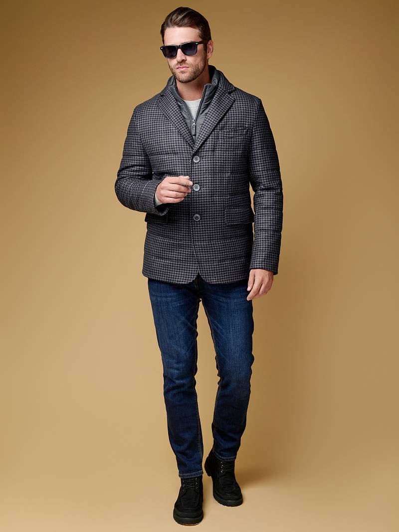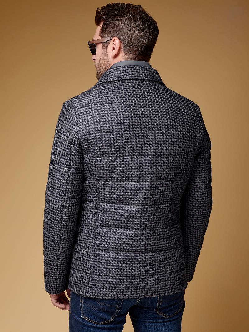 Куртка мужская утепленная из шерстяной ткани с английским воротником и со съемной манишкой. Манишка из пуходержащей ткани с водоотталкивающей пропиткой, защищает от ветра, холода и дождя. Застежка изделия на пуговицы. Полочки и спинка простеганы, на полочках - два кармана с клапанами на скрытых магнитах. Рукава втачные с локтевыми швами. На подкладке - два внутренних кармана на молнии для удобного хранения документов. Утеплитель в изделии характеризуется легким весом, гигиеничностью и гипоаллергенностью, высокими теплоизоляционными качествами, экологичностью и безопасностью. Рекомендуется обработать изделие водонепроницаемым аэрозолем для защиты от неблагоприятных погодных условий. Длина по спинке - 74см. Ткань верха: 100% шерсть. Подкладка: 100% полиэстер. Утеплитель: термоплюс 150гр./150гр.