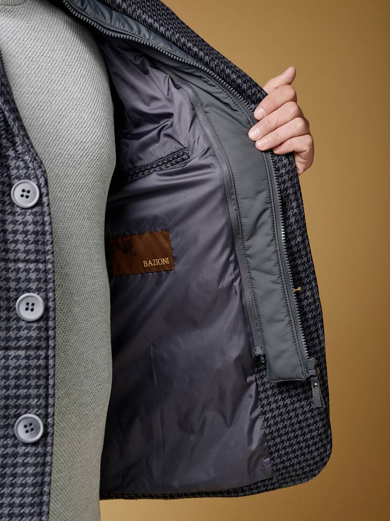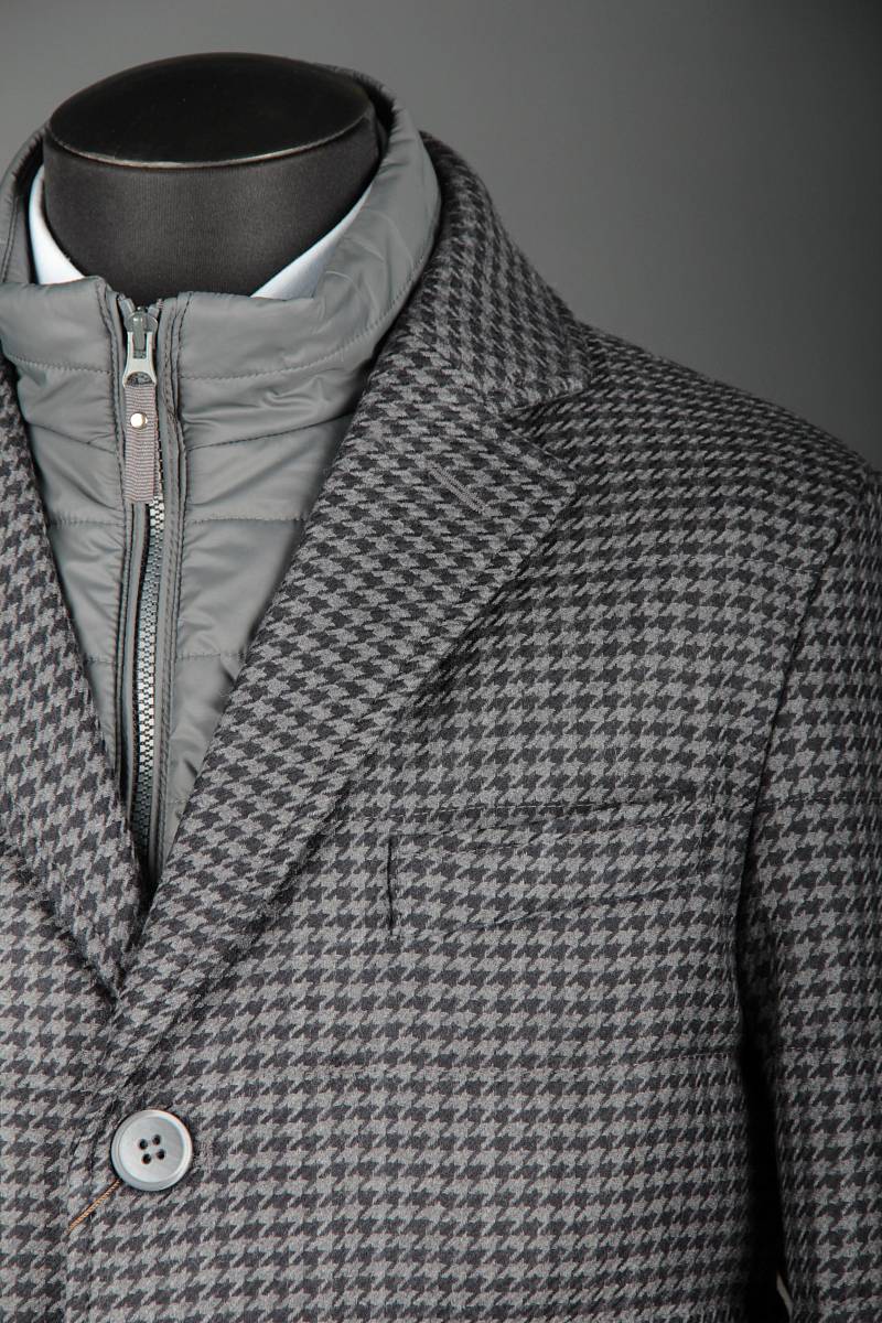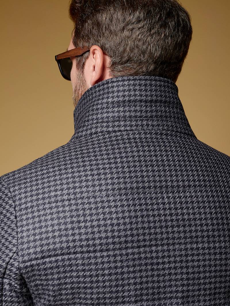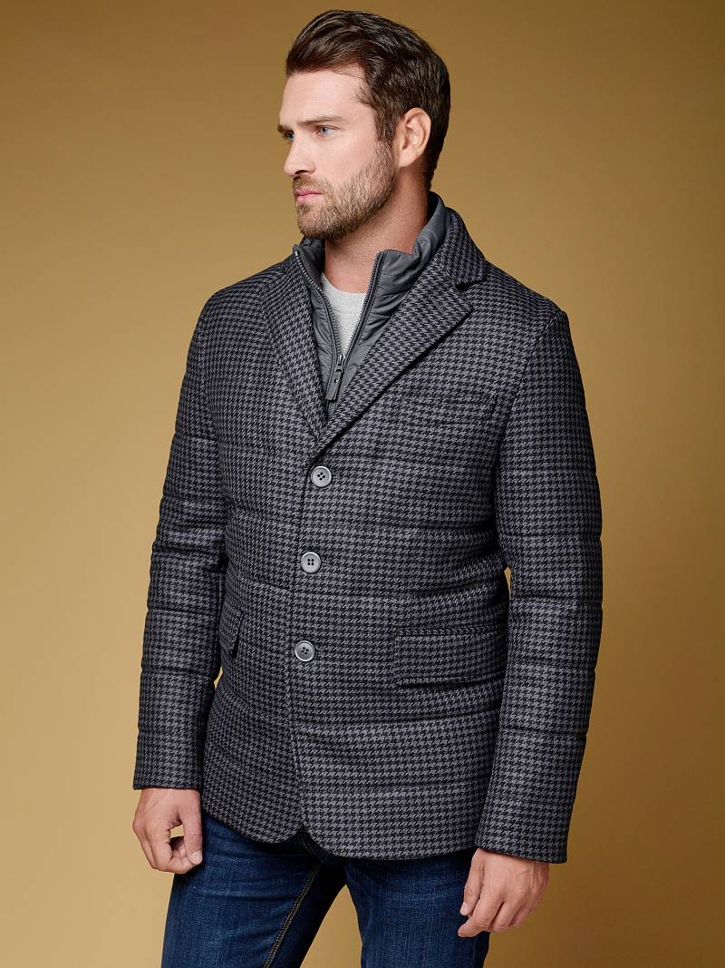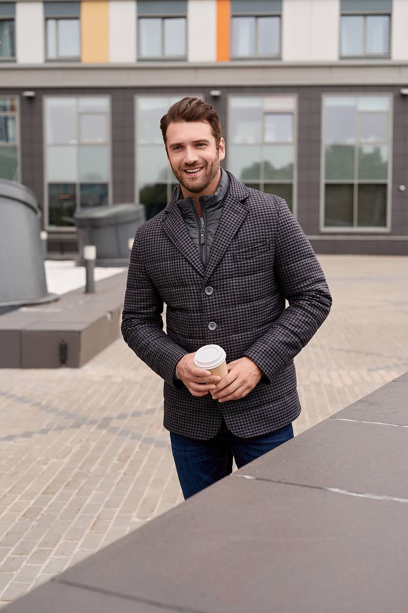 Куртка мужская утепленная из шерстяной ткани с английским воротником и со съемной манишкой. Манишка из пуходержащей ткани с водоотталкивающей пропиткой, защищает от ветра, холода и дождя. Застежка изделия на пуговицы. Полочки и спинка простеганы, на полочках - два кармана с клапанами на скрытых магнитах. Рукава втачные с локтевыми швами. На подкладке - два внутренних кармана на молнии для удобного хранения документов. Утеплитель в изделии характеризуется легким весом, гигиеничностью и гипоаллергенностью, высокими теплоизоляционными качествами, экологичностью и безопасностью. Рекомендуется обработать изделие водонепроницаемым аэрозолем для защиты от неблагоприятных погодных условий. Длина по спинке - 74см. Ткань верха: 100% шерсть. Подкладка: 100% полиэстер. Утеплитель: термоплюс 150гр./150гр.