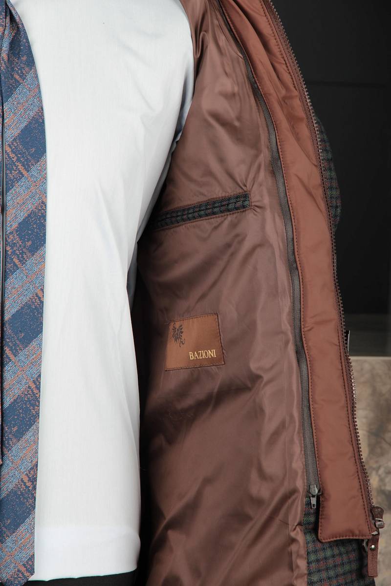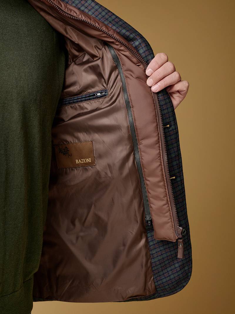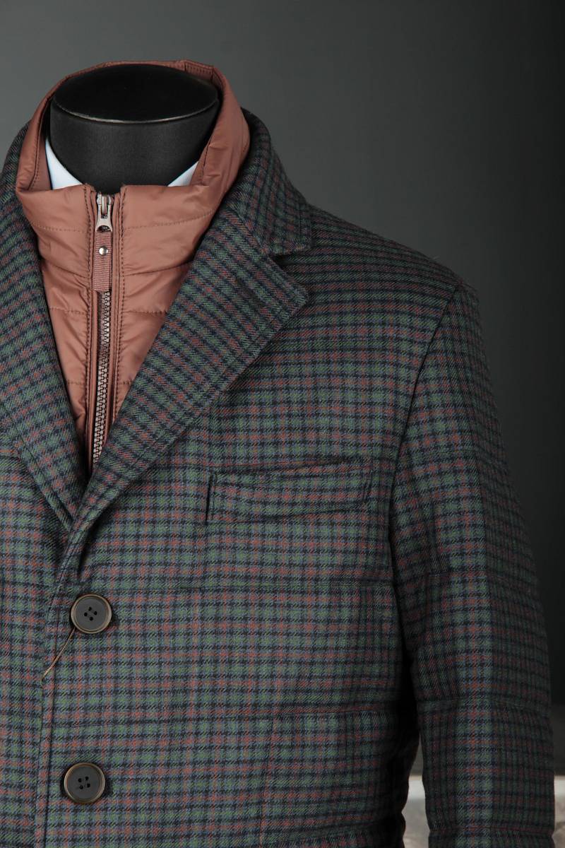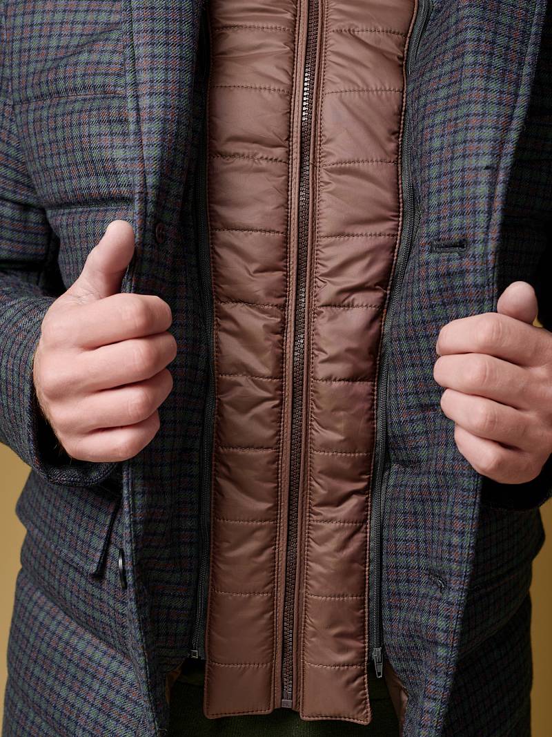 Куртка мужская утепленная из шерстяной ткани с английским воротником и со съемной манишкой. Манишка из пуходержащей ткани с водоотталкивающей пропиткой, защищает от ветра, холода и дождя. Застежка изделия на пуговицы. Полочки и спинка простеганы, на полочках - два кармана с клапанами на скрытых магнитах. Рукава втачные с локтевыми швами. На подкладке - два внутренних кармана на молнии для удобного хранения документов. Утеплитель в изделии характеризуется легким весом, гигиеничностью и гипоаллергенностью, высокими теплоизоляционными качествами, экологичностью и безопасностью. Рекомендуется обработать изделие водонепроницаемым аэрозолем для защиты от неблагоприятных погодных условий. Длина по спинке - 74см. Ткань верха: 100% шерсть. Подкладка: 100% полиэстер. Утеплитель: термоплюс 150гр./150гр.