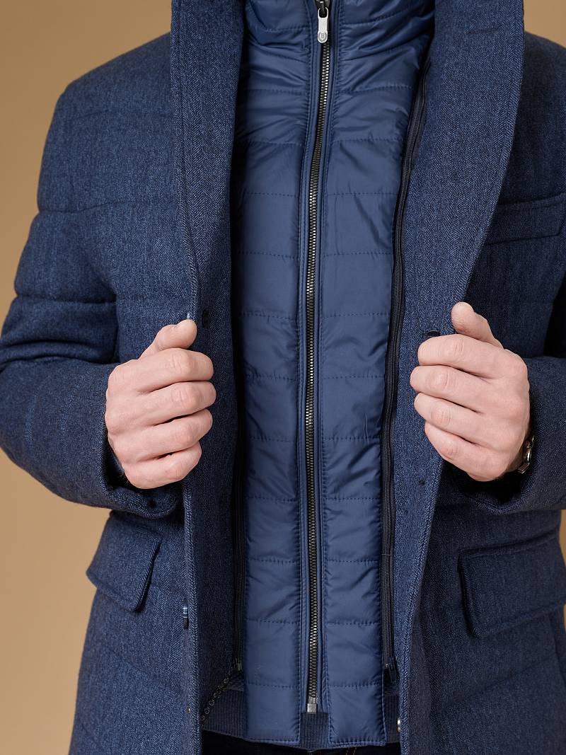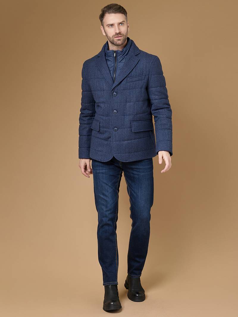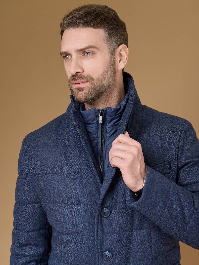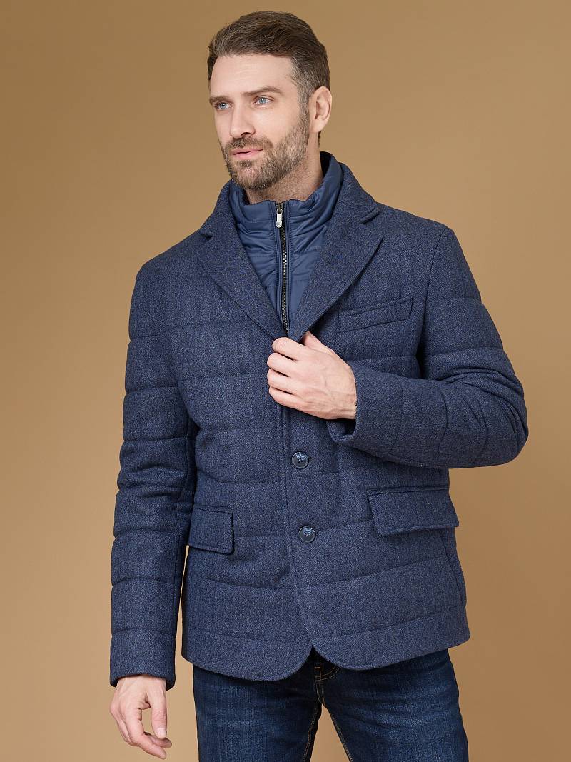 Куртка мужская утепленная из шерстяной ткани с английским воротником и со съемной манишкой. Манишка из пуходержащей ткани с водоотталкивающей пропиткой, защищает от ветра, холода и дождя. Застежка изделия на пуговицы. Полочки и спинка простеганы, на полочках - множество карманов: два кармана с клапанами на скрытых магнитах и два кармана -листочки с вертикальным боковым входом. Рукава втачные с локтевыми швами. На подкладке - два внутренних кармана на молнии для удобного хранения документов. Утеплитель в изделии характеризуется легким весом, гигиеничностью и гипоаллергенностью, высокими теплоизоляционными качествами, экологичностью и безопасностью. Рекомендуется обработать изделие водонепроницаемым аэрозолем для защиты от неблагоприятных погодных условий. Длина по спинке - 74см. Ткань верха: 100% шерсть. Подкладка: 100% полиэстер. Утеплитель: термоплюс 150гр./150гр.