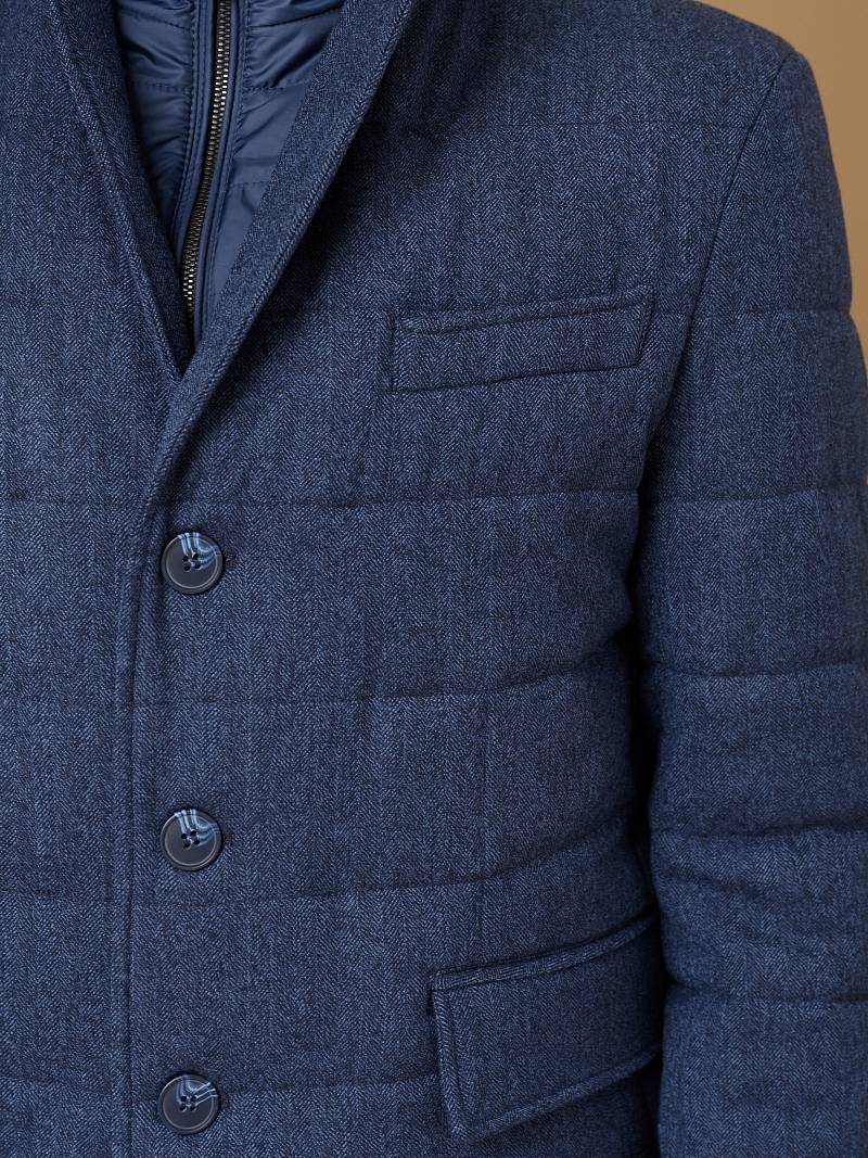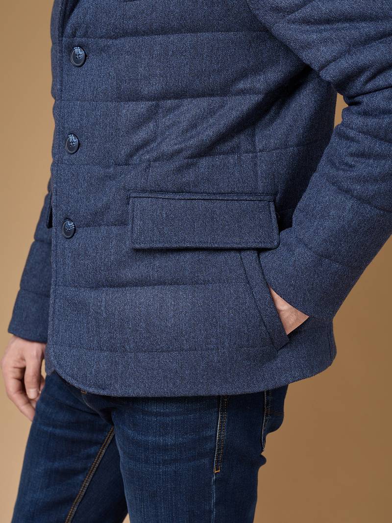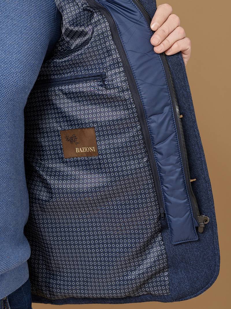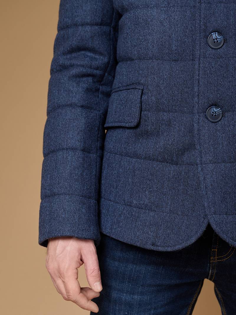 Куртка мужская утепленная из шерстяной ткани с английским воротником и со съемной манишкой. Манишка из пуходержащей ткани с водоотталкивающей пропиткой, защищает от ветра, холода и дождя. Застежка изделия на пуговицы. Полочки и спинка простеганы, на полочках - множество карманов: два кармана с клапанами на скрытых магнитах и два кармана -листочки с вертикальным боковым входом. Рукава втачные с локтевыми швами. На подкладке - два внутренних кармана на молнии для удобного хранения документов. Утеплитель в изделии характеризуется легким весом, гигиеничностью и гипоаллергенностью, высокими теплоизоляционными качествами, экологичностью и безопасностью. Рекомендуется обработать изделие водонепроницаемым аэрозолем для защиты от неблагоприятных погодных условий. Длина по спинке - 74см. Ткань верха: 100% шерсть. Подкладка: 100% полиэстер. Утеплитель: термоплюс 150гр./150гр.