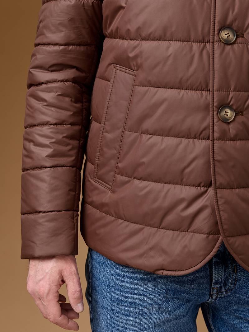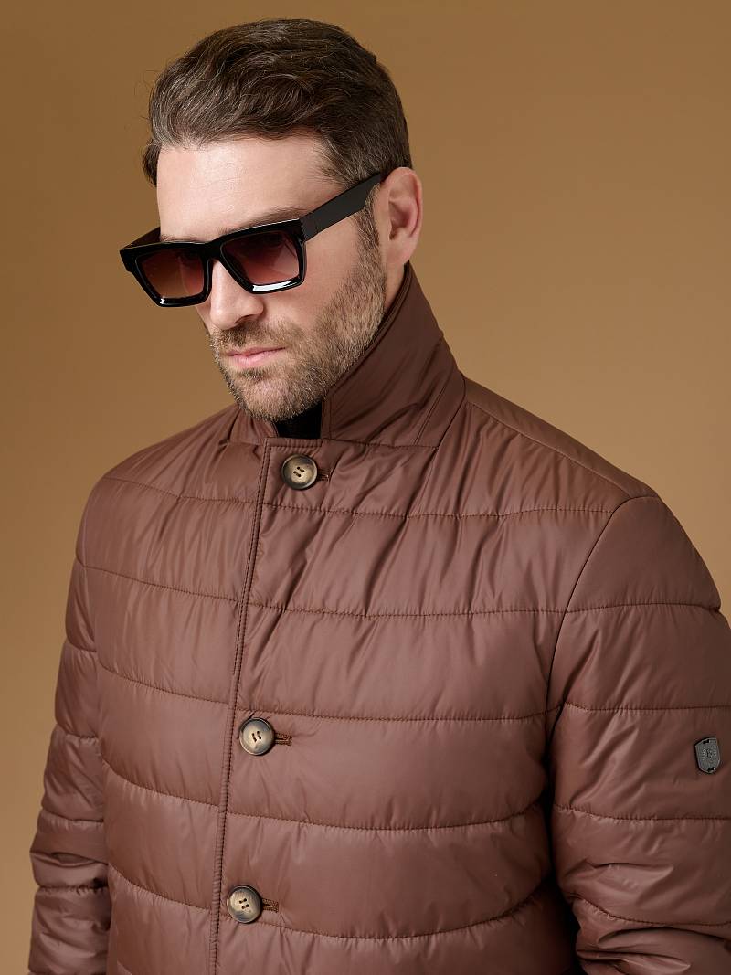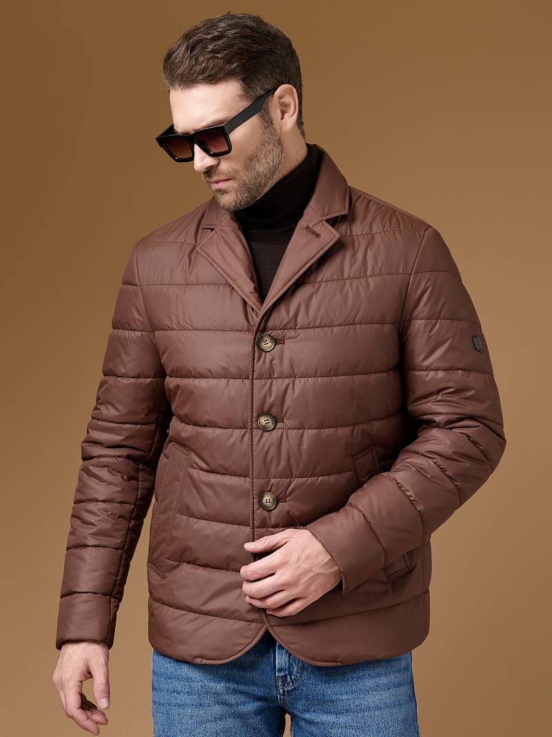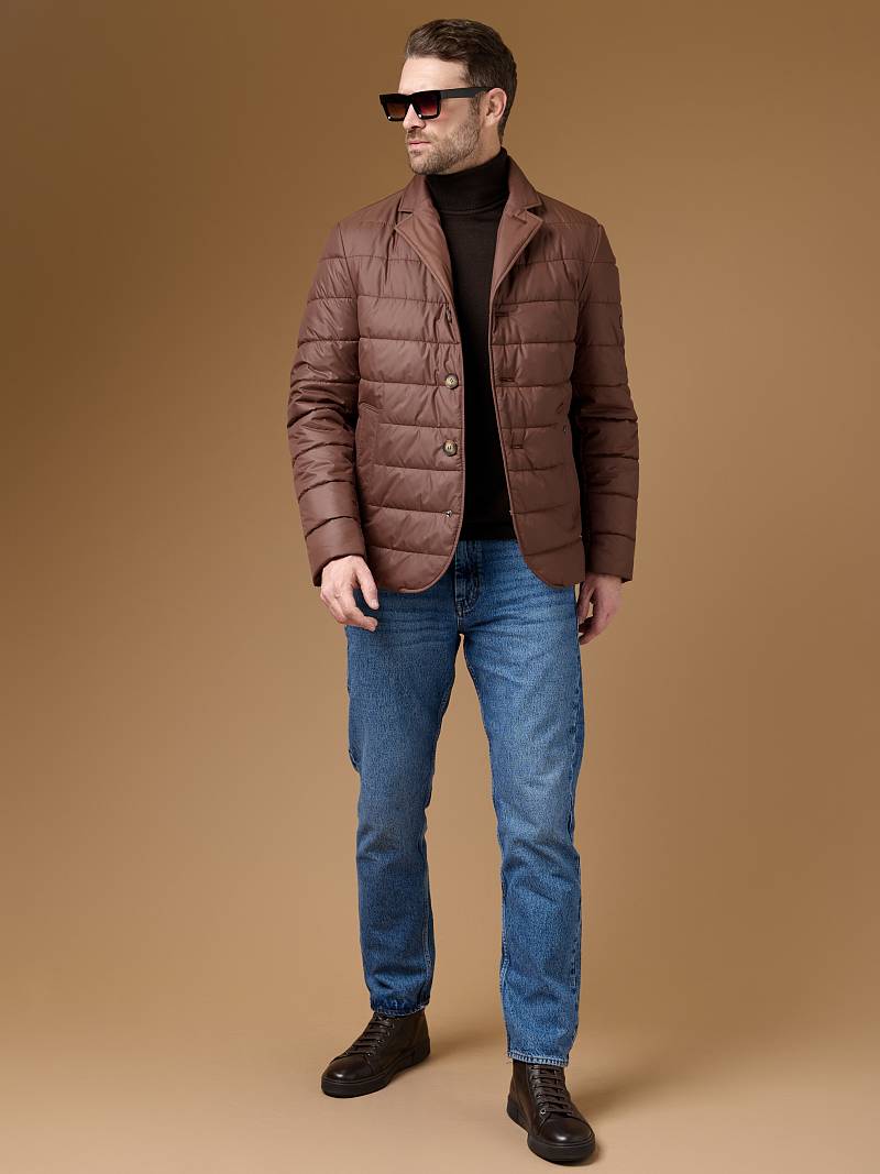 Куртка-пиджак мужская простеганая из курточной ткани. Инновационная пуходержащая ткань верха с обработкой wr, cire (ветро и влаго защита). - мягкая, легкая, практичная, не мнется. Изделие с отложным воротником пиджачного типа с лацканами. Застежка куртки -пиджака на пуговицы. На полочках - прорезные боковые карманы с листочками на скрытых магнитах. Спинка без среднего шва. Рукава с локтевыми швами. Инновационная внутренняя подкладка с защитой от миграции волокон, на подкладке - два вместительных кармана для документов. Утеплитель антиаллергенный термоплюс 150гр /150гр. не теряет своих свойств после химчистки и стирки. Длина по спинке для размера 50/176 - 90см. Ткань верха: 100%по