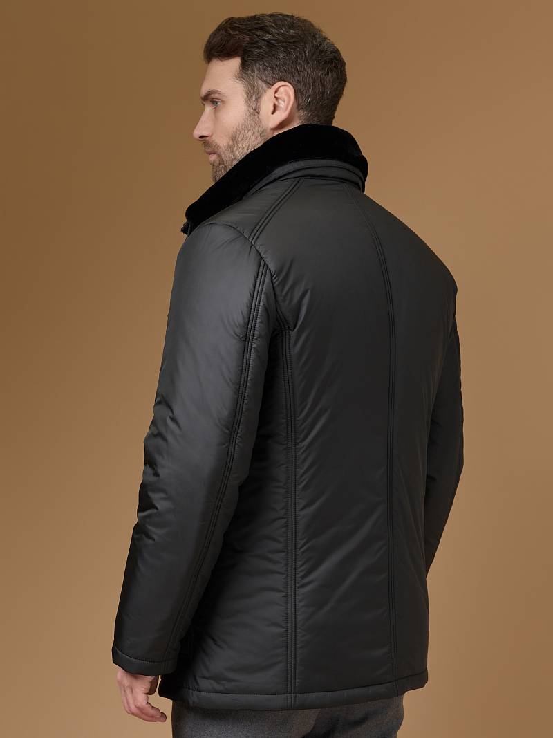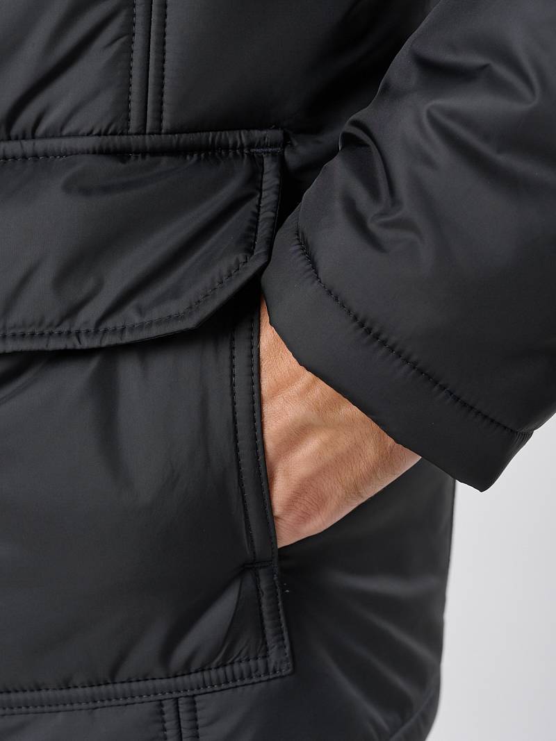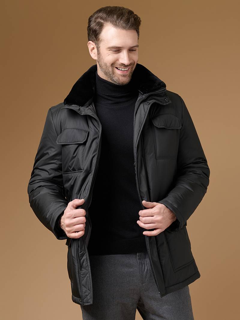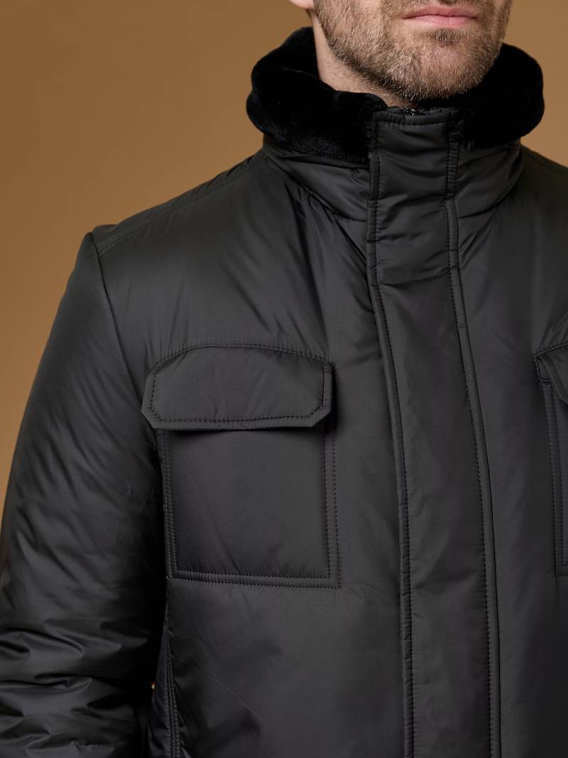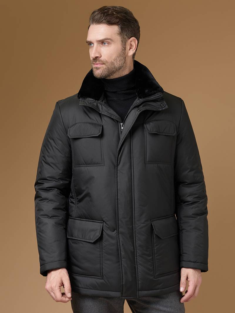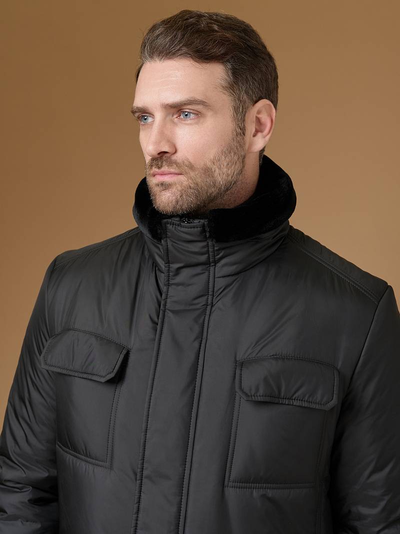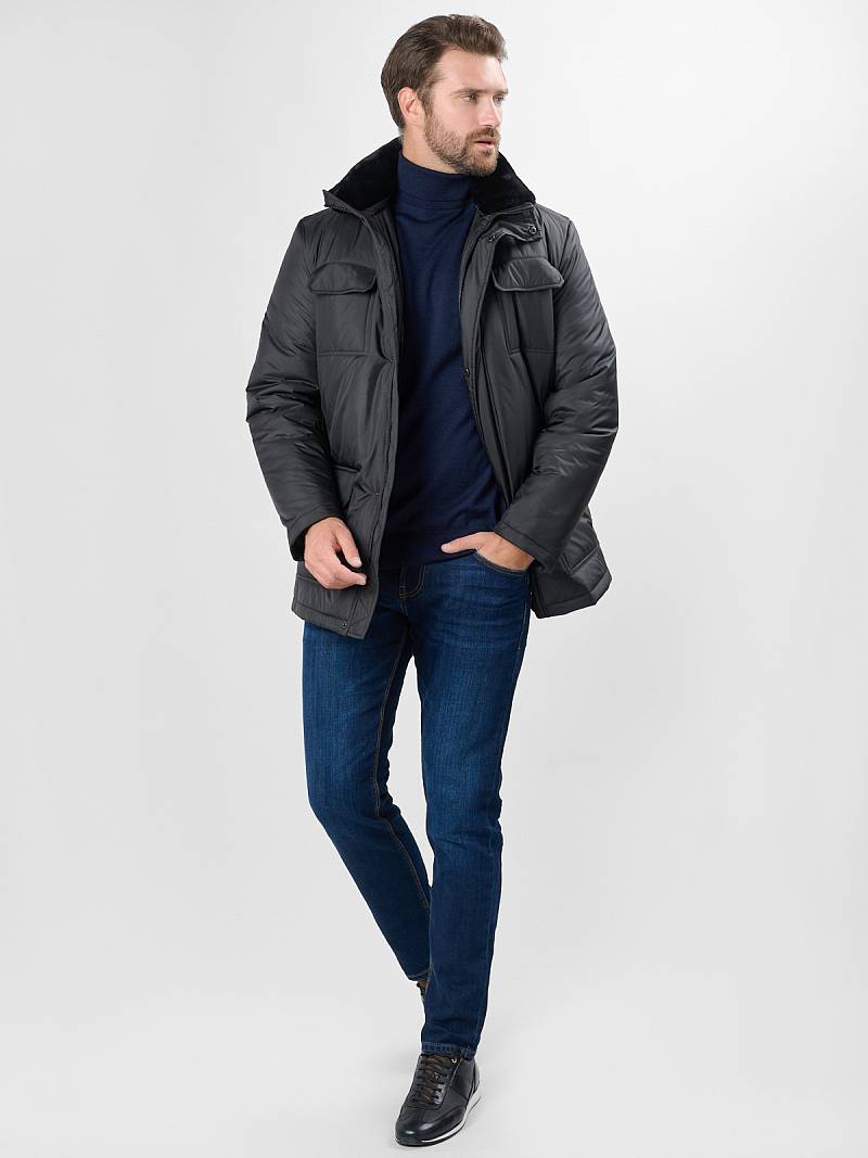 Куртка мужская утепленная с отстегивающимся меховым воротником-стойка, застежка на молнию и 5 потайных кнопок. На полочке - два верхних кармана с клапанами- имитирующих накладные и два нижних накладных кармана с клапанами. Спинка со средним швом. Рукава втачные с локтевыми швами. Длина по спинке-80см. Ткань верха: 100%полиэстер. Подкладка: 100%полиэстер. Утеплитель: термоплюс 260гр/200гр. Воротник: мех.