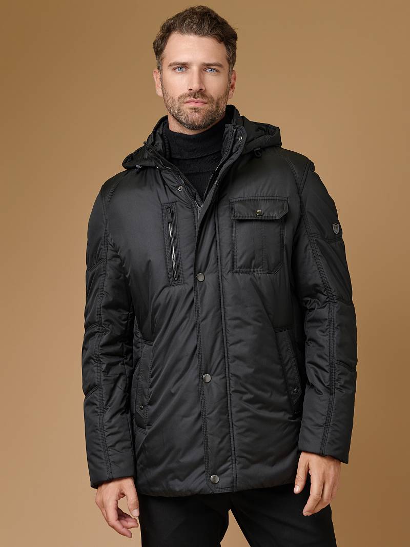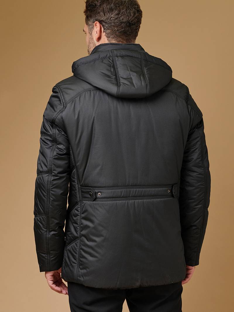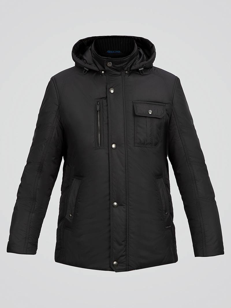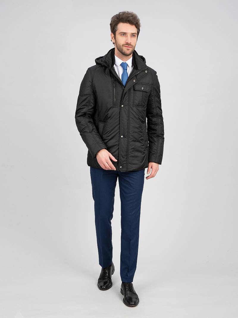 Куртка мужская утепленная с капюшоном. Воротник-стойка, нижний воротник - из трикотажа. На полочках - два верхних кармана и два нижних прорезных кармана. По спинке на талии - настрочная деталь с патами на кнопках. На полочках и спинке - отделочные строчки, имитирующие фигурные кокетки. На рукавах - также проложены отделочные строчки, которые придают рукавам эффект стежки. Длина изделия по спинке для роста 176 - 78см. Ткань верха: 100%полиэстер. Подкладка: 100%полиэстер. Утеплитель: термоплюс 200гр