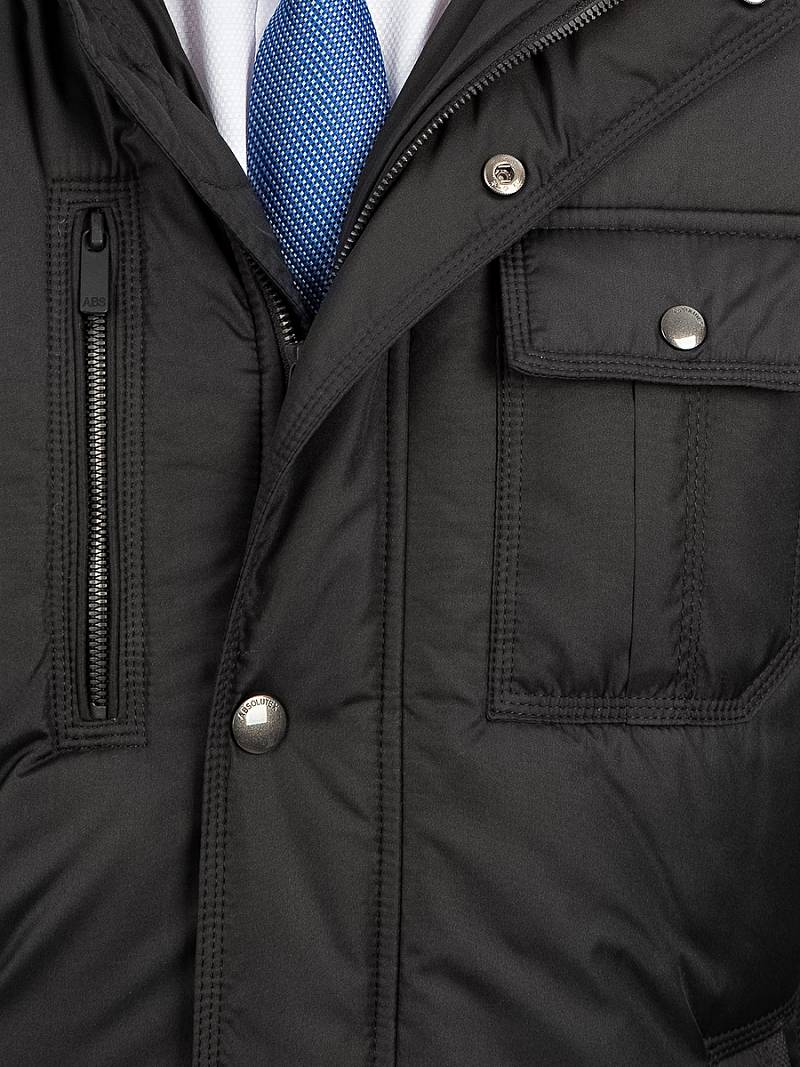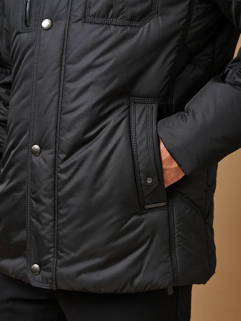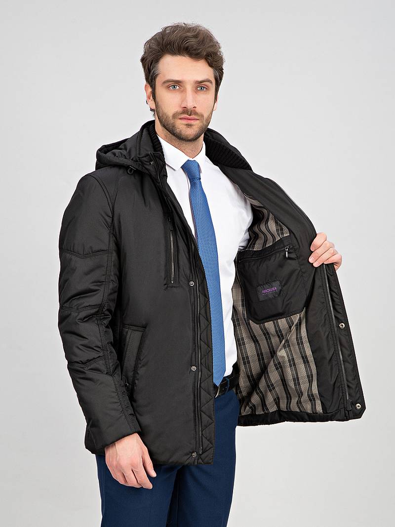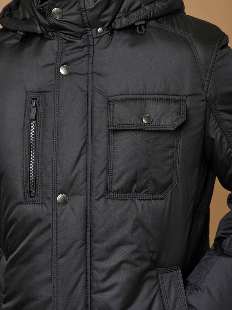 Куртка мужская утепленная с капюшоном. Воротник-стойка, нижний воротник - из трикотажа. На полочках - два верхних кармана и два нижних прорезных кармана. По спинке на талии - настрочная деталь с патами на кнопках. На полочках и спинке - отделочные строчки, имитирующие фигурные кокетки. На рукавах - также проложены отделочные строчки, которые придают рукавам эффект стежки. Длина изделия по спинке для роста 176 - 78см. Ткань верха: 100%полиэстер. Подкладка: 100%полиэстер. Утеплитель: термоплюс 200гр