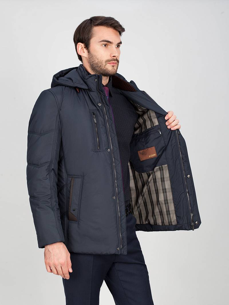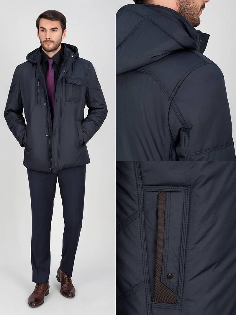 Куртка мужская утепленная с капюшоном. Воротник-стойка, нижний воротник - из трикотажа. На полочках - два верхних кармана и два нижних прорезных кармана. По спинке на талии - настрочная деталь с патами на кнопках. На полочках и спинке - отделочные строчки, имитирующие фигурные кокетки. На рукавах - также проложены отделочные строчки, которые придают рукавам эффект стежки. Длина изделия по спинке для роста 176 - 78см. Ткань верха: 100%полиэстер. Подкладка: 100%полиэстер. Утеплитель: термоплюс 200гр