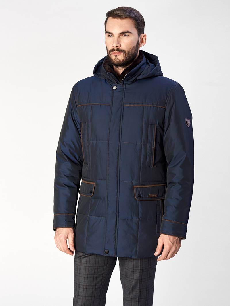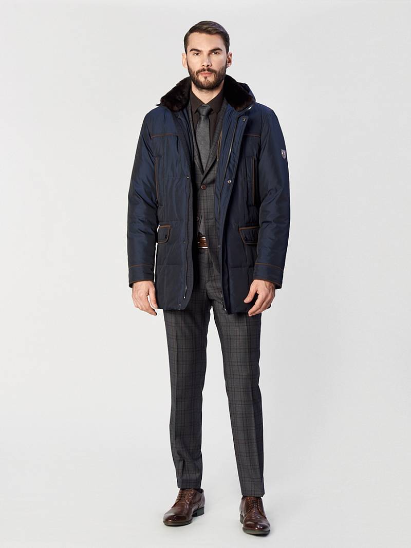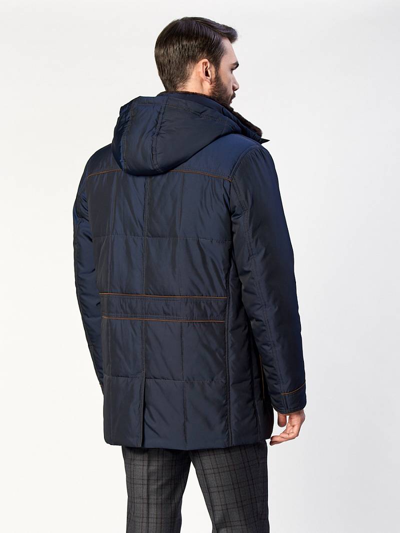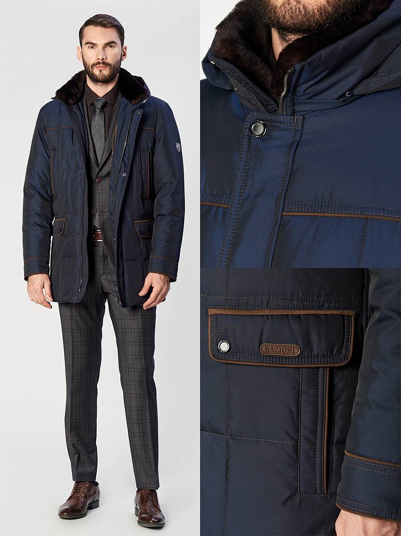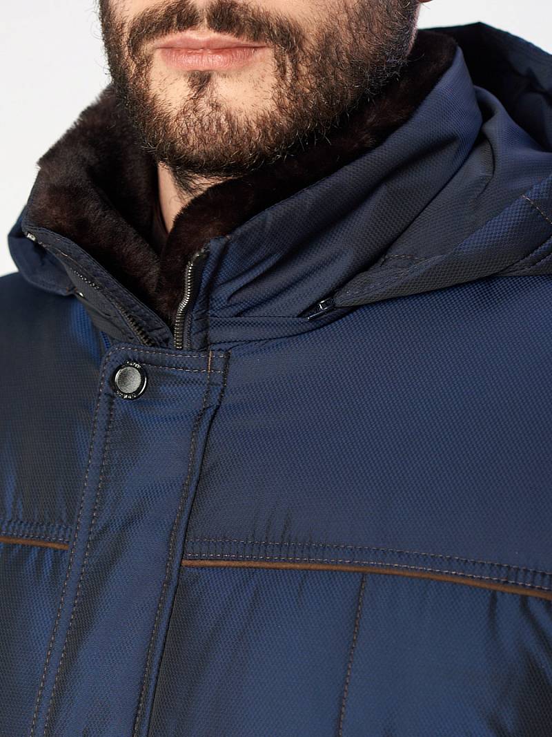 Куртка мужская утепленная с капюшоном из плащевой ткани, со съемным натуральным меховым воротником из мутона, воротник - стойка. с центральной застежкой на молнию и ветрозащитную планку на 4 кнопки. Простеганные полочки и спинка- с кокетками и бочками. На полочках - верхние карманы с листочками на молниях и два нижних боковых кармана: 1- с клапаном, 2-ой - с листочкой. Спинка -в нижней части срежнего шва спинки- шлица на 2-х кнопках. По талии спинки-притачная кулиса. Рукава втачные с локтевыми швами. По швам притачивания кокеток, краю листочек, клапанов, по низу рукавов, по кулисе на спинке - объемный отделочный кант. На подкладке - два внутренних кармана на молнии с листочками. Длина по спинке для размера 50/176 - 80см Ткань верха: 100% полиэстер. Подкладка: 100% полиэстер. Утеплитель: Био-пух 100% (250гр). Воротник-мех натуральный "мутон"