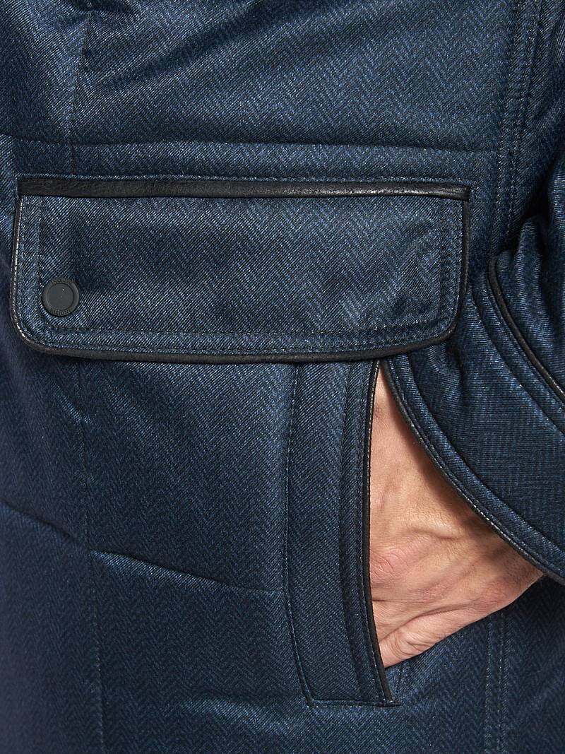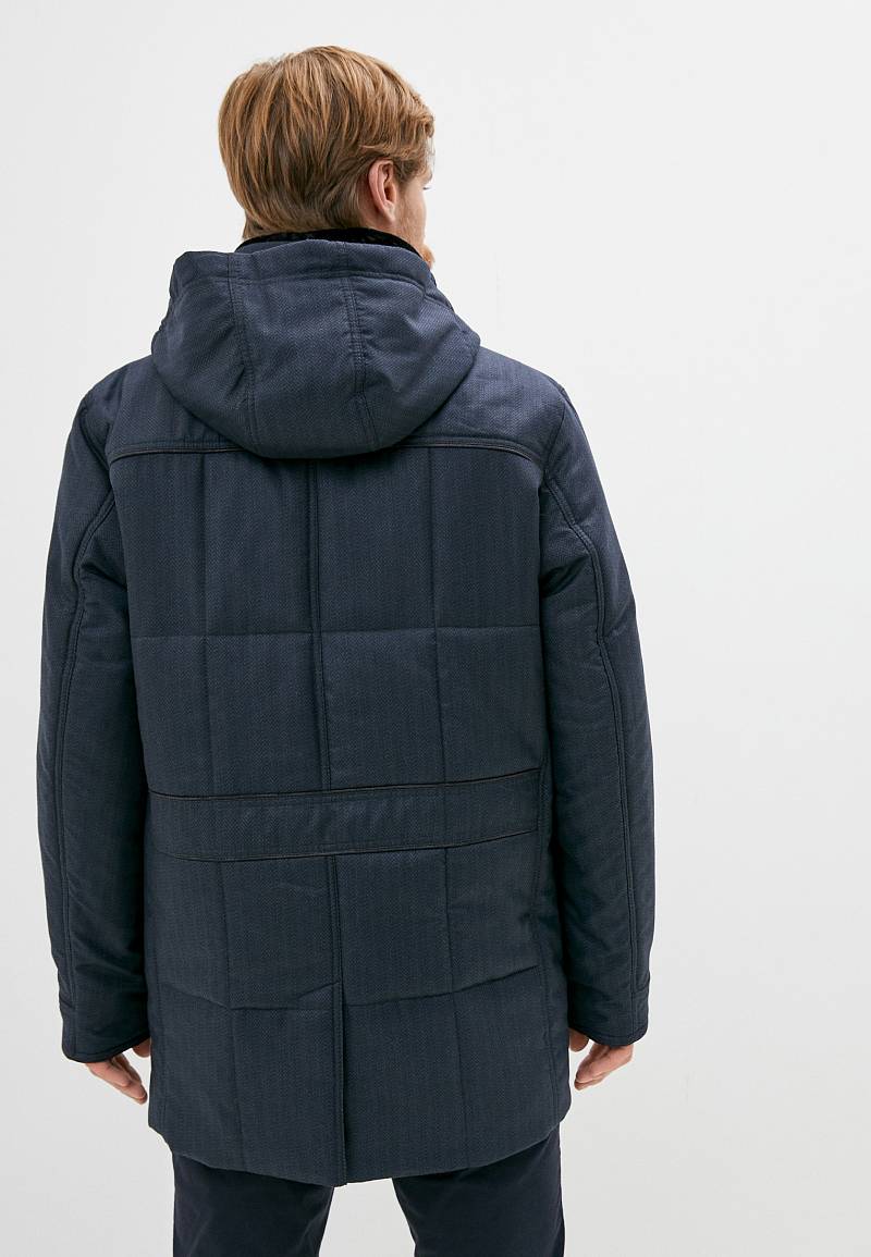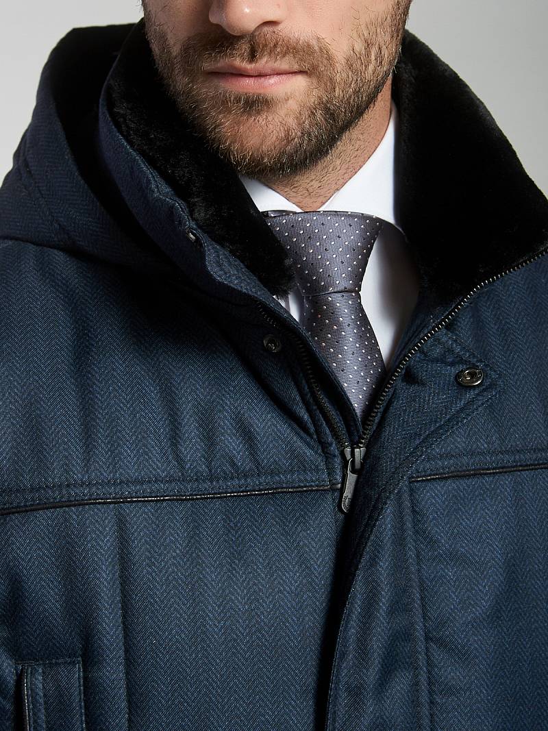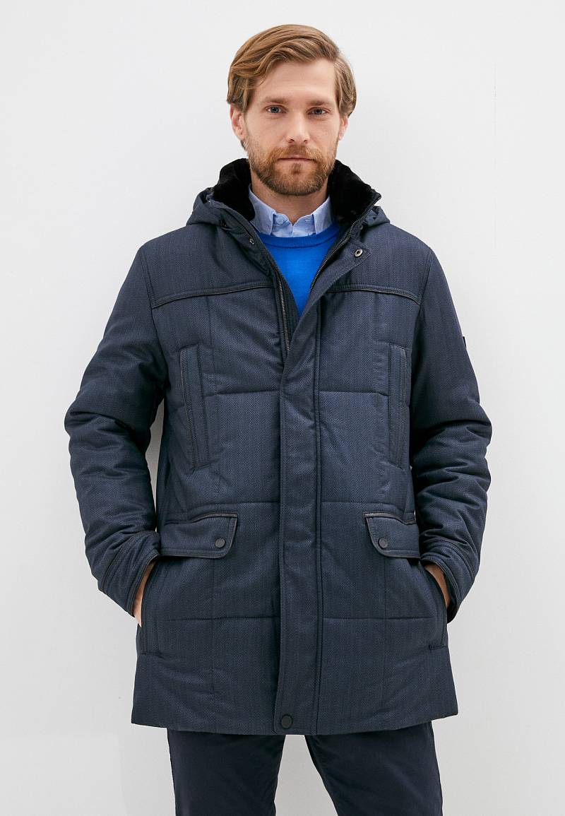 Куртка мужская утепленная с капюшоном из плащевой ткани с центральной застежкой на молнию и ветрозащитную планку на 4 кнопки. Воротник - стойка, также есть меховой пристегивающийся воротник. Простеганные полочки и спинка- с кокетками и бочками. На полочках - верхние карманы с листочками на молниях и два нижних боковых кармана: 1- с клапаном, 2-ой - с листочкой. В нижней части средlнего шва спинки- шлица на 2-х кнопках. По талии спинки-притачная кулиса, регулирующая кнопками. Рукава втачные с локтевыми швами. По швам притачивания кокеток, краю листочек, клапанов, по низу рукавов, по кулисе на спинке - объемный отделочный кант. На подкладке - два внутренних кармана с листочками. Длина по спинке-80см. Ткань верха: 60%шерсть, 40%полиэстер. Подкладка: 100%полиэстер. Утеплитель: термоплюс 200гр./200гр. Воротник: мех