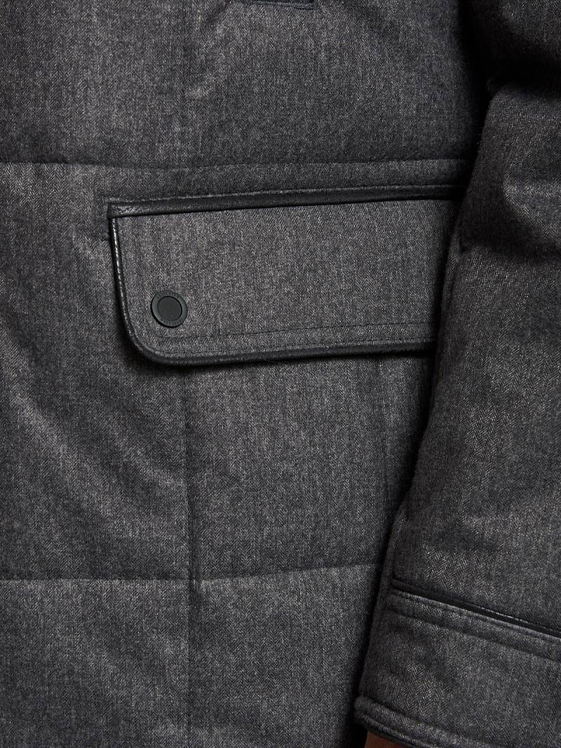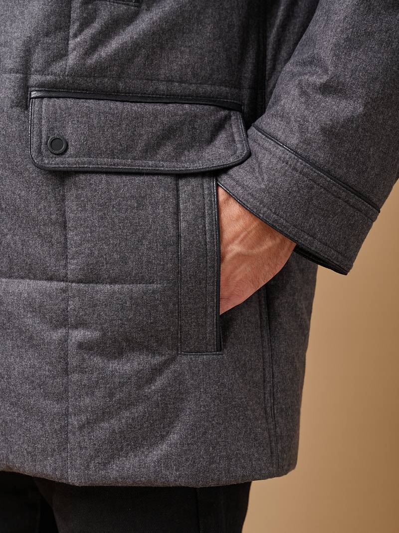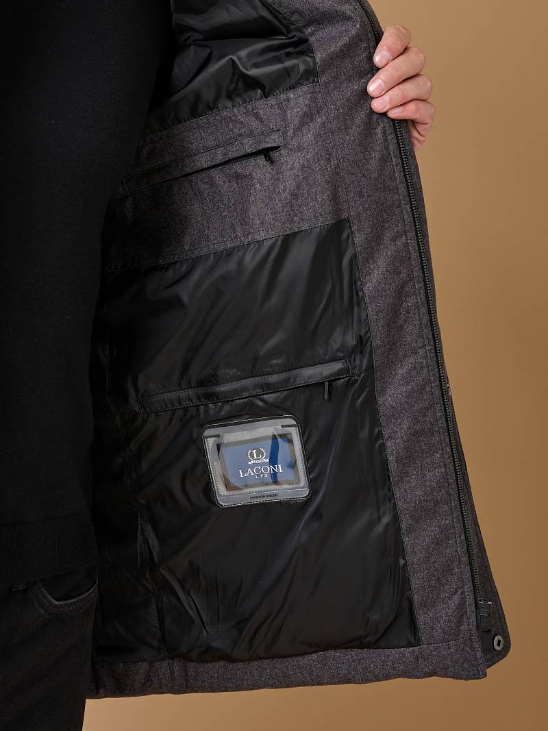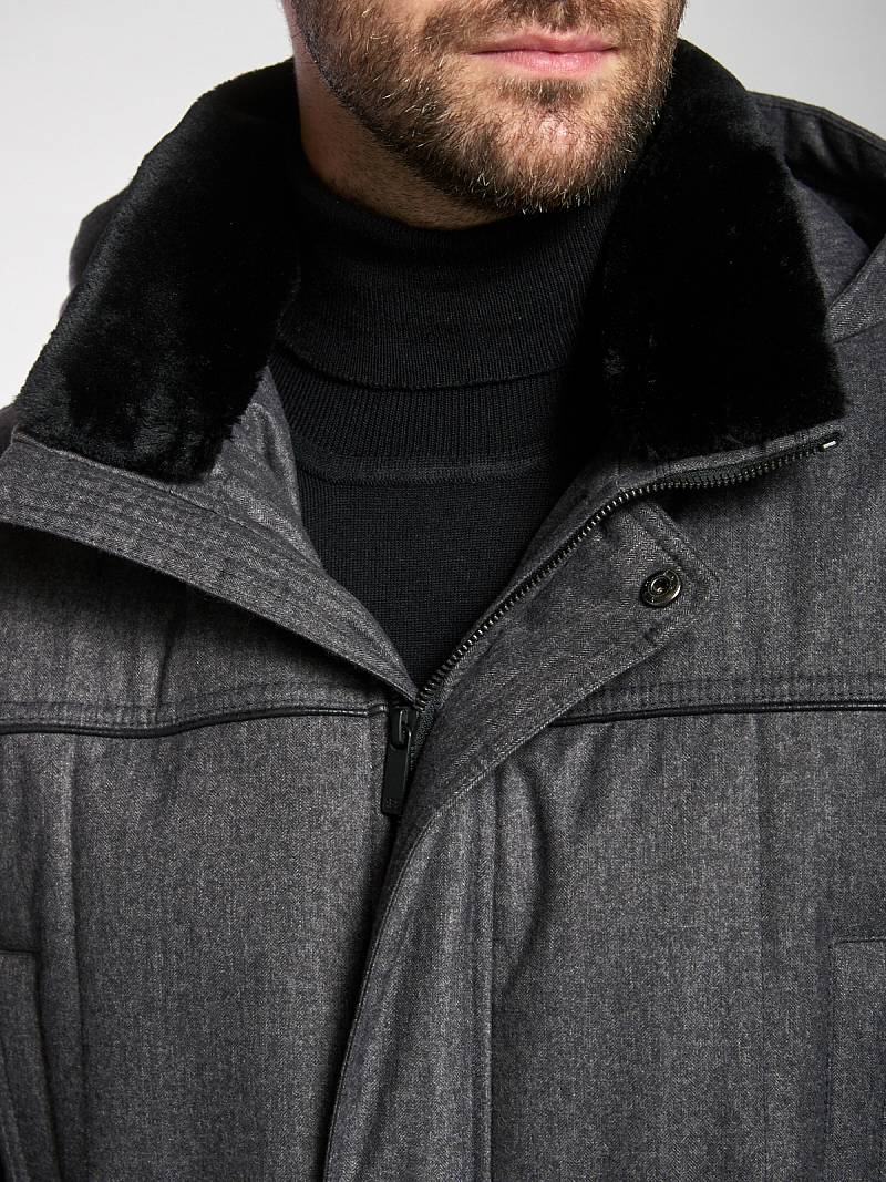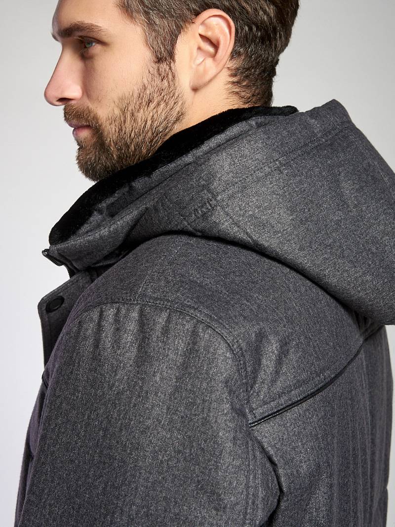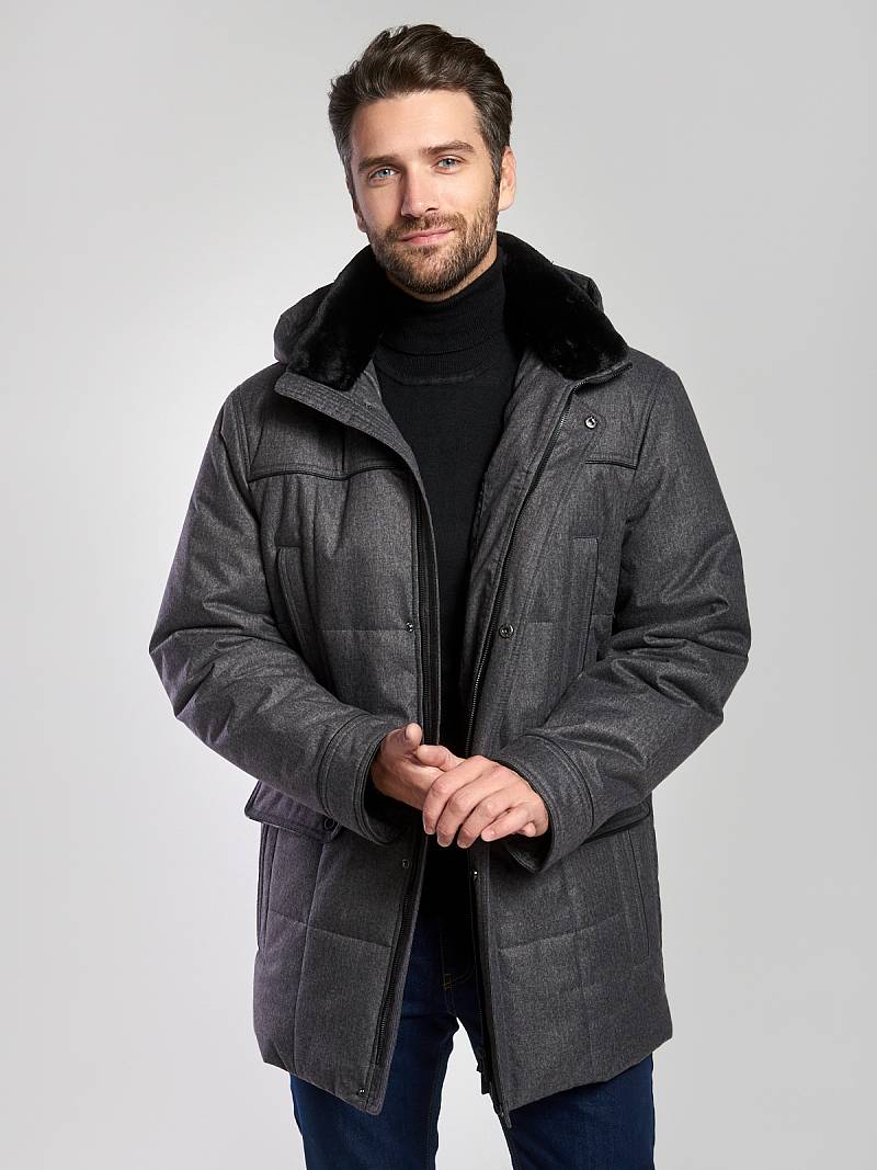 Куртка мужская утепленная с капюшоном из плащевой ткани с центральной застежкой на молнию и ветрозащитную планку на 4 кнопки. Воротник - стойка, также есть меховой пристегивающийся воротник. Простеганные полочки и спинка- с кокетками и бочками. На полочках - верхние карманы с листочками на молниях и два нижних боковых кармана: 1- с клапаном, 2-ой - с листочкой. В нижней части средlнего шва спинки- шлица на 2-х кнопках. По талии спинки-притачная кулиса, регулирующая кнопками. Рукава втачные с локтевыми швами. По швам притачивания кокеток, краю листочек, клапанов, по низу рукавов, по кулисе на спинке - объемный отделочный кант. На подкладке - два внутренних кармана с листочками. Длина по спинке-80см. Ткань верха: 60%шерсть, 40%полиэстер. Подкладка: 100%полиэстер. Утеплитель: термоплюс 200гр/200гр.. Воротник: мех
