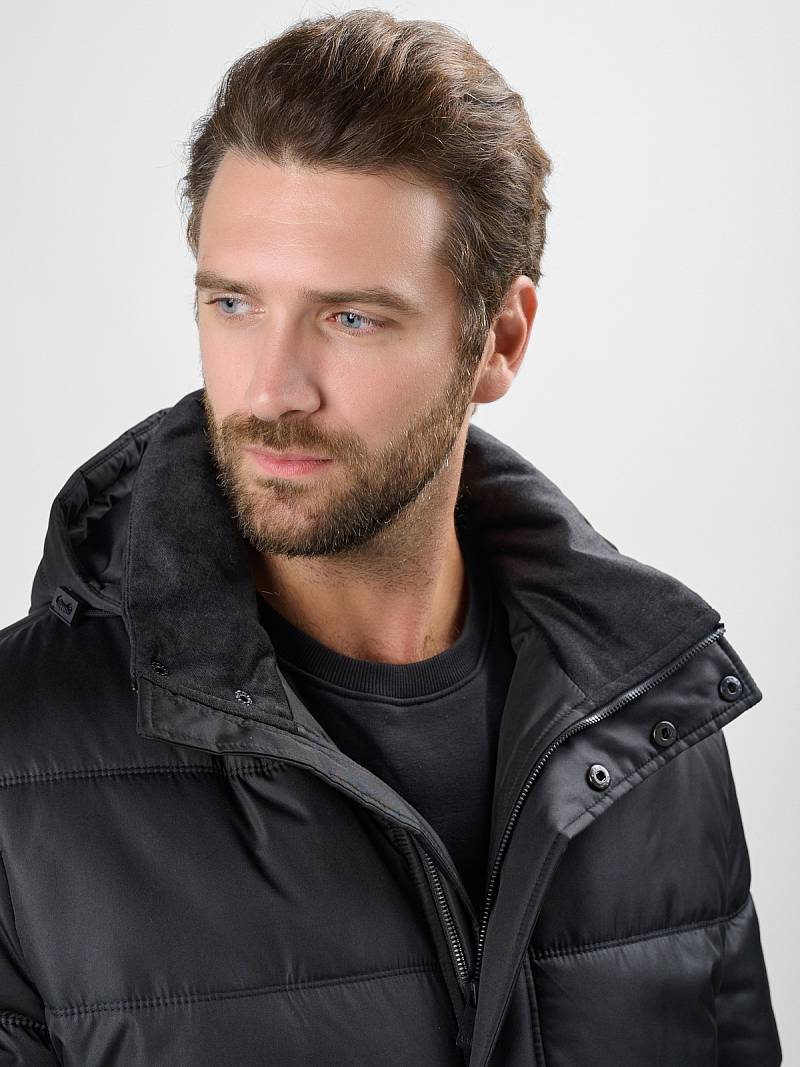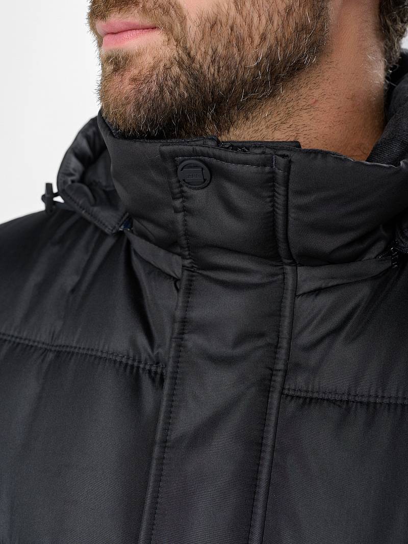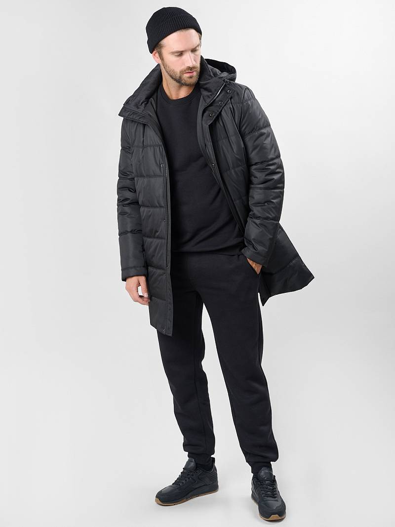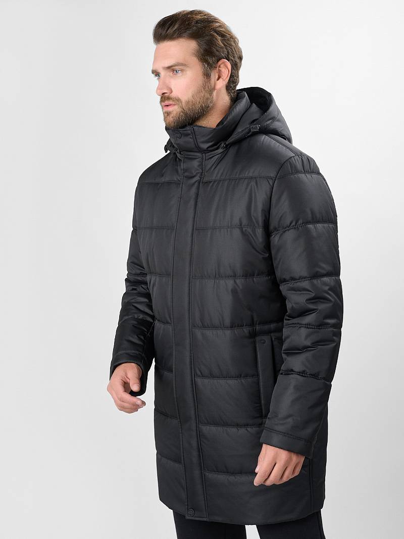 Стеганая утепленная мужская куртка-пальто из плащевой ткани со съемным капюшоном, пристегивающимся на молнию. Воротник - стойка. Застежка изделия - центральная на молнию и ветрозащитную планку с потайными кнопками. Полочки, спинка и рукава простеганы горизонтальной двойной строчкой. На полочках - прорезные карманы с листочками на магнитах. Спинка со средним швом и шлицей. На левом рукаве - отделочная деталь - нашивка. На подкладке полочек - прорезные карманы с листочкой на молнию. Длина изделия для размера 50/176 - 93см. Ткань верха: 100%полиэстер. Подкладка: 100%полиэстер. Утеплитель: термоплюс 200гр/200гр