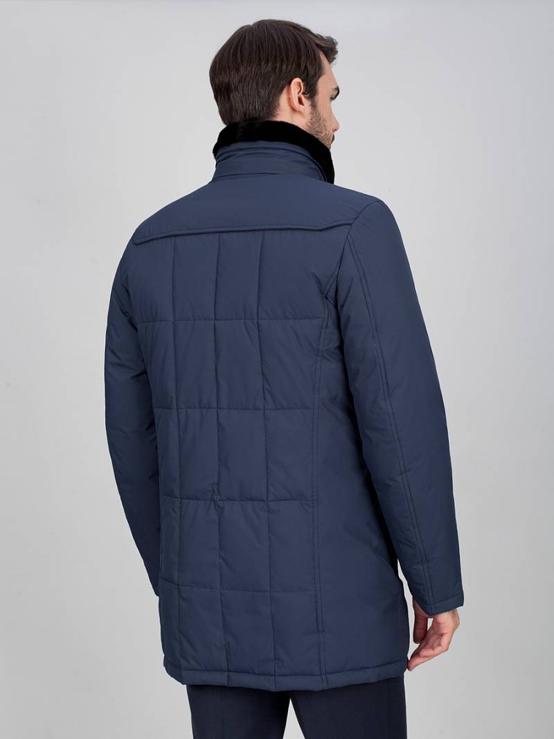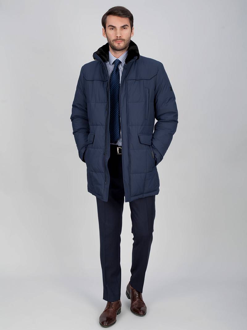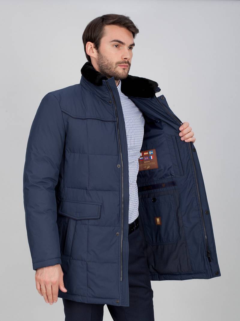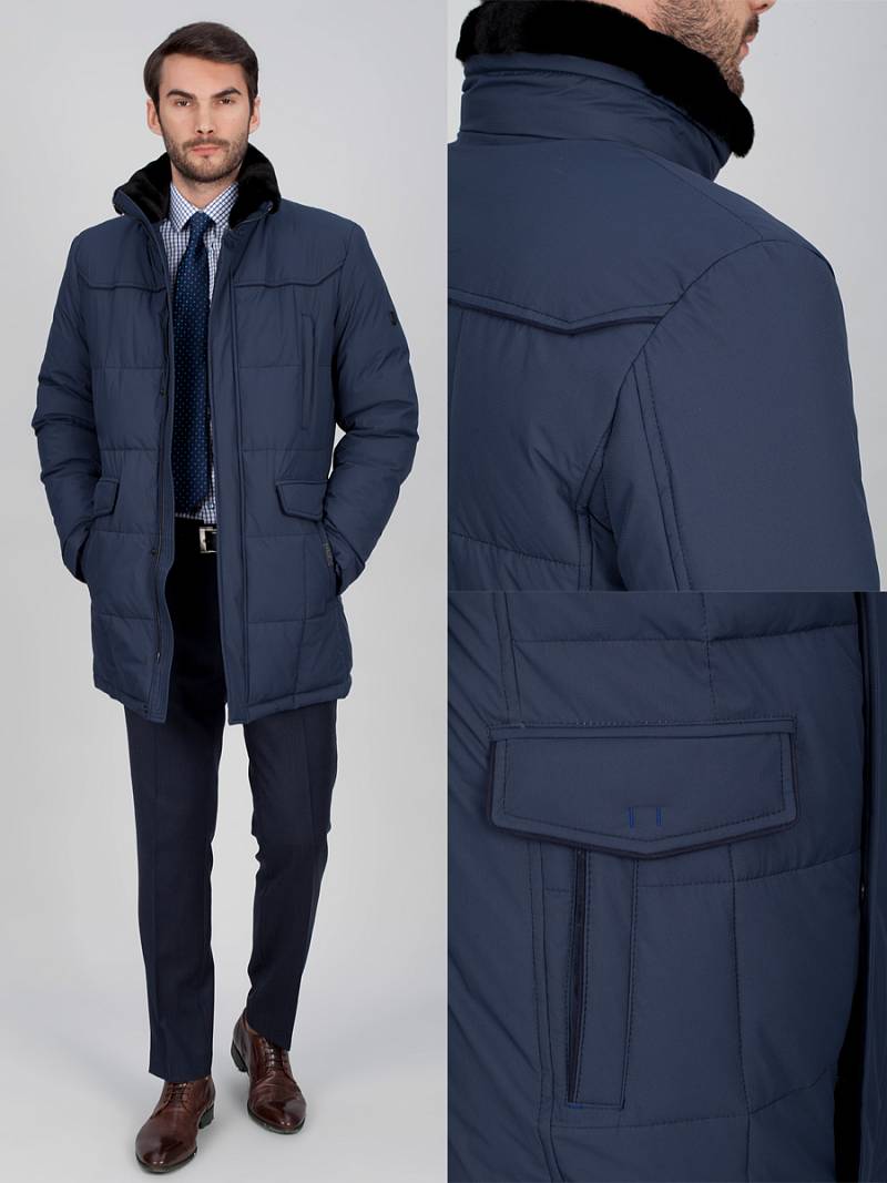 Куртка мужская утепленная со съемным натуральным меховым воротником, воротник - стойка. Центральная застежка изделия на молнию и ветрозащитную планку на 5 потайных кнопок. Полочки, спинка- с фигурными кокетками. Рукава, полочки и спинка - простеганы стежкой "квадрат". На полочках - четыре нижних прорезных кармана: 1-й-с фигурными клапанами, 2-ой - наклонный с листочками. также имеется верхний прорезной карман на молнии. На подкладке по линии талии - настрочная фирменная тесьма. Также на подкладке два внутренних кармана на молниях и один накладной карман на пуговице. Длина изделия по спинке для роста 176 - 84см. Ткань верха: 100% полиэстер. Подкладка: 50% вискоза, 50% полиэстер. Утеплитель: Био-пух 100% (220гр)