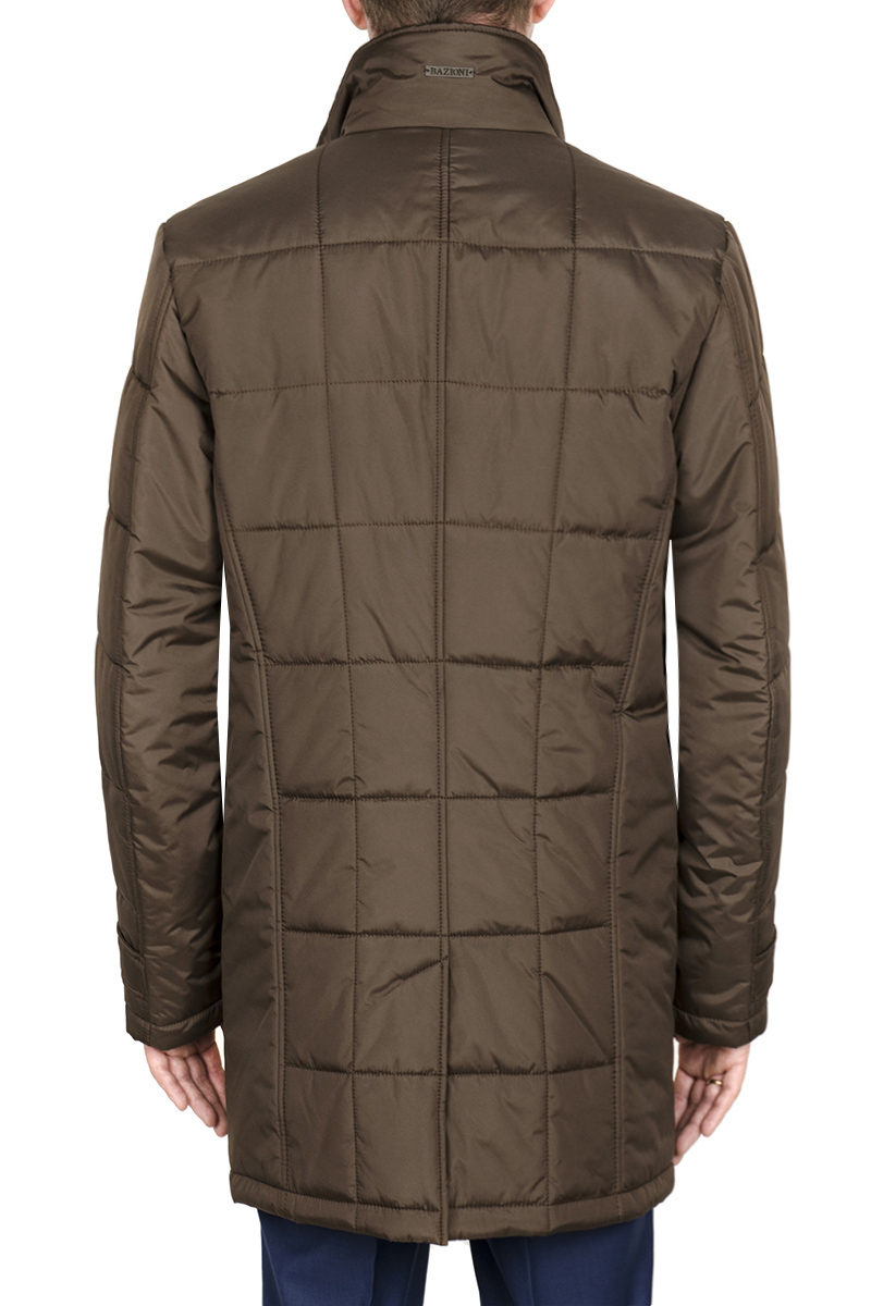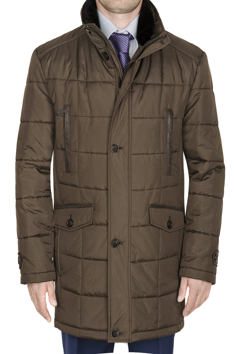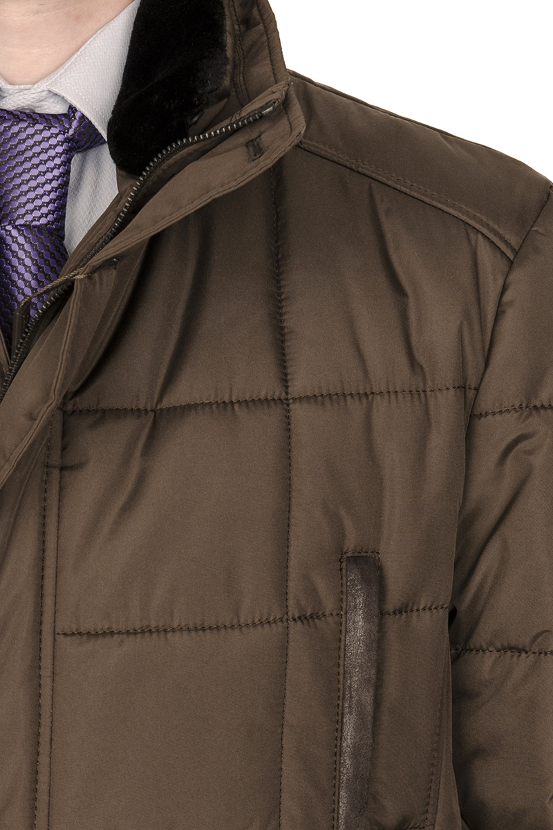 Куртка мужская утепленная со съемным капюшоном, воротник - стойка. Центральная застежка изделия на молнию и ветрозащитную планку на 5 пуговиц. Полочки, спинка и рукава - простеганы стежкой "квадрат". На полочках - нижние прорезные карманы с фигурными клапанами на пуговицу, также имеются карманы внизу рельефных швов. На спинке - шлица, застегивается на 2 потайные кнопки. На подкладке по линии талии - настрочная фирменная тесьма. Длина изделия по спинке для роста 176 - 85см. Ткань верха: 100%полиэстер. Подкладка: 100%полиэстер. Утеплитель: термоплюс 200гр