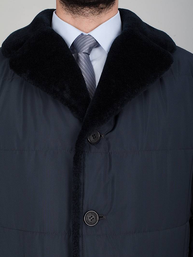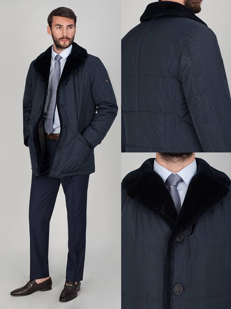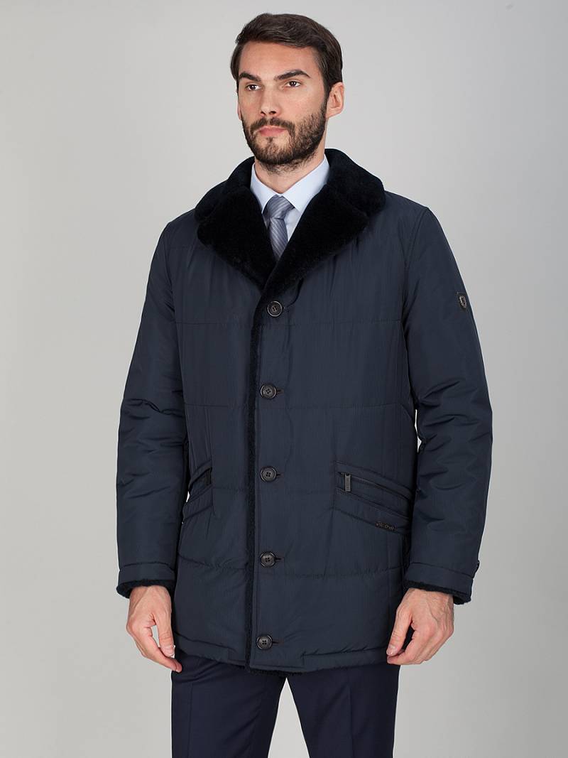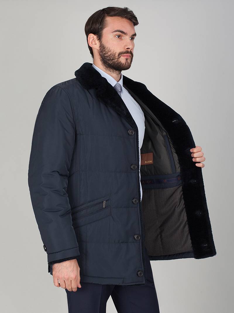 Куртка мужская утепленная с английским воротником из плащевой ткани с центральной застежкой на 5 пуговиц. Меховые полушерстяные воротник и подборт - не съемные. На нижней стойке воротника-вышивка BAZIONI. По полочке и спинке - горизонтальная стежка и отделочные строчки по рельефам. На полочках два наклонных кармана с листочками и 2 наклонных кармана с молниями. Спинка с двумя шлицами в боковых рельефах. Рукава с локтевыми швами, по которым проложены отделочные строчки. Низ рукавов оформлен меховой обтачкой. На левом рукаве - фирменная нашивка. Подкладка изделия состоит из двух частей: верхняя и нижняя части. По талии - отделочная фирменная тесьма. Полочки подкладки изделия с внутренними прорезными карманами с листочками. Длина изделия по спинке для роста 176 - 82см. Ткань верха: 100%полиэстер. Подкладка: 50% вискоза, 50% полиэстер Утеплитель: термофин 200 гр.