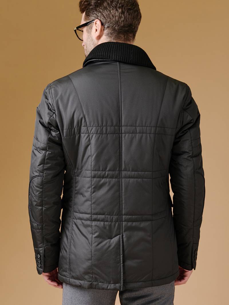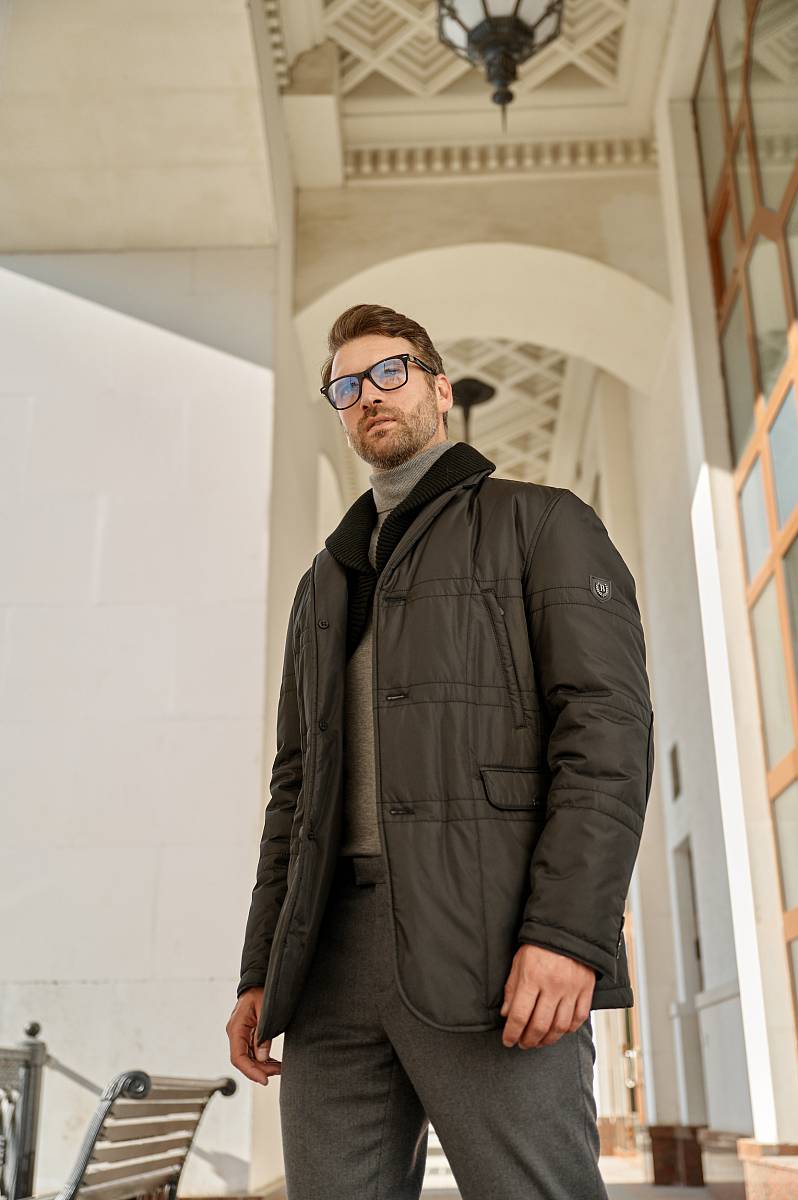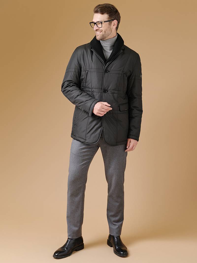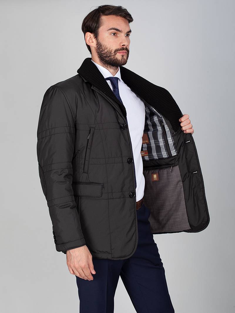 Куртка с застежкой на 3 пуговицы, воротник классический + съёмный трикотажный воротник. Карманы с клапанами, в рельефах и на молнии, по спинке шлица. Длина изделия по спинке для роста 176 - 80см. Ткань верха: 100%полиэстер. Подкладка: 100%полиэстер. Утеплитель: термоплюс 200гр