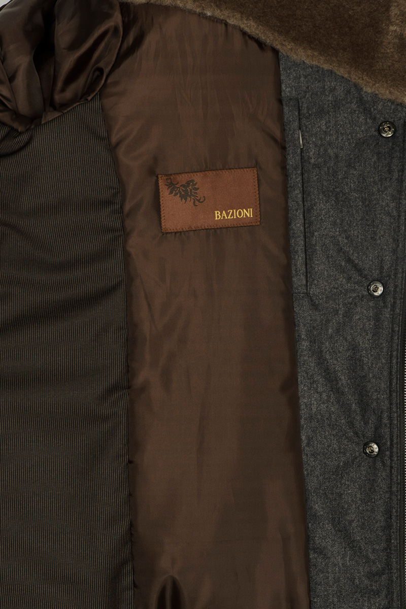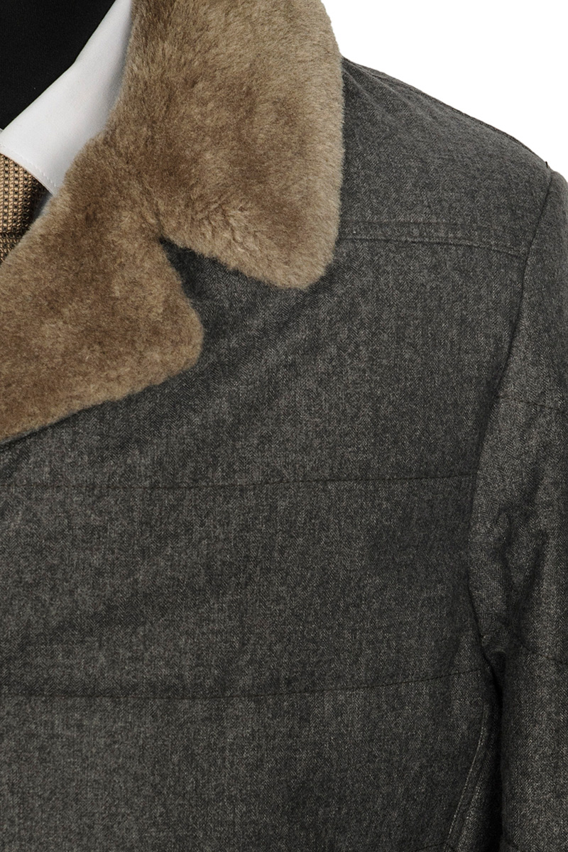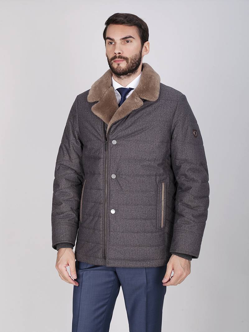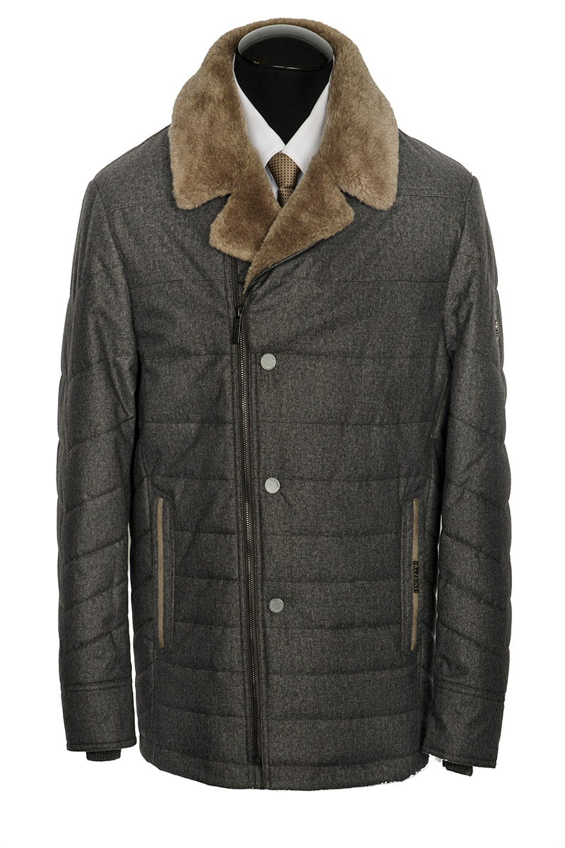 Куртка мужская утепленная с несъемным меховым воротником и смещенной застежкой на молнию и кнопки. Отложной воротник с лацканами и верхняя часть подкладки изделия - из полушерстяного меха. Спинка и полочки простеганы горизонтальной стежкой. На полочках и спинке - горизонтальные кокетки. Боковые карманы с листочками расположены в рельефных швах. Рукава простеганы V-образной стежкой, по низу рукавов - трикотажный манжет, на левом рукаве - герб-нашивка. По рельефным швам, плечевым, по швам притачивания кокеток, по локтевым швам и по шву притачивания паты - проложена двойная отделочная строчка. Подкладка изделия - комбинированная. Состоит из меховой подкладки и подкладочных тканей двух видов. На полочках подкладки - внутренние карманы с листочками на молнии. По талии подкладки - фирменная тесьма. Длина изделия по спинке для роста 176 - 78см. Ткань верха: 100%полиэстер. Подкладка: 100%полиэстер. Утеплитель: термоплюс 200гр