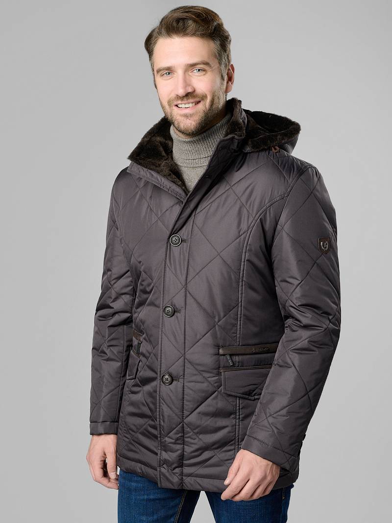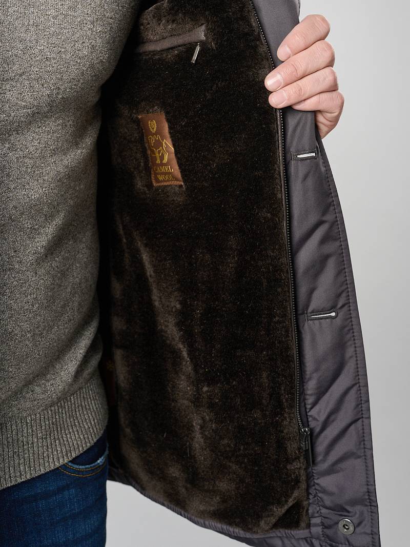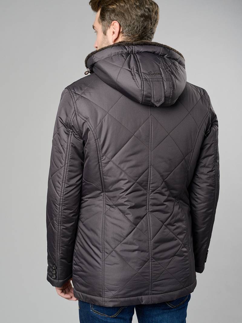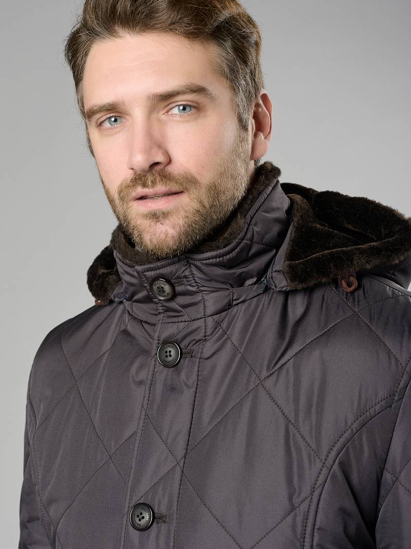 Куртка мужская утепленная с капюшоном из плащевой ткани на меховой полушерстяной подкладке с центральной застежкой на молнию и на 5 пуговиц. На средней части капюшона- стягивающая пата на кнопках, передний край капюшона - оформлен кулисой, которая затягивается двумя фиксаторами. Центральные части полочек, спинки и рукавов простеганы стежкой в виде "ромб-квадрат". Без стежки - бочки полочек, бочки спинки и нижние детали рукавов. Полочки с четырьмя карманами: 1-е два -на молниях, 2-е два - с фигурными клапанами на магнитах. Рукава втачные состоят из двух частей, На рукаве- фирменная нашивка. Подкладка изделия меховая, на полочках их меха - внутренние прорезные карманы с втачной листочкой на молнии. Длина изделия по спинке для роста 176 - 80см. Ткань верха: 100% полиэстер. Подкладка съемн мех: 80% шерсть, 20% пан. Утеплитель: 100гр