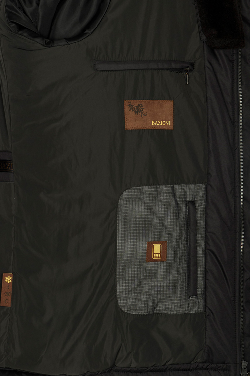 Куртка мужская утепленная с капюшоном с застежкой на молнию и ветрозащитную планку на 6 кнопок. Капюшон с опушкой из натурального енота- съемный, пристегивающийся на молнию, меховая опушка также съемная на кнопках. Внутренняя часть капюшона из полушерстянного меха. Воротник - стойка. Полочки и спинка с наклонными кокетками. На полочках, спинке и рукавах - стежка, линии которой простеганы паралельно линиям кокеток. Полочки с двумя нагрудными карманами с листочками на молнию и двумя нижними боковыми карманами с листочками на молнию. Рукава втачные состоят из двух частей, по низу рукавов - трикотажный манжет. В швах притачивания кокеток, по краю листочек - отделочный объемный кант. На полочках подкладки изделия - два нагрудных внутренних кармана с листочками на молнии и один нижний внутренний карман также на молнию. По спинке на линии талии - отделочная фирменная тесьма Длина изделия по спинке для роста 176 - 84см. Ткань верха: 100%полиэстер. Подкладка: 100%полиэстер. Утеплитель: термоплюс 250гр