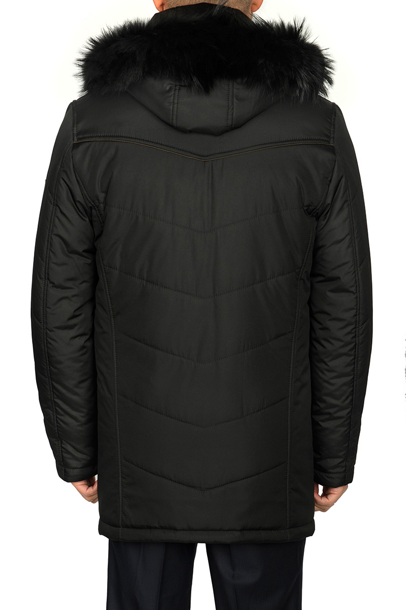 Куртка мужская утепленная с капюшоном с застежкой на молнию и ветрозащитную планку на 6 кнопок. Капюшон с меховой опушкой - съемный, пристегивающийся на молнию, меховая опушка также съемная на кнопках. Воротник - стойка. Полочки и спинка с наклонными кокетками. На полочках, спинке и рукавах - стежка, линии которой простеганы паралельно линиям кокеток. Полочки с двумя нагрудными карманами с листочками на молнию и двумя нижними боковыми карманами с листочками на молнию. Рукава втачные состоят из двух частей, по низу рукавов - трикотажный манжет. В швах притачивания кокеток, по краю листочек - отделочный объемный кант. На полочках подкладки изделия - два нагрудных внутренних кармана с листочками на молнии и один нижний внутренний карман также на молнию. По спинке на линии талии - отделочная фирменная тесьма. Длина изделия по спинке для роста 176 - 84см. Ткань верха: 100%полиэстер. Подкладка: 100%полиэстер. Утеплитель: термоплюс 250гр