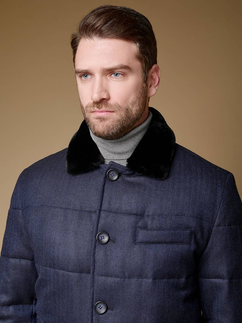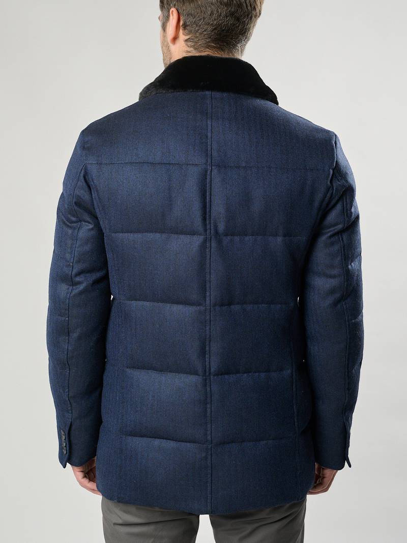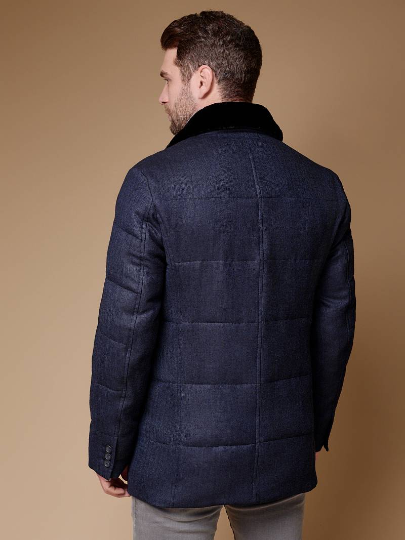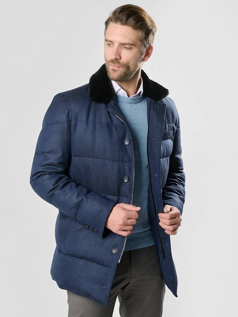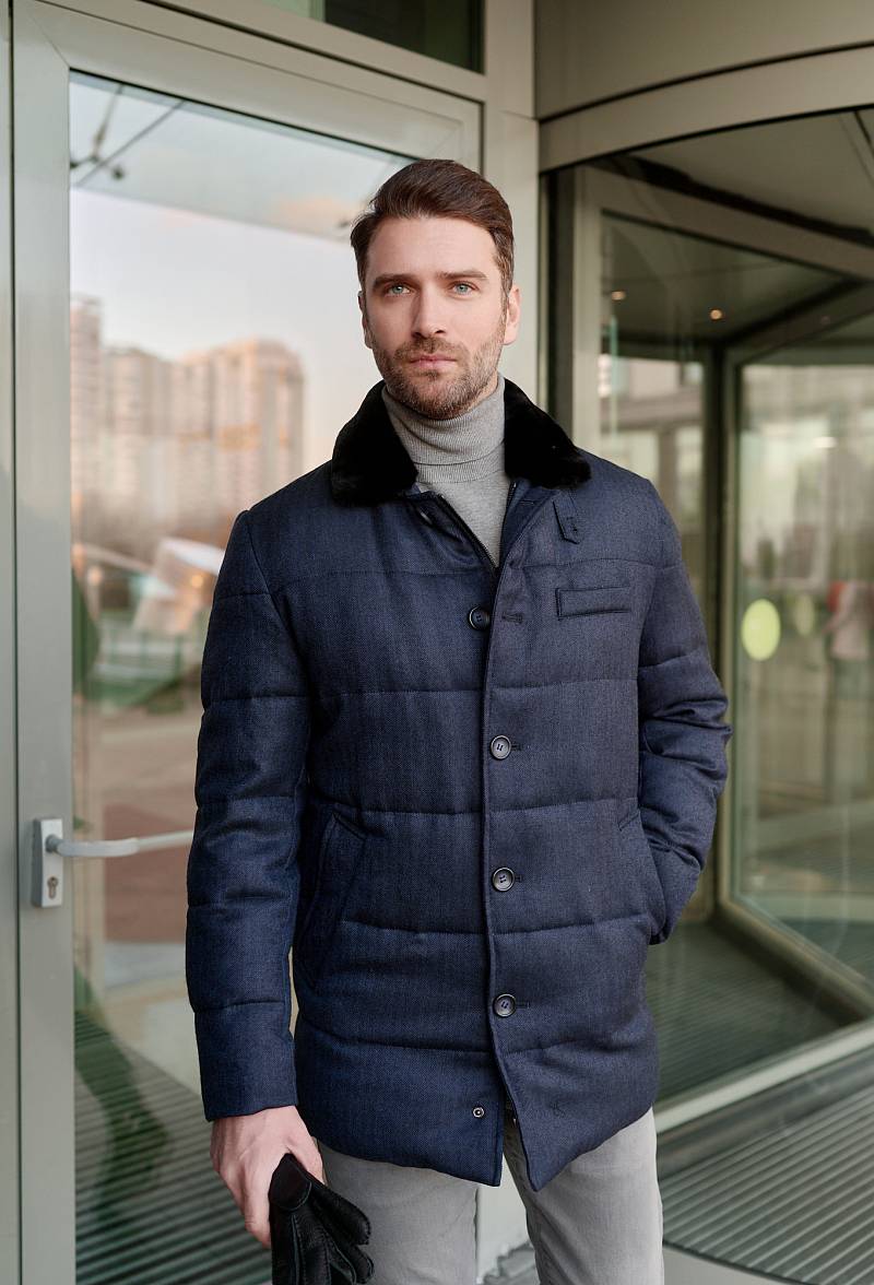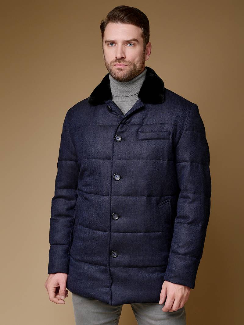 Куртка мужская утепленная укороченная с меховым отложным воротником. Застежка изделия центральная на молнию и 5 пуговиц. Спинка, полочка и передние части рукавов простеганы стежкой. На полочке боковые прорезные карманы с листочками на магнитах. Спинка со средним швом. По низу рукавов - иммитация шлицы на пуговицах. На подкладке - два внутренних прорезных кармана на молниях. Рекомендуется обработать изделие водонепроницаемым аэрозолем для защиты от неблагоприятных погодных условий. Длина изделия по спинке для роста 176 - 81см. Ткань верха: 100% шерсть. Подкладка: 100% полиэстер. Утеплитель: био- пух 180гр/160гр. Воротник: мех натуральный