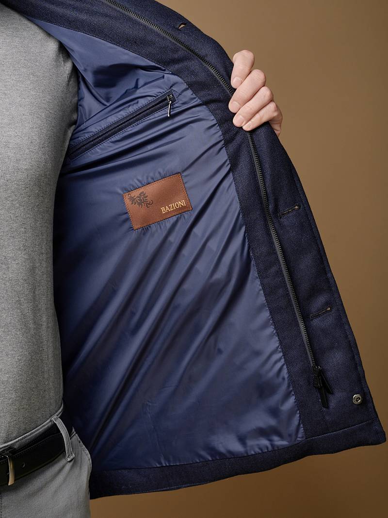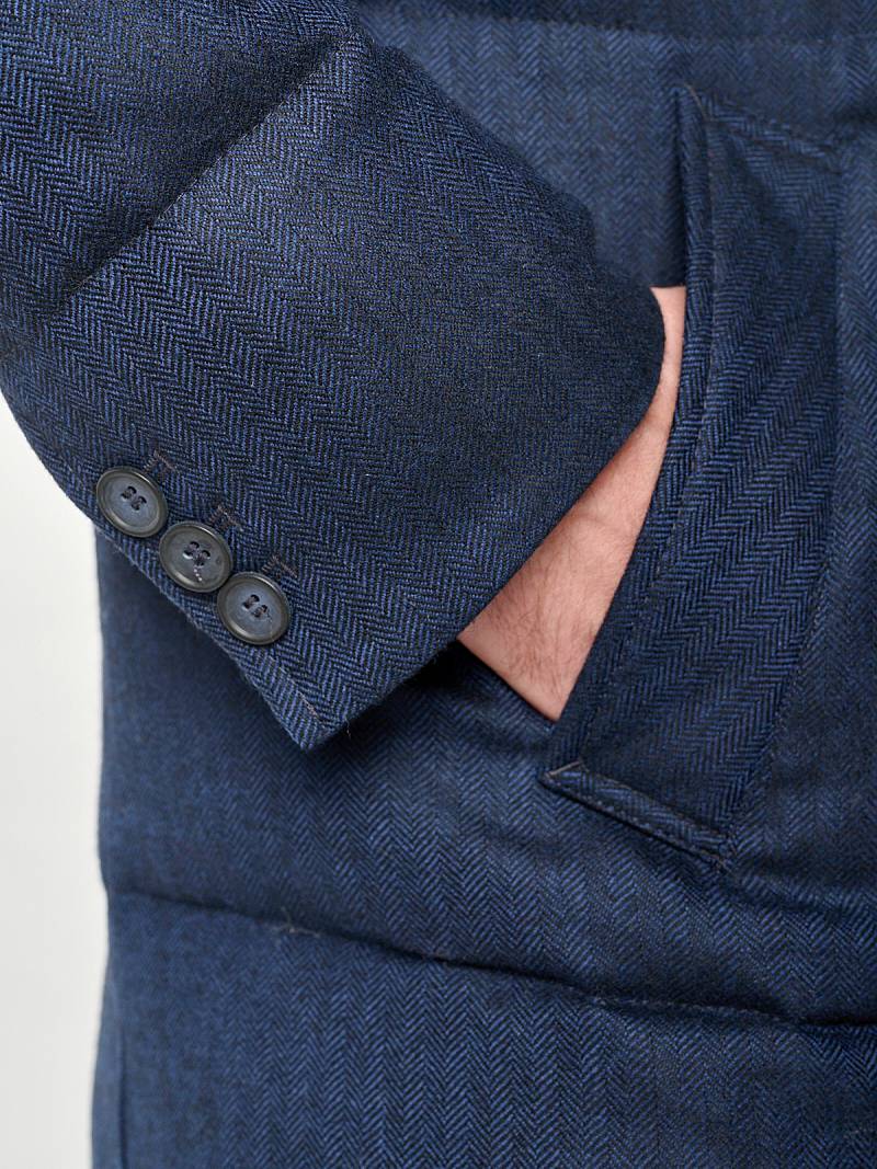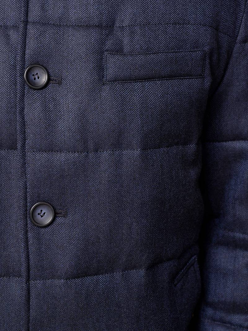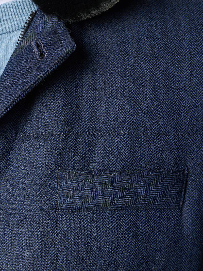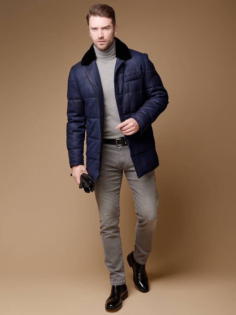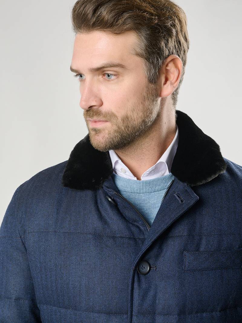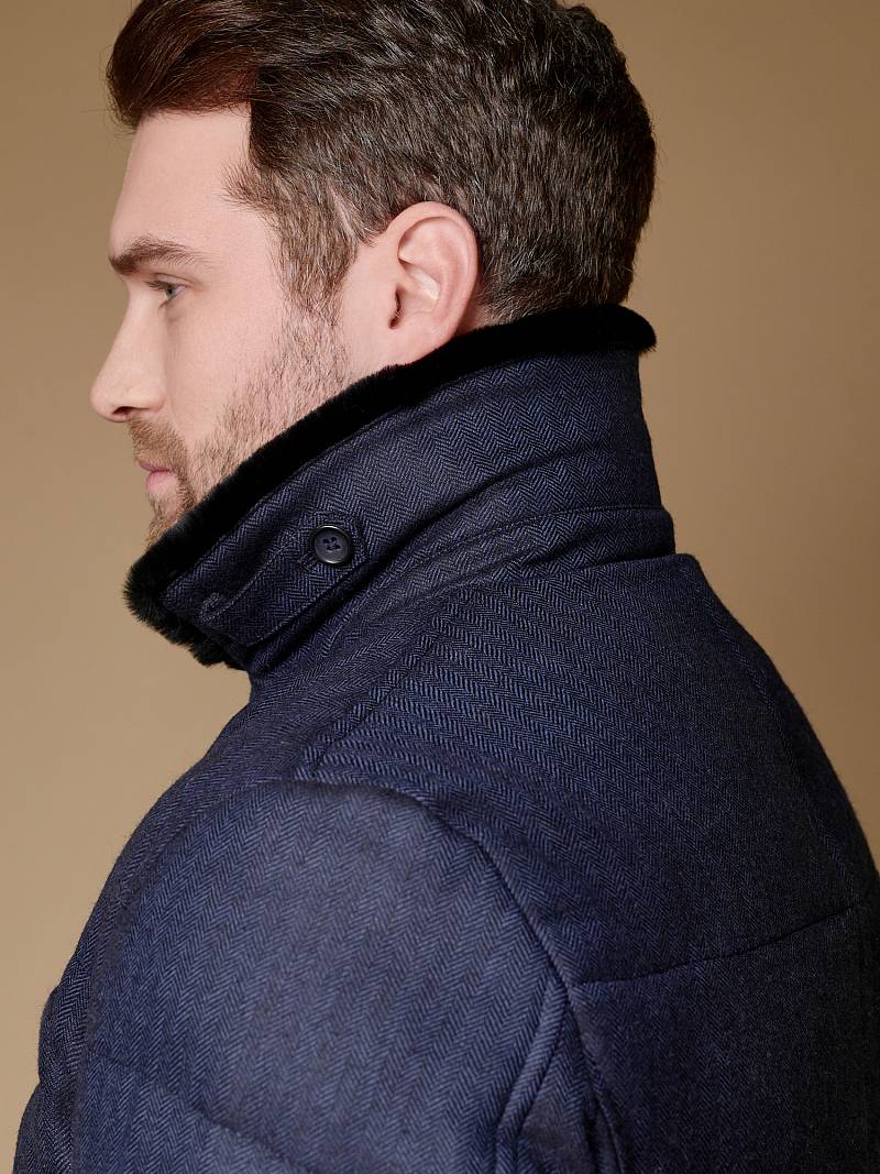 Куртка мужская утепленная укороченная с меховым отложным воротником. Застежка изделия центральная на молнию и 5 пуговиц. Спинка, полочка и передние части рукавов простеганы стежкой. На полочке боковые прорезные карманы с листочками на магнитах. Спинка со средним швом. По низу рукавов - иммитация шлицы на пуговицах. На подкладке - два внутренних прорезных кармана на молниях. Рекомендуется обработать изделие водонепроницаемым аэрозолем для защиты от неблагоприятных погодных условий. Длина изделия по спинке для роста 176 - 81см. Ткань верха: 100% шерсть. Подкладка: 100% полиэстер. Утеплитель: био- пух 180гр/160гр. Воротник: мех натуральный