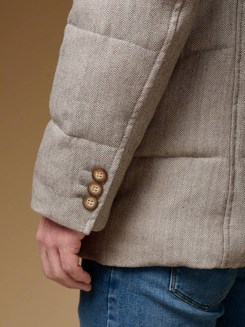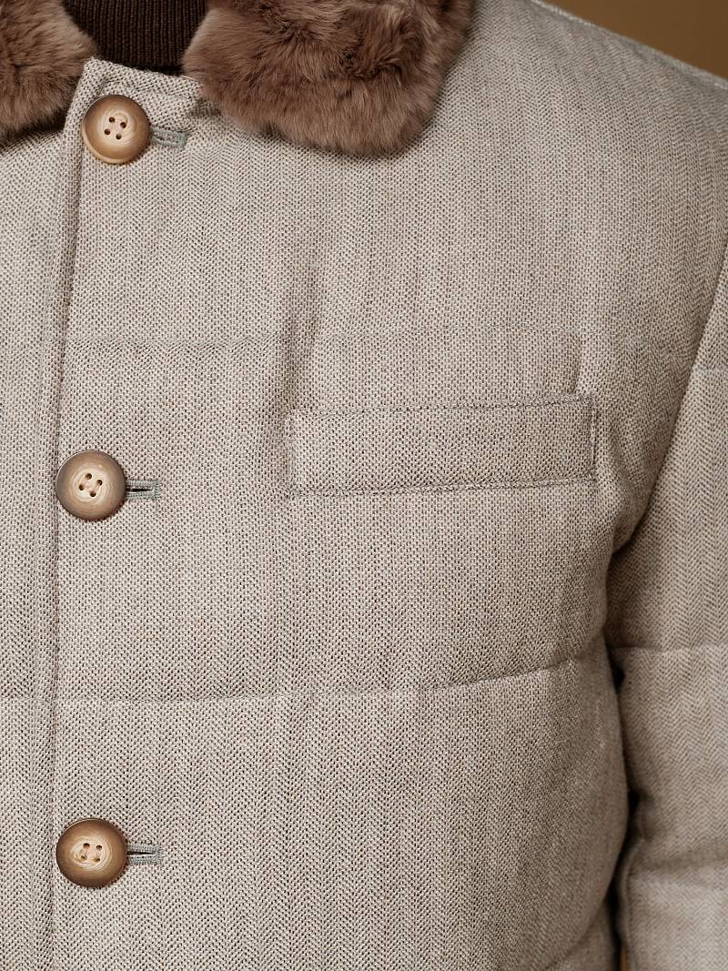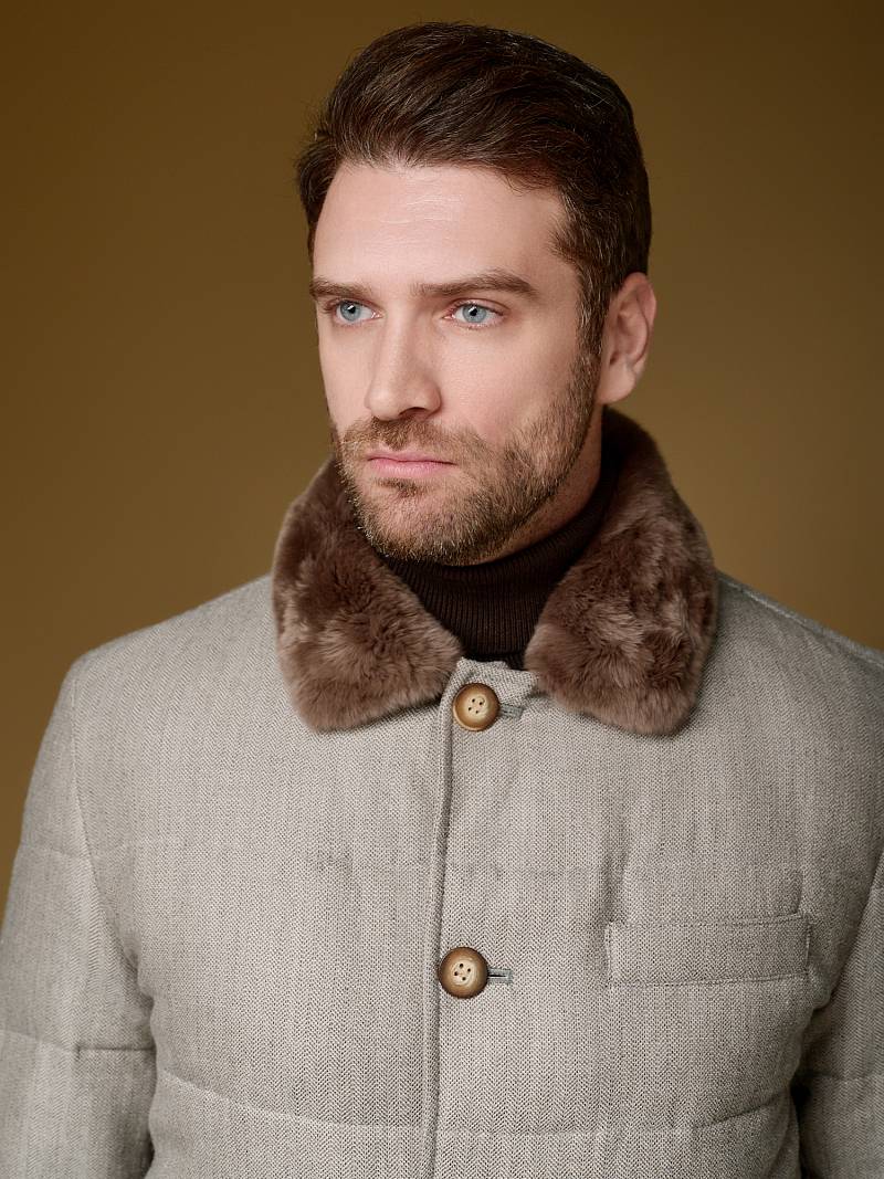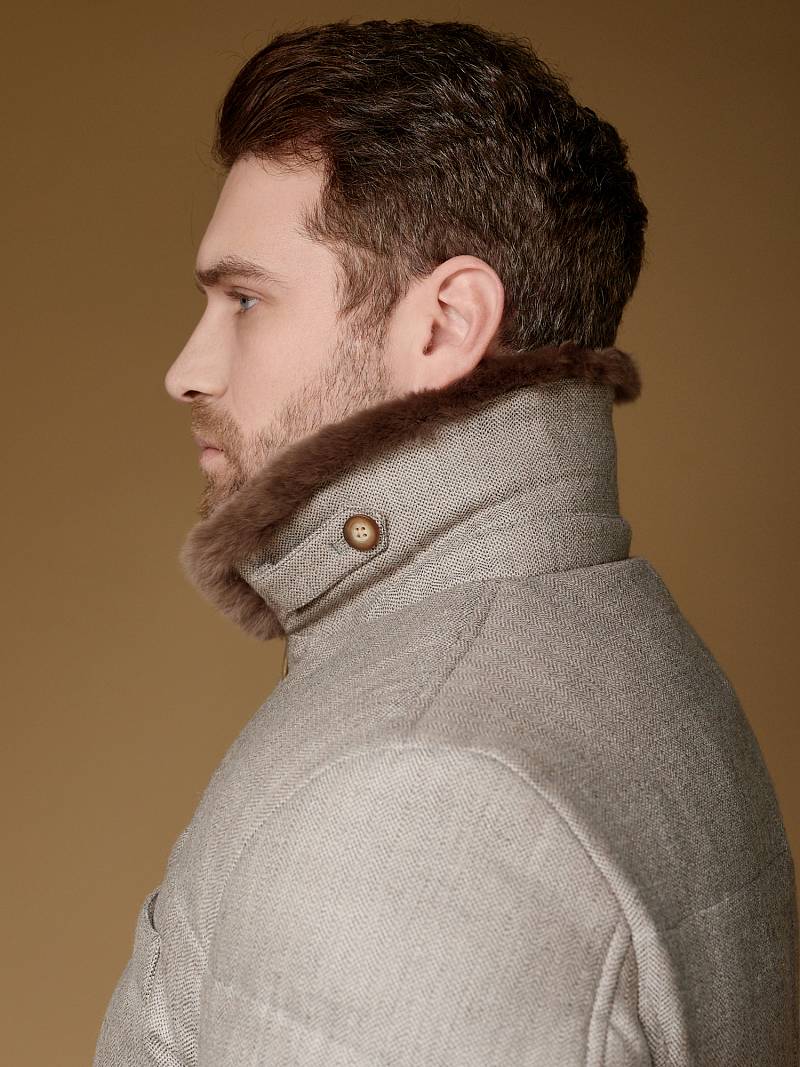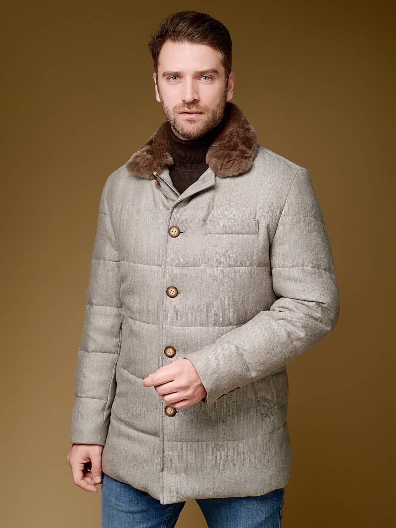 Куртка мужская утепленная укороченная с меховым отложным воротником. Застежка изделия центральная на молнию и 5 пуговиц. Спинка, полочка и передние части рукавов простеганы стежкой. На полочке боковые прорезные карманы с листочками на магнитах. Спинка со средним швом. По низу рукавов - иммитация шлицы на пуговицах. На подкладке - два внутренних прорезных кармана на молниях. Рекомендуется обработать изделие водонепроницаемым аэрозолем для защиты от неблагоприятных погодных условий. Длина изделия по спинке для роста 176 - 81см. Ткань верха: 100% шерсть. Подкладка: 100% полиэстер. Утеплитель: био- пух 180гр/160гр. Воротник: мех натуральный