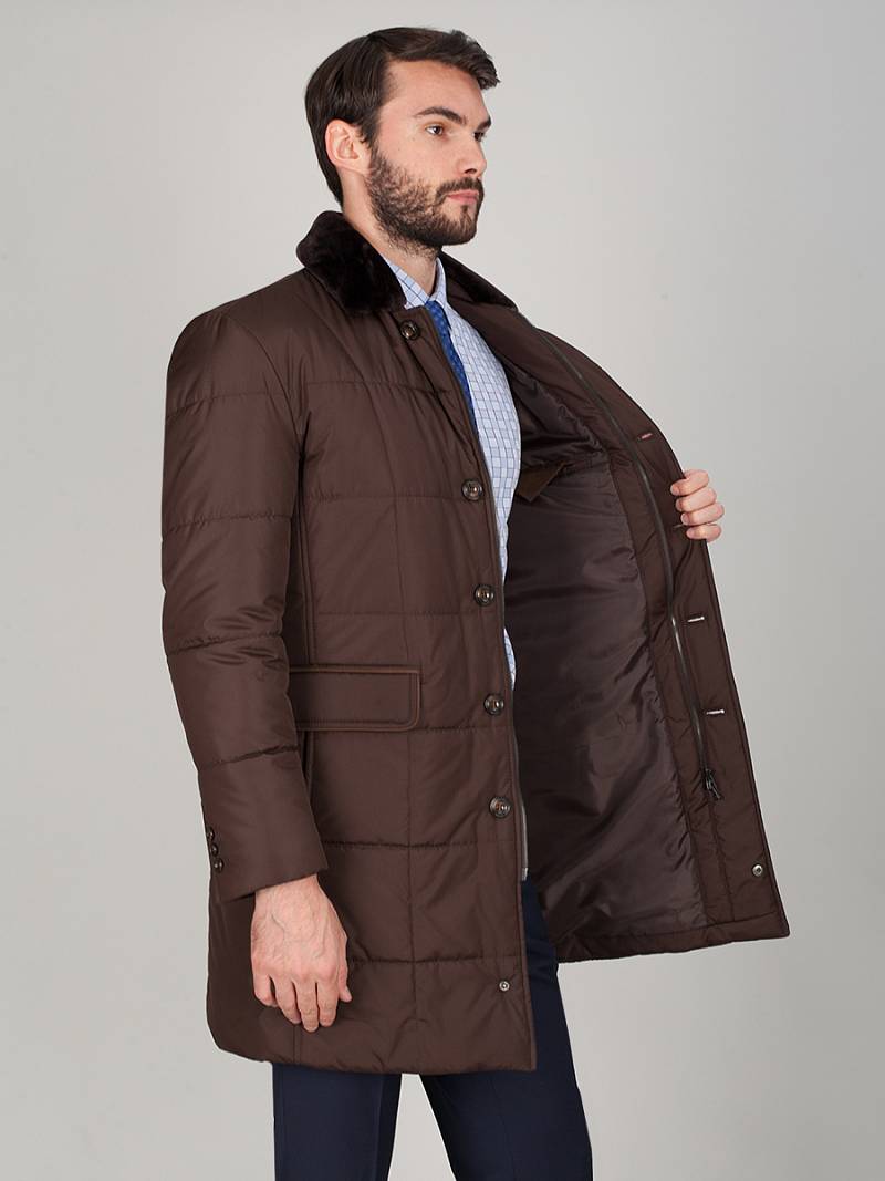 Мужская куртка-пальто утепленная с застежкой на молнию и 4 пуговицы. Воротник - меховой вшивной . Спинка, полочки и передняя часть рукавов простеганы стежкой "квадрат". Спинка со шлицей в среднем шве. Полочки с бочками, на полочках - два нижних боковых кармана с клапанами на магнитах. На левом рукаве нашивка герб. На подкладке- два внутренних кармана на пуговицах. Длина изделия по спинке для роста 176 - 95см. Ткань верха: 100%полиэстер. Подкладка: 100%полиэстер. Утеплитель: термофин 200гр