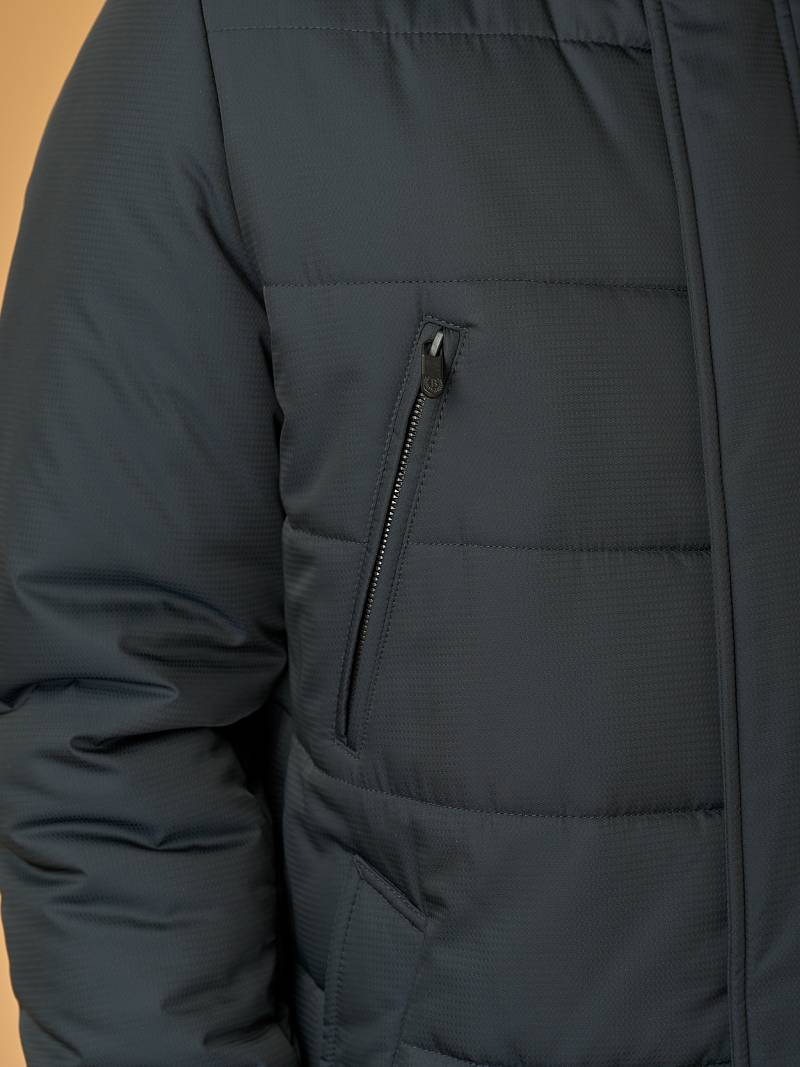 Мужская куртка с глубоким капюшоном из модного современного текстиля выручит в непогоду. В этом модели помогает легкий плотный матовый полиэстер, устойчивый к снегу и дождливым осадкам. Дополнительную защиту от ветра обеспечивают непродуваемая подкладка из прочного полиэстра и слой наполнителя, который поддерживает комфортную температуру. Вставка из трикотажа на воротнике и теплые трикотажные манжеты обеспечивают комфорт в изделии. Функциональность добавляют четыре кармана на полочках и штормовая планка.
