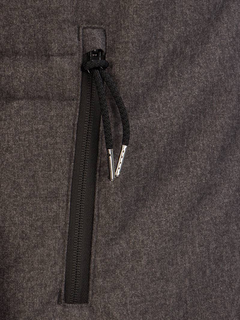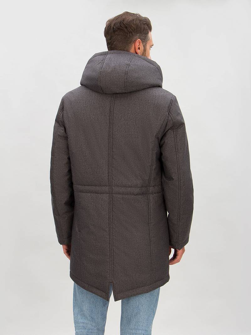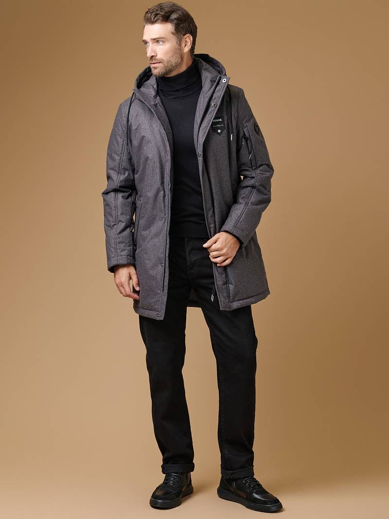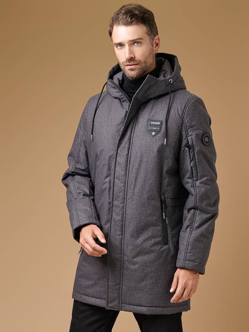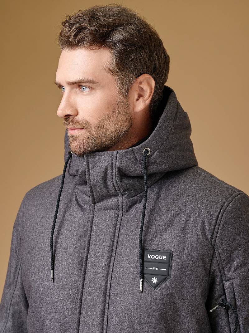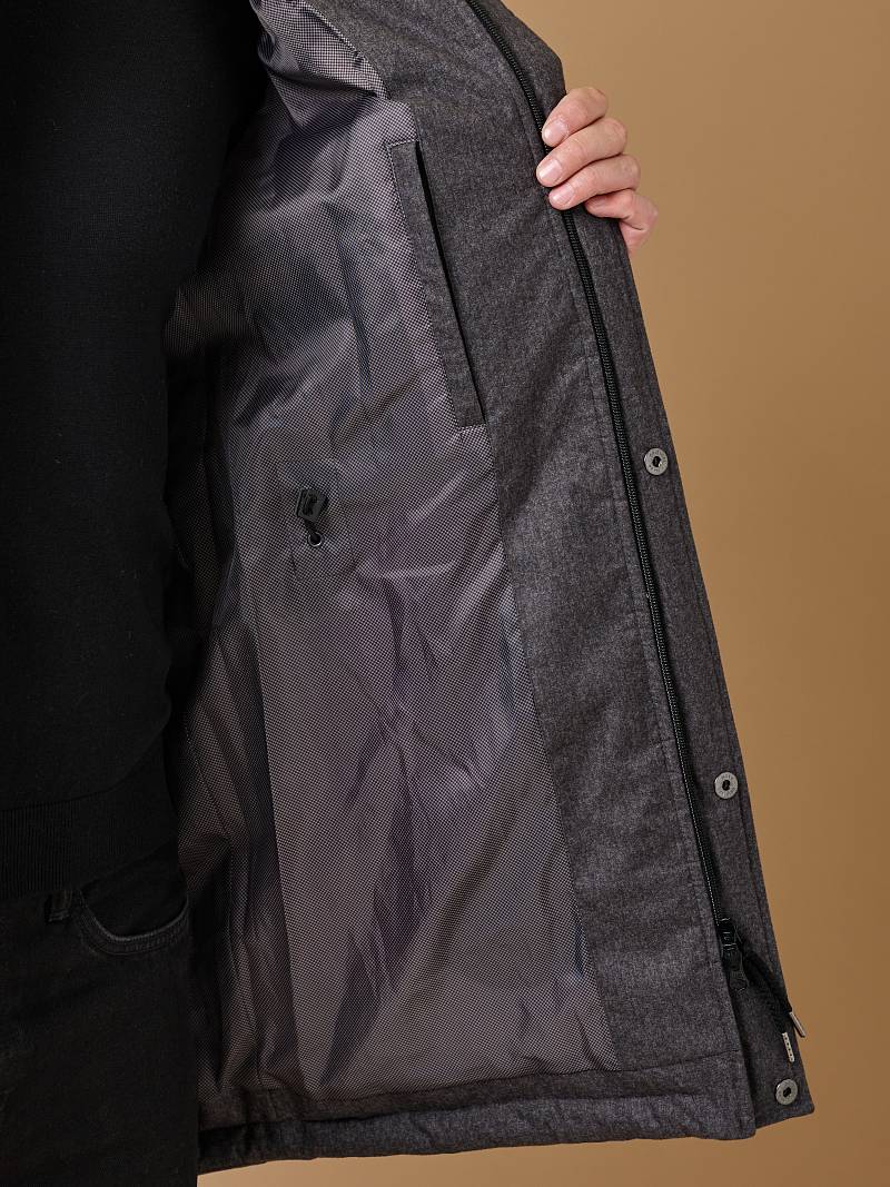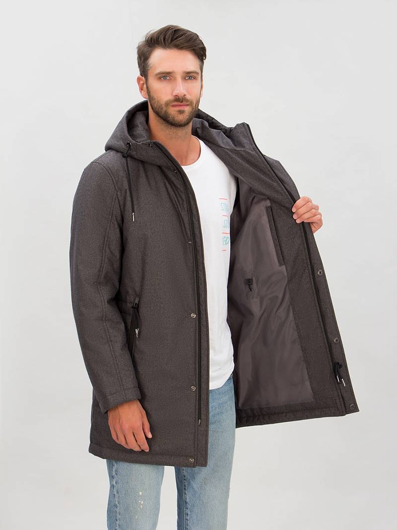 Куртка мужская утепленная, центральная застёжка молния закрытая планкой на кнопках, воротник стойка переходящая в капюшон, карманы "в рамку" на молнии. Рукав втачной, двухшовный, в нижней части рукава ветрозащитный трикотажный манжет. На левом рукаве дополнительный карман на молнии. Спика со средним швом и отрезными боковыми частями, в области талии потайная кулиска на резинке регулирующая объем талии. На подкладке два внутренних кармана на молнии. Длина куртки по спинке в 176 росте - 94см. Ткань верха: 100%полиэстер. Подкладка: 100%полиэстер. Утеплитель: термофин 200 гр.