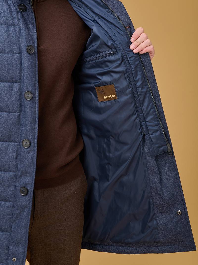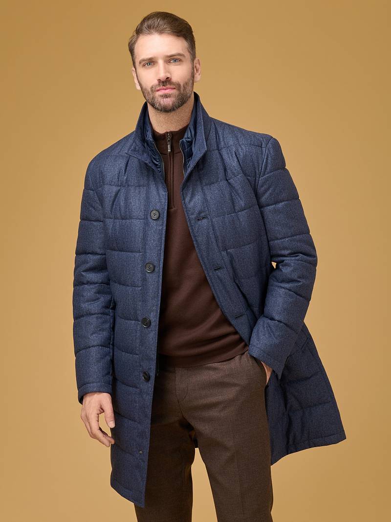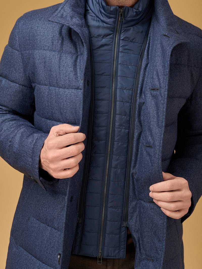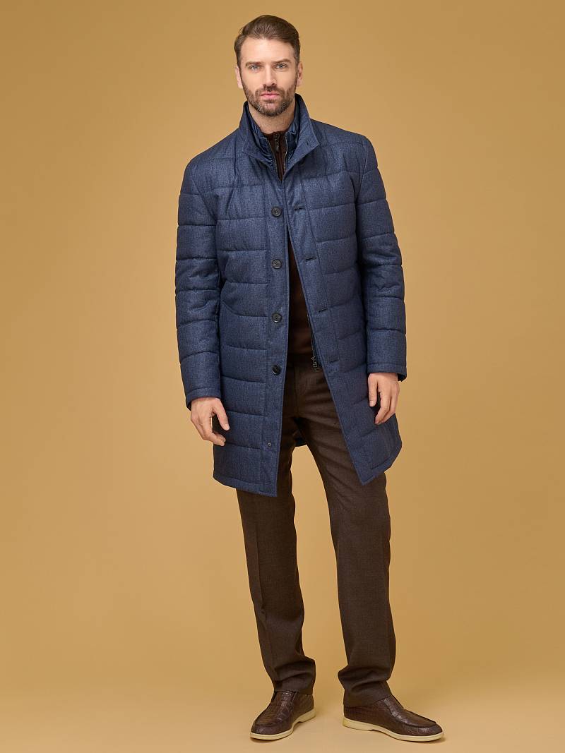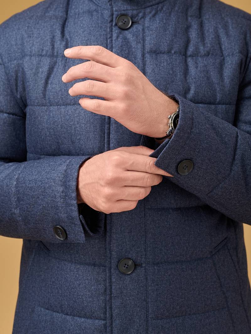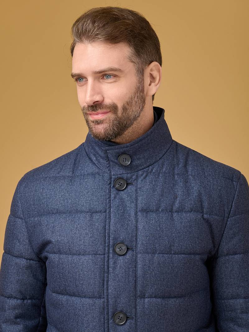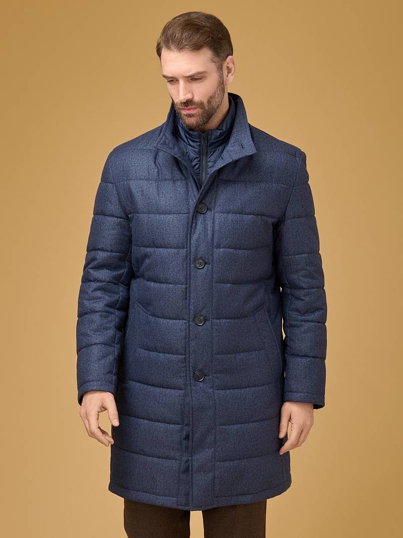 Куртка мужская утепленная с отстегивающийся манишкой на молнию. Застежка куртки на 6 пуговиц. Воротник - стойка. Полочки, спинка, рукава- простеганы горизонтальной стежкой. На полочках - два нижних боковых кармана с листочками. В нижней части среднего шва спинки- шлица на кнопке. Рукава втачные с локтевыми швами. На подкладке - два внутренних прорезных кармана на молниях. Длина по спинке для размера-роста 50/176 - 95см. Ткань верха: 60%шерсть, 40%полиэстер. Подкладка: 100%полиэстер. Утеплитель: термоплюс 200гр/160гр.