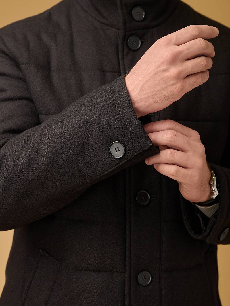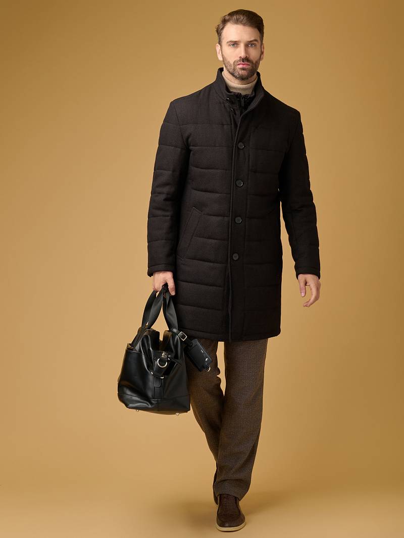 Куртка мужская утепленная с отстегивающийся манишкой на молнию. Застежка куртки на 6 пуговиц. Воротник - стойка. Полочки, спинка, рукава- простеганы горизонтальной стежкой. На полочках - два нижних боковых кармана с листочками. В нижней части среднего шва спинки- шлица на 2-х кнопках. Рукава втачные с локтевыми швами. На подкладке - два внутренних прорезных кармана на молниях. Длина по спинке для размера-роста 50/176 - 95см. Ткань верха: 100% шерсть. Подкладка: 100% полиэстер. Утеплитель: термоплюс 200гр./160гр.