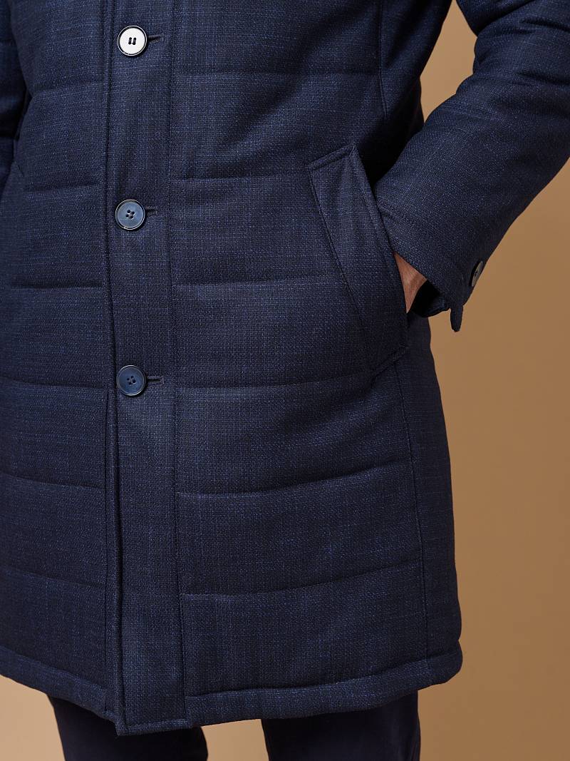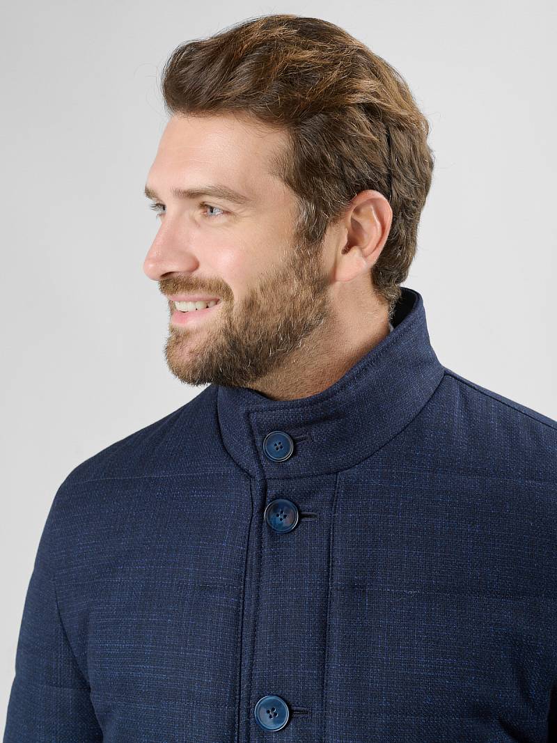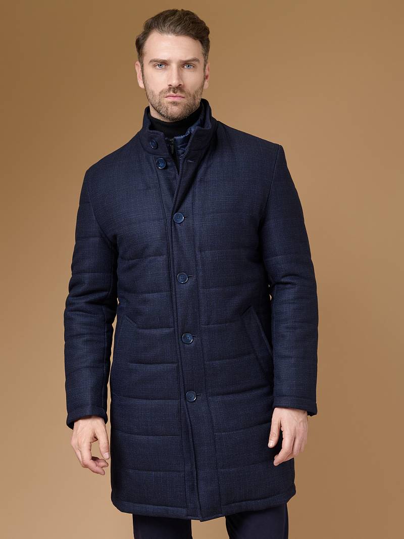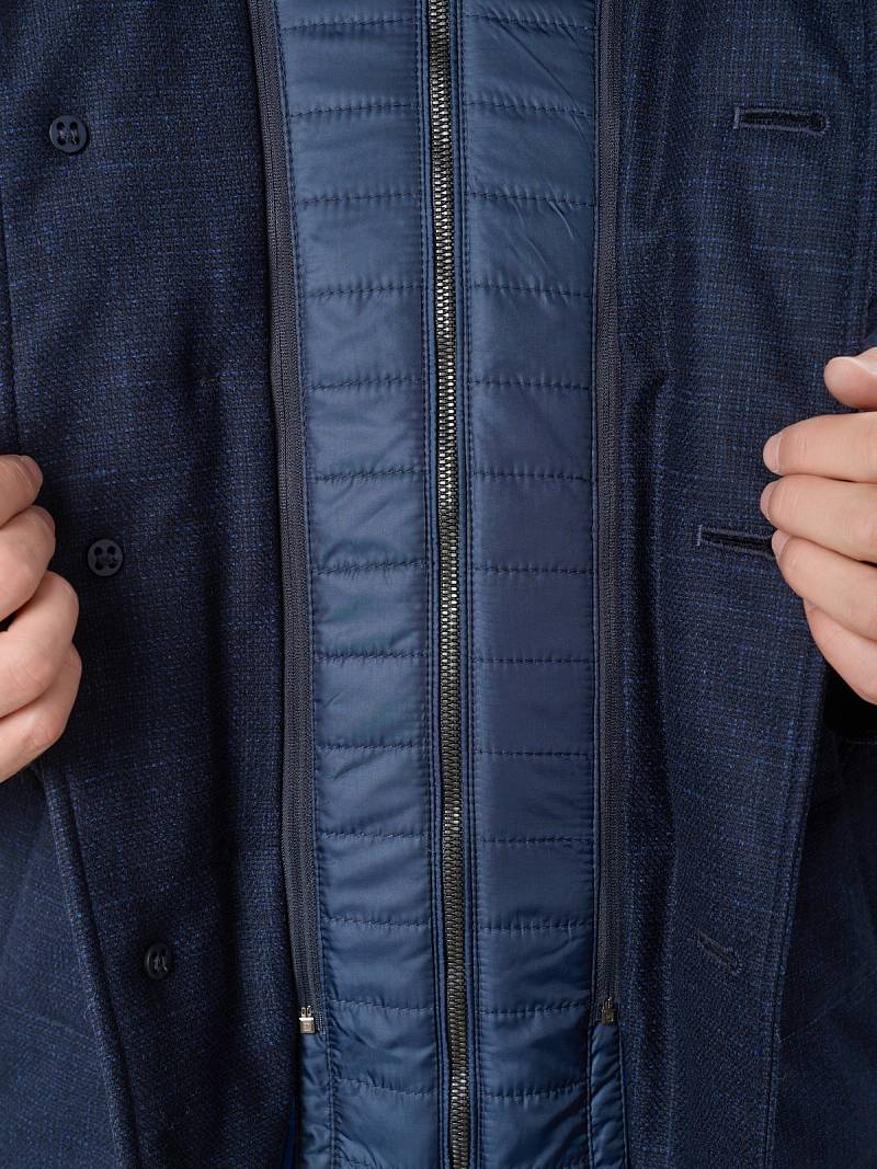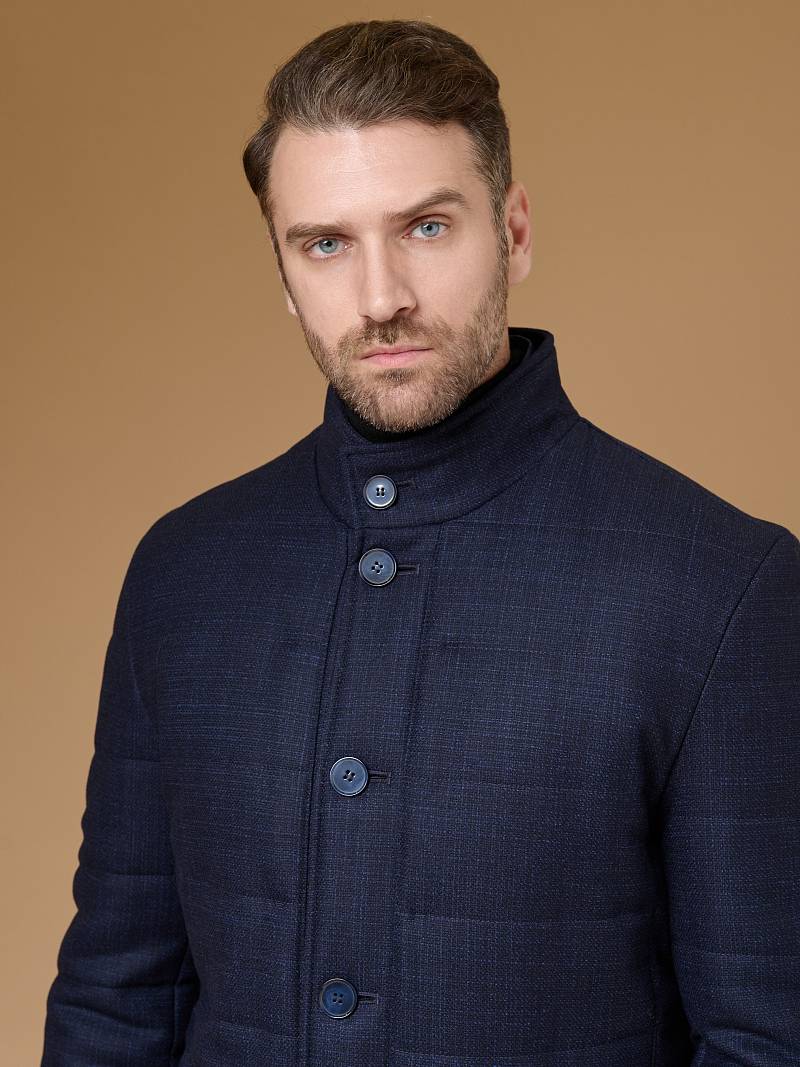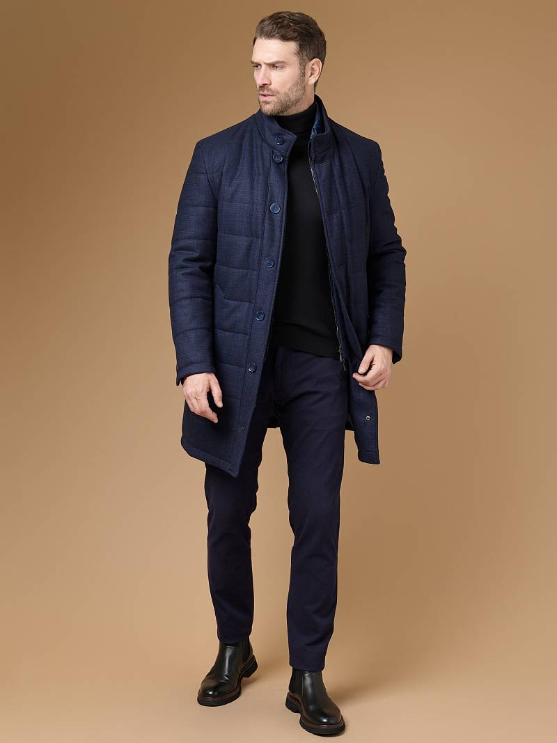 Куртка мужская утепленная с отстегивающийся манишкой на молнию. Застежка куртки на 6 пуговиц. Воротник - стойка. Полочки, спинка, рукава- простеганы горизонтальной стежкой. На полочках - два нижних боковых кармана с листочками. В нижней части среднего шва спинки- шлица на 2-х кнопках. Рукава втачные с локтевыми швами. На подкладке - два внутренних прорезных кармана на молниях. Длина по спинке для размера-роста 50/176 - 82см. Ткань верха: 60% шерсть, 40% кашемир. Подкладка: 100% полиэстер. Утеплитель: термоплюс 200гр./160гр.