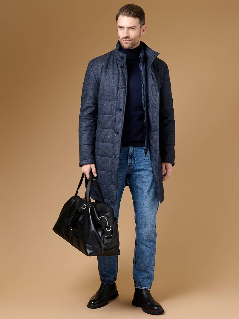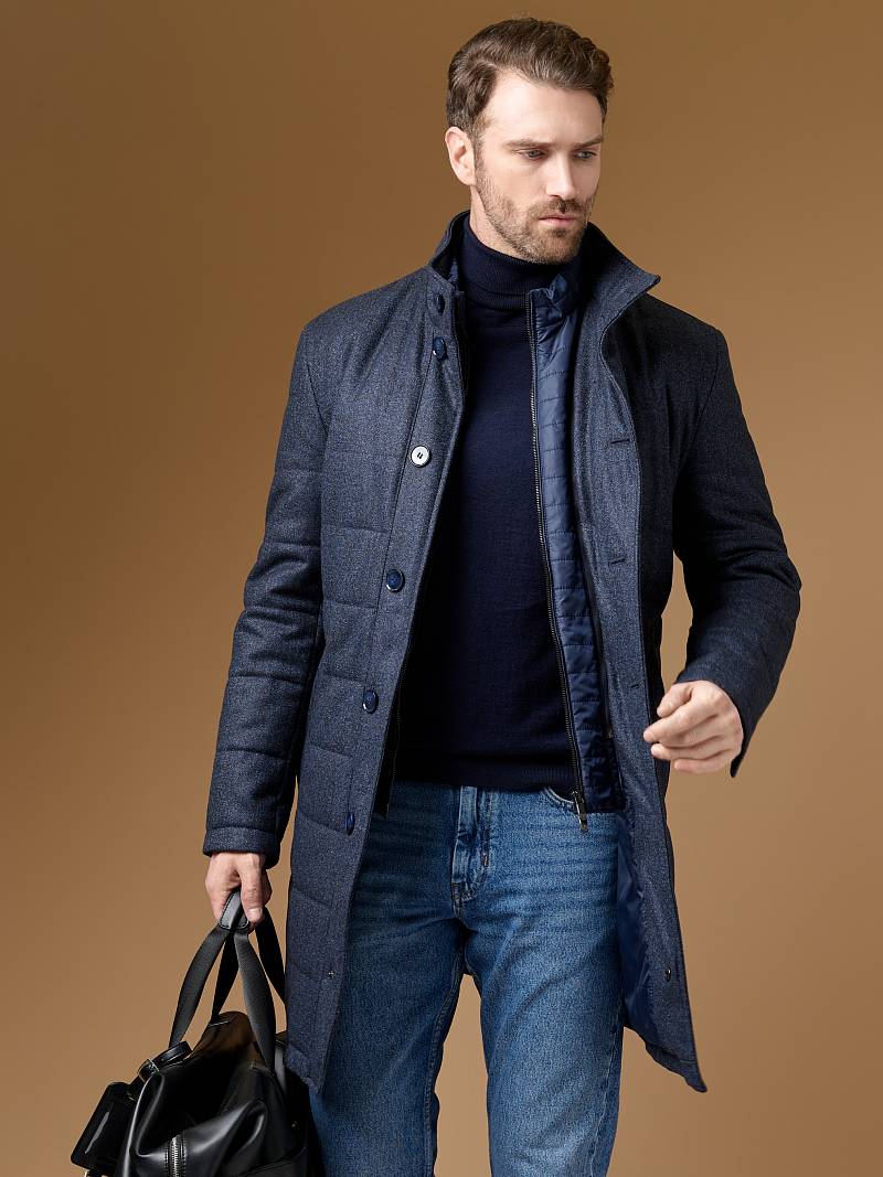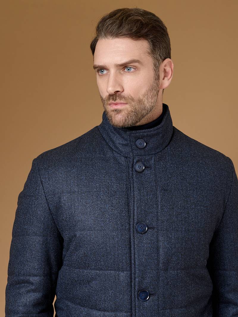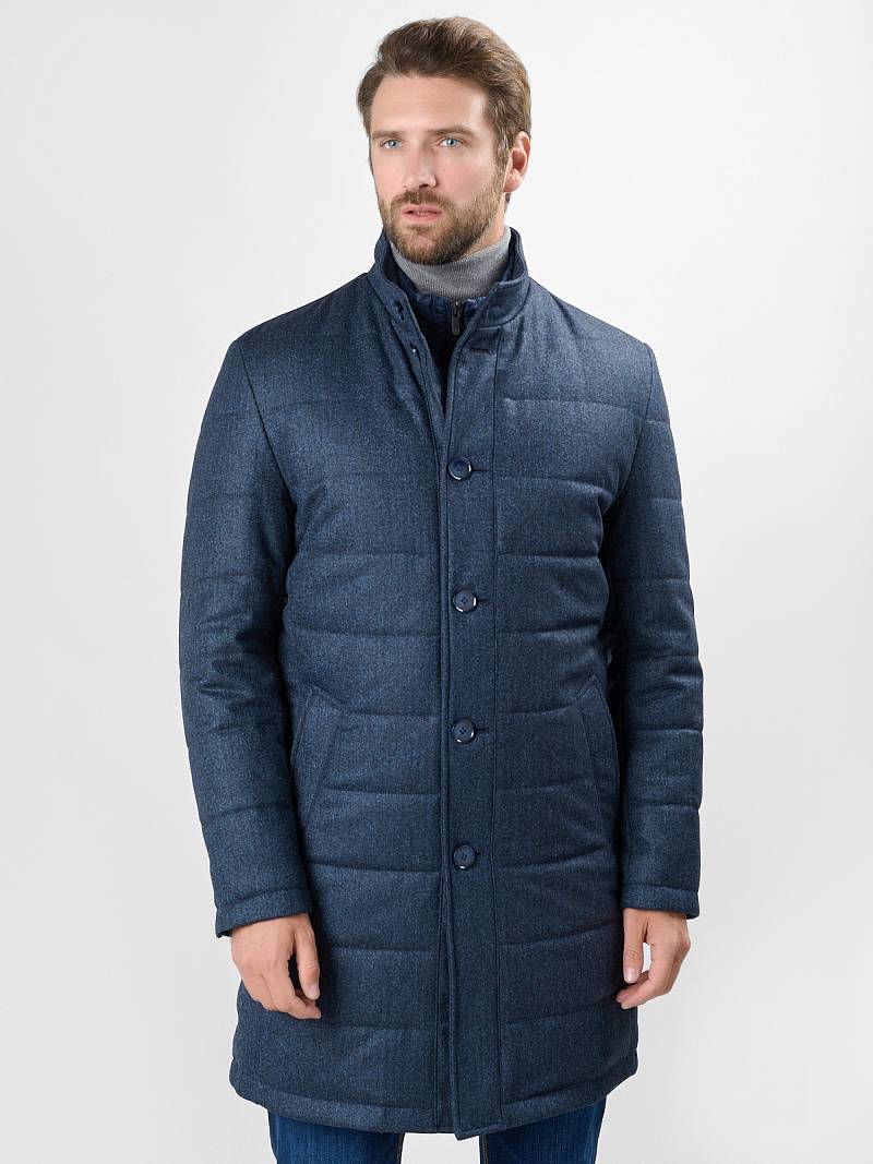 Куртка мужская утепленная с отстегивающийся манишкой на молнию. Застежка куртки на 6 пуговиц. Воротник - стойка. Полочки, спинка, рукава- простеганы горизонтальной стежкой. На полочках - два нижних боковых кармана с листочками. В нижней части среднего шва спинки- шлица на 2-х кнопках. Рукава втачные с локтевыми швами. На подкладке - два внутренних прорезных кармана на молниях. Длина по спинке для размера-роста 50/176 - 82см. Ткань верха: 60% шерсть, 40% кашемир. Подкладка: 100% полиэстер. Утеплитель: термоплюс 200гр./160гр.