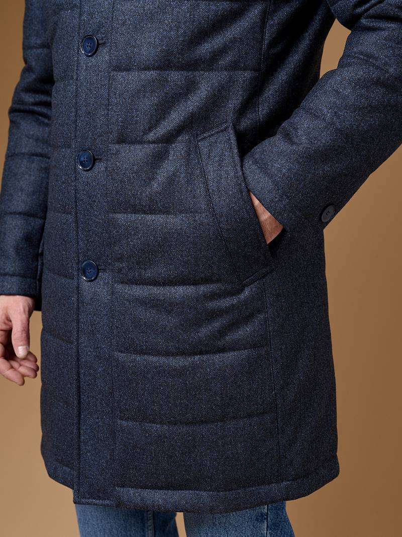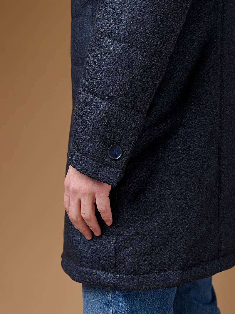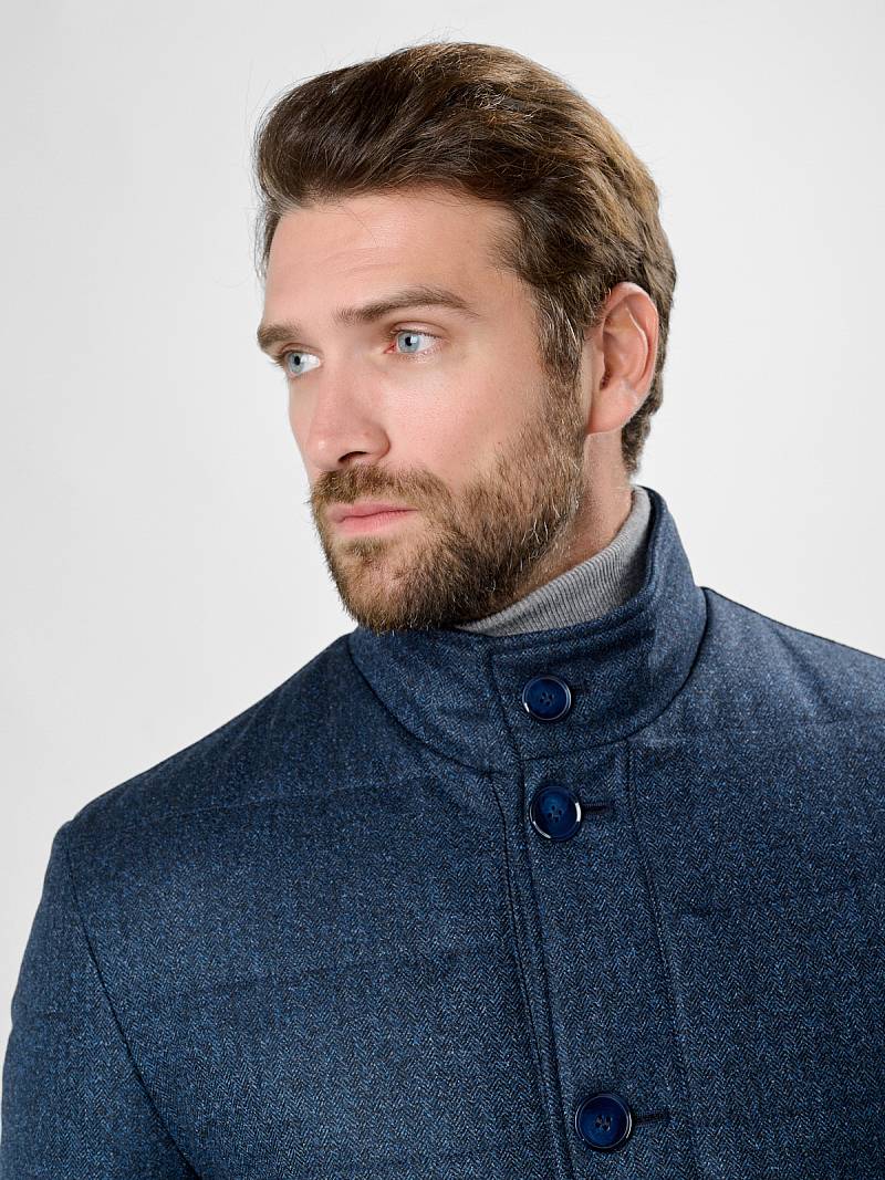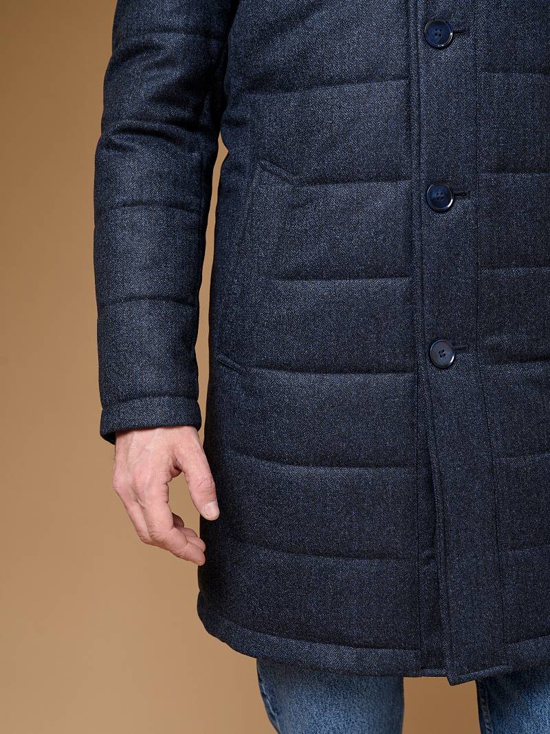 Куртка мужская утепленная с отстегивающийся манишкой на молнию. Застежка куртки на 6 пуговиц. Воротник - стойка. Полочки, спинка, рукава- простеганы горизонтальной стежкой. На полочках - два нижних боковых кармана с листочками. В нижней части среднего шва спинки- шлица на 2-х кнопках. Рукава втачные с локтевыми швами. На подкладке - два внутренних прорезных кармана на молниях. Длина по спинке для размера-роста 50/176 - 82см. Ткань верха: 60% шерсть, 40% кашемир. Подкладка: 100% полиэстер. Утеплитель: термоплюс 200гр./160гр.