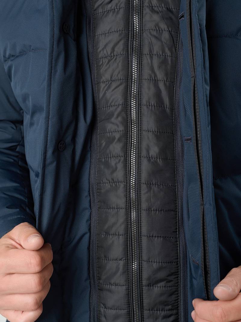 Куртка мужская утепленная с манишкой и со съемным меховым воротником. Меховой воротник - отложной, пристегивается на пуговицах. Манишка сьемная на молниях и маленьких пуговицах. Изделие с супатной потайной застежкой на 5 пуговиц и 1 потайную кнопку. Полочки и спинка- простеганы горизонтально. На полочках - два нижних боковых прорезных кармана с листочкой на магнитах. В среднем шве спинки - шлица на 2-х кнопках. Рукава втачные с локтевыми швами. По низу рукавов - шлица на пуговицах. На подкладке - два внутренних кармана на молнии в рамку. Длина по спинке для размера 50/176 - 95см Ткань верха: 100% полиэстер. Подкладка: 100% полиэстер. Утеплитель: био- пух 180гр/м2/160гр/м2. Воротник: мех натуральный мутон