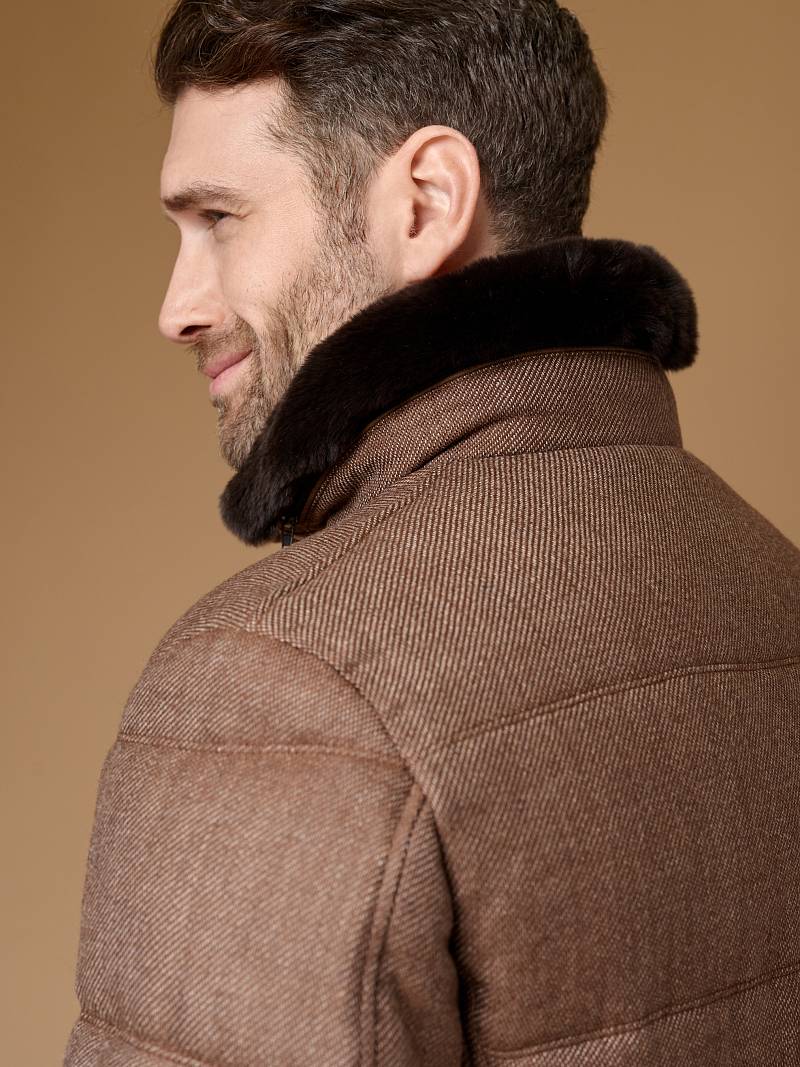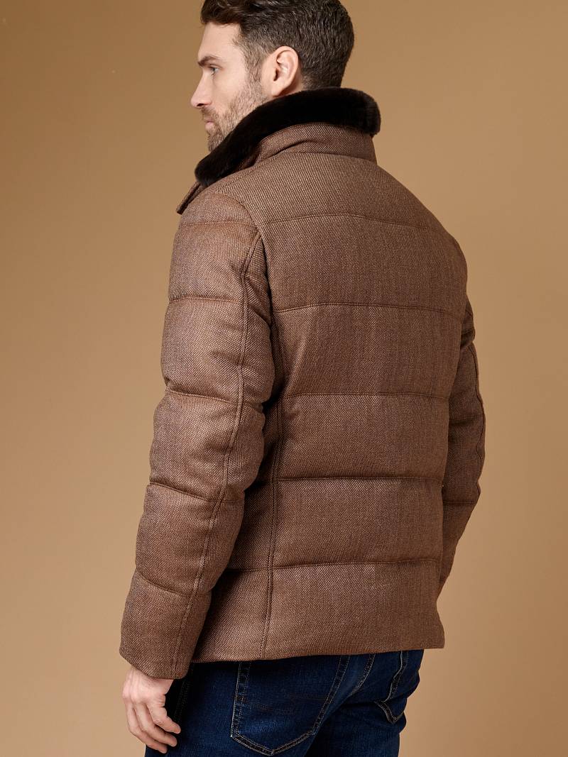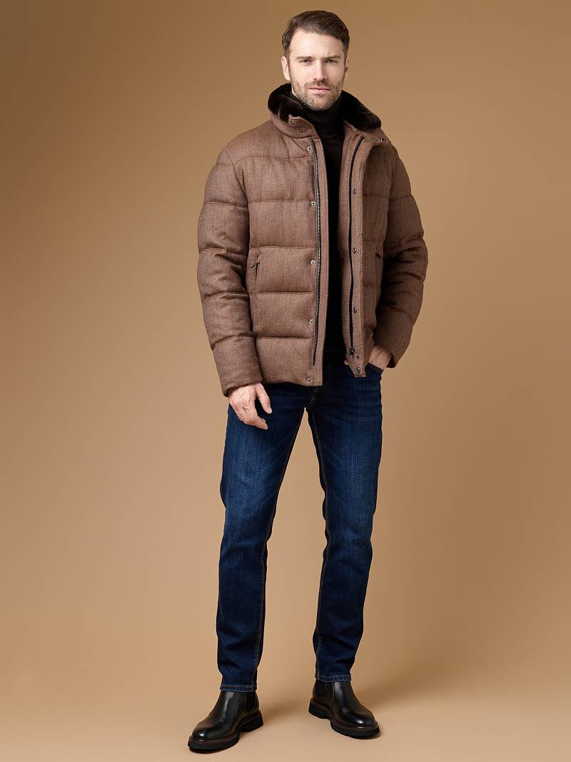 Куртка мужская (пуховик) простегана из шерстяной ткани. Воротник - стойка с меховым отстегивающимся натуральным воротником. На полочках - прорезные карманы с молниями. Подкладка из пуходержащей ткани, на подкладке два кармана на молнии. Длина по спинке для роста 176 - 72см. Ткань верха: 100% шерсть. Подкладка: 100% полиэстер. Утеплитель: био- пух 200гр/180гр. Воротник: мех натуральный ФИНСКИЙ АУКЦИОННЫЙ КРОЛИК REX.