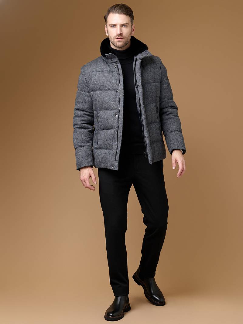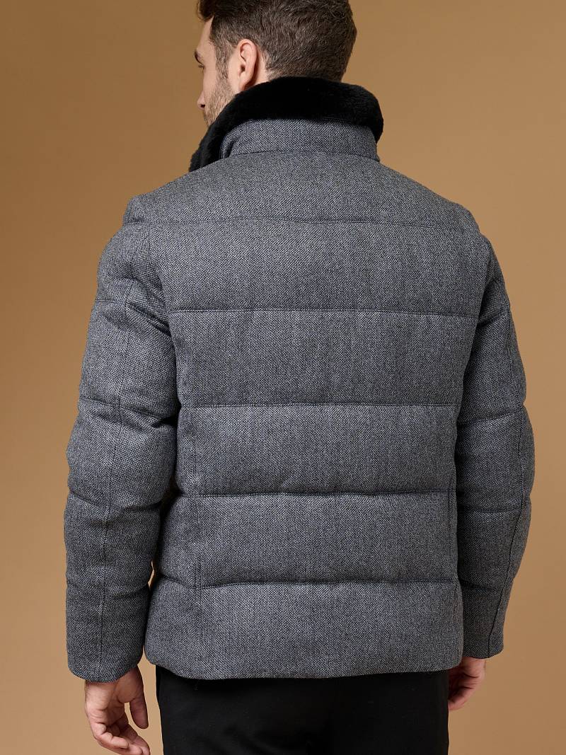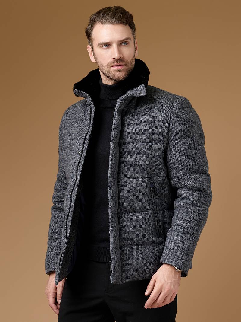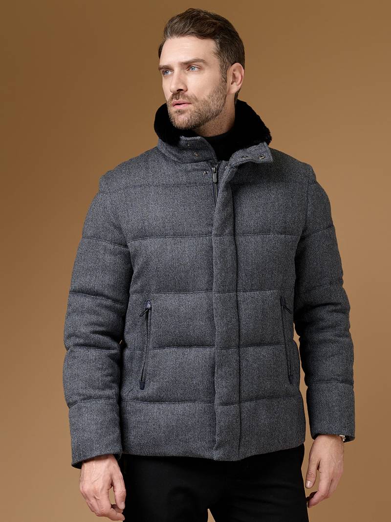 Куртка мужская (пуховик) простегана из шерстяной ткани. Воротник - стойка с меховым отстегивающимся натуральным воротником. На полочках - прорезные карманы с молниями. Подкладка из пуходержащей ткани, на подкладке два кармана на молнии. Длина по спинке для роста 176 - 72см. Ткань верха: 100% шерсть. Подкладка: 100% полиэстер. Утеплитель: био- пух 200гр/180гр. Воротник: мех натуральный ФИНСКИЙ АУКЦИОННЫЙ КРОЛИК REX.