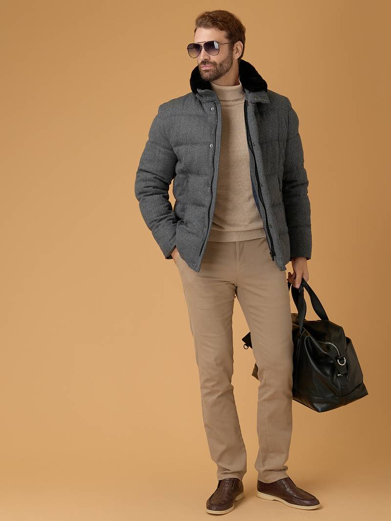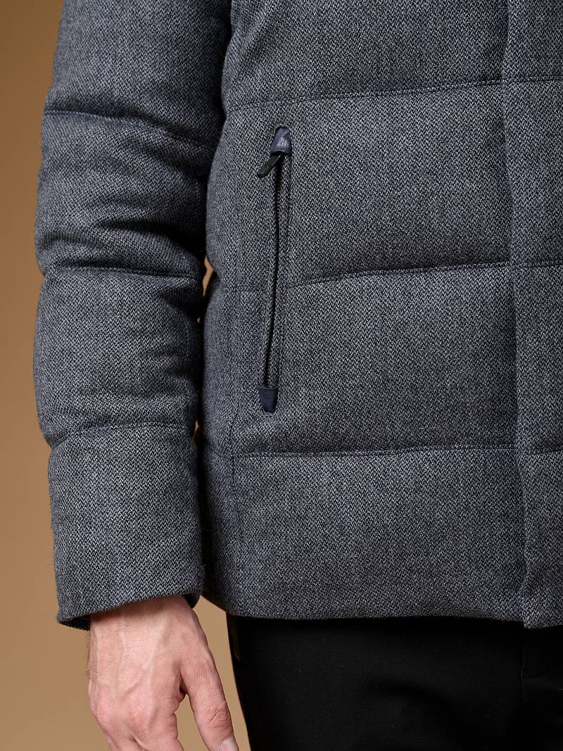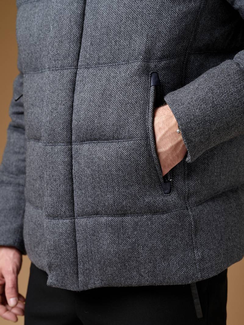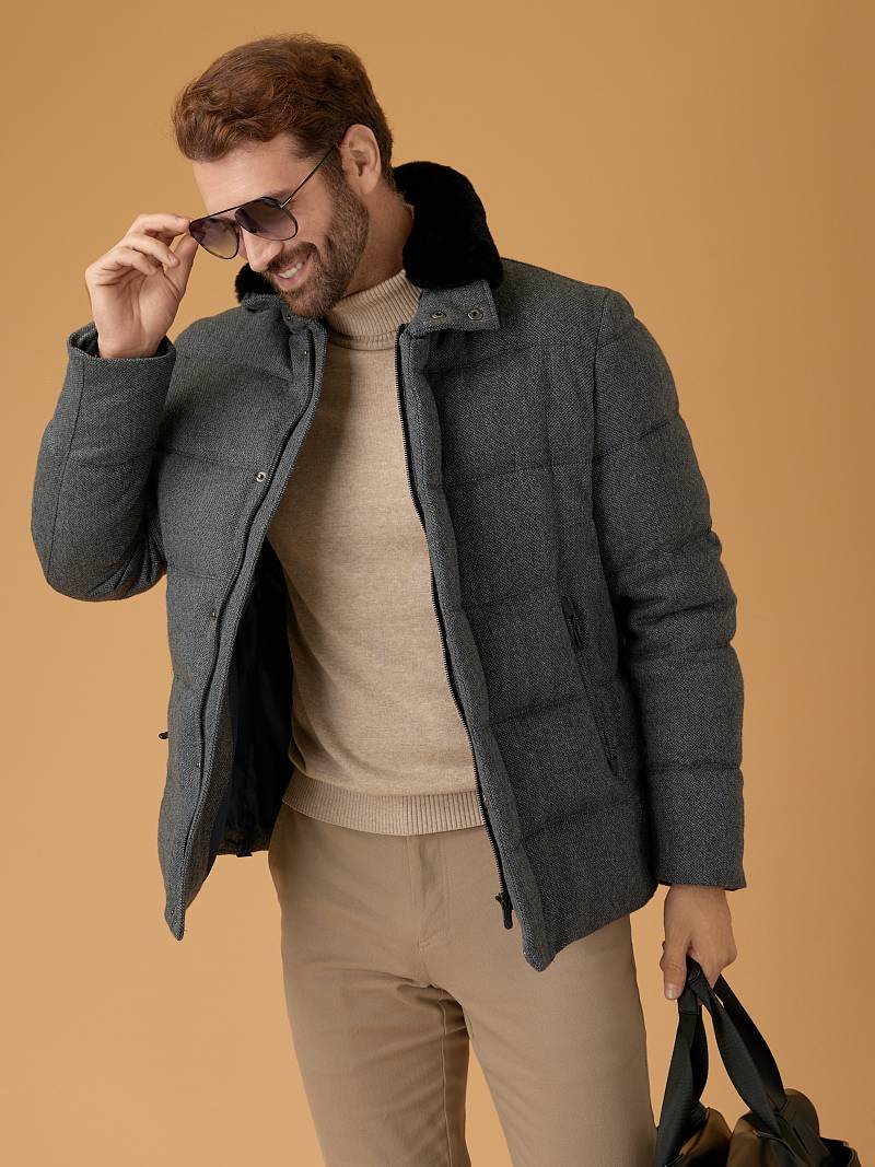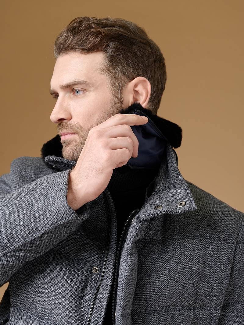 Куртка мужская (пуховик) простегана из шерстяной ткани. Воротник - стойка с меховым отстегивающимся натуральным воротником. На полочках - прорезные карманы с молниями. Подкладка из пуходержащей ткани, на подкладке два кармана на молнии. Длина по спинке для роста 176 - 72см. Ткань верха: 100% шерсть. Подкладка: 100% полиэстер. Утеплитель: био- пух 200гр/180гр. Воротник: мех натуральный ФИНСКИЙ АУКЦИОННЫЙ КРОЛИК REX.