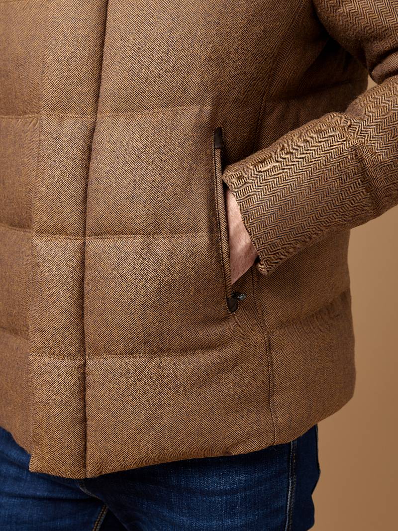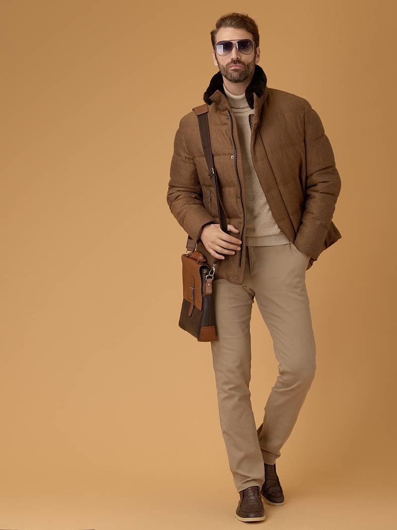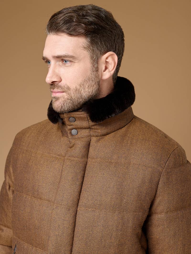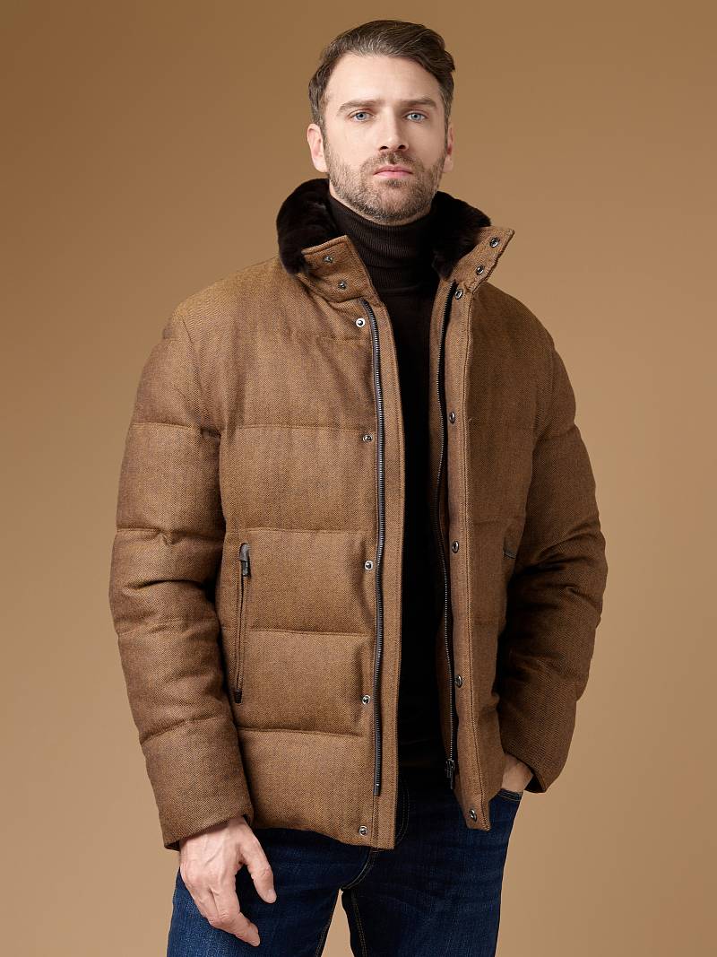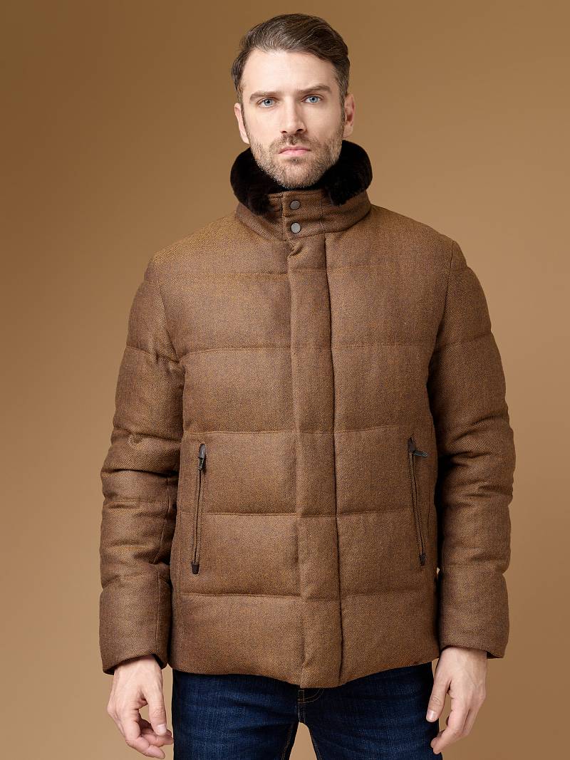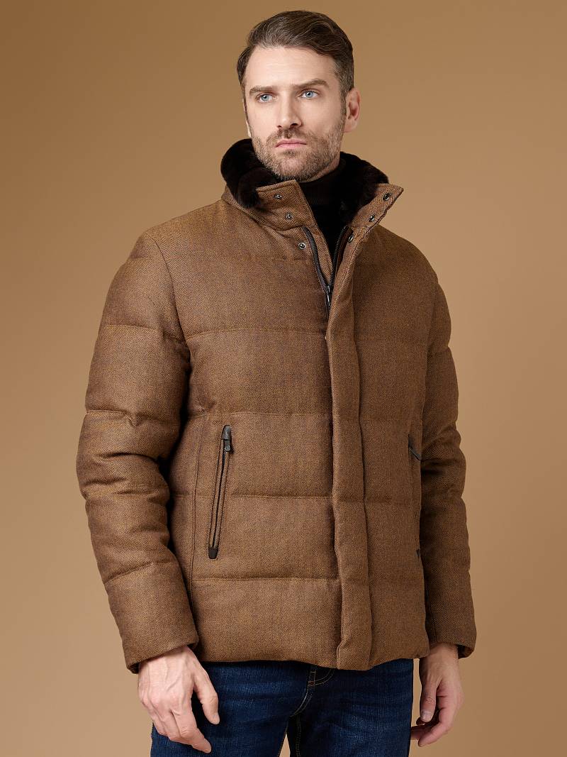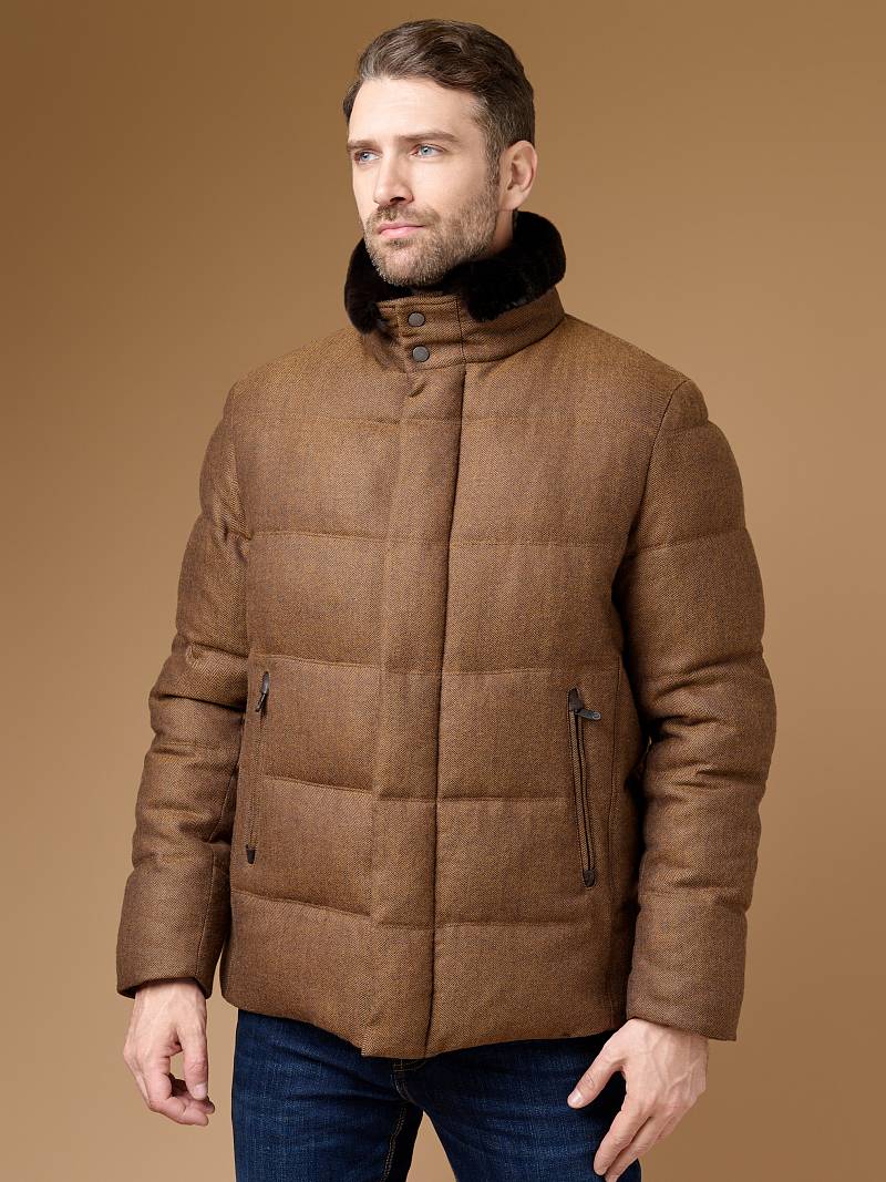 Куртка мужская (пуховик) простегана из шерстяной ткани. Воротник - стойка с меховым отстегивающимся натуральным воротником. На полочках - прорезные карманы с молниями. Подкладка из пуходержащей ткани, на подкладке два кармана на молнии. Длина по спинке для роста 176 - 72см. Ткань верха: 100% шерсть. Подкладка: 100% полиэстер. Утеплитель: био- пух 200гр/180гр. Воротник: мех натуральный ФИНСКИЙ АУКЦИОННЫЙ КРОЛИК REX.