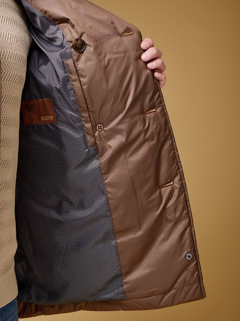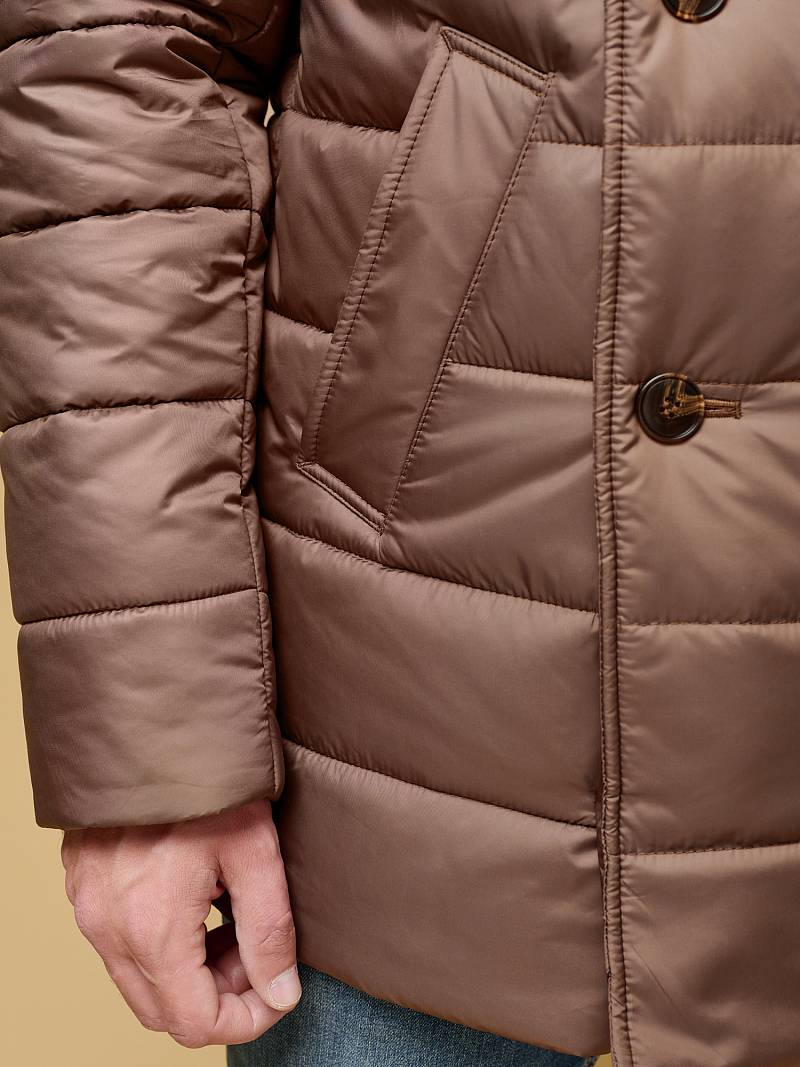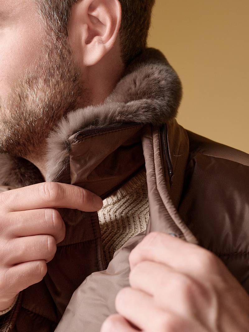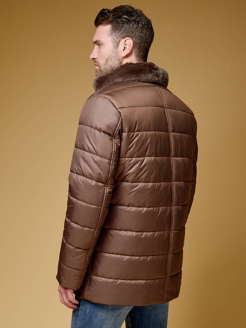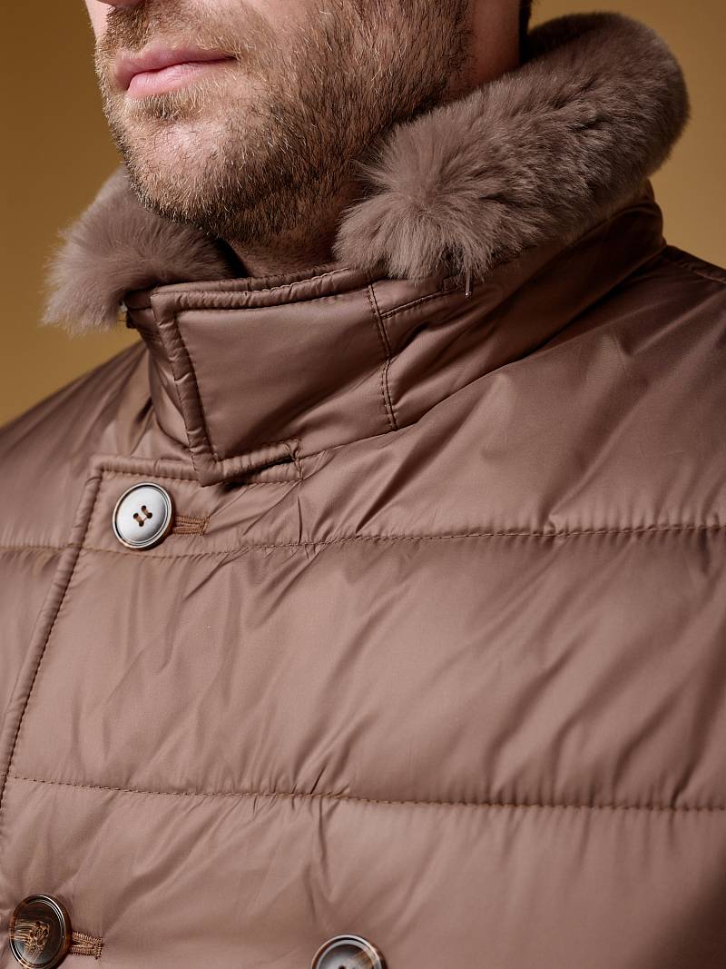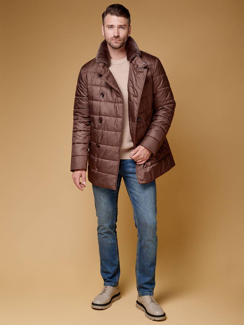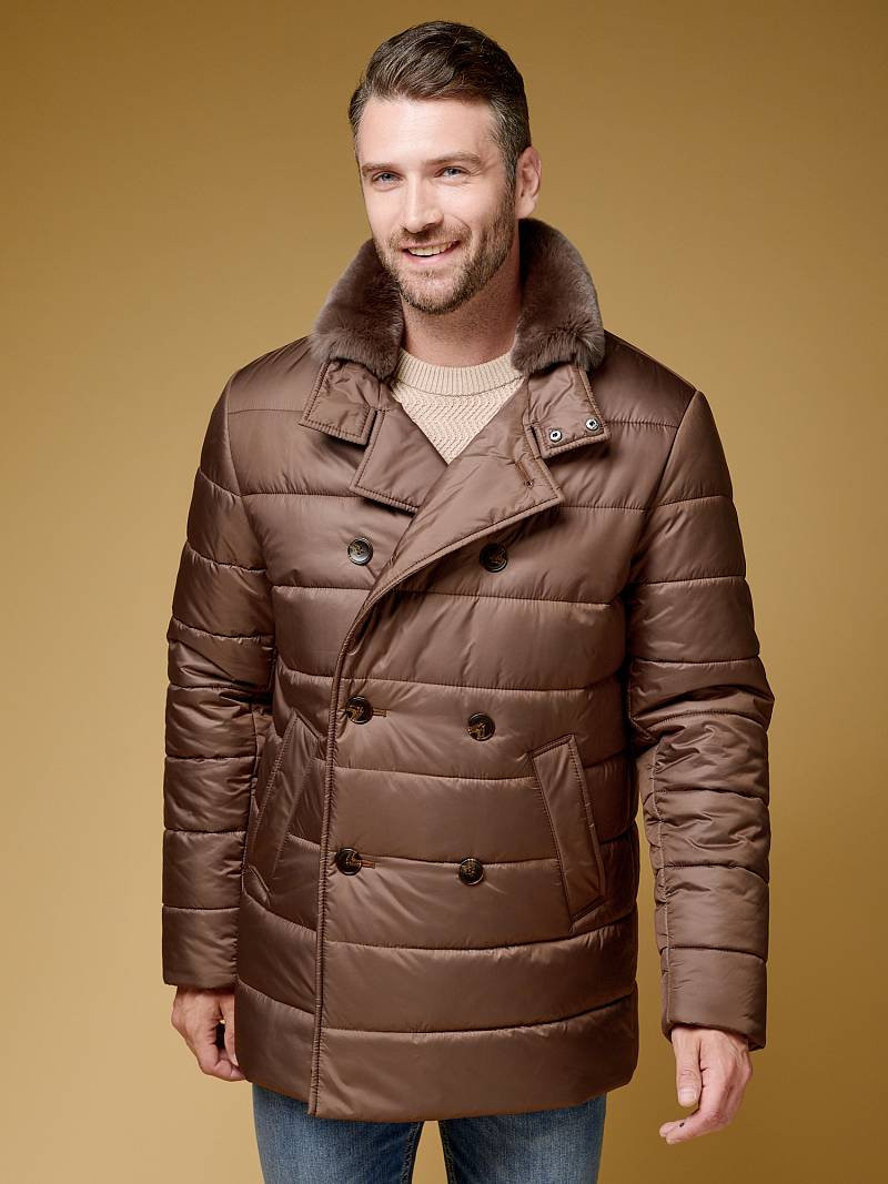 Куртка мужская двубортная стеганая из курточной ткани. Инновационная пуходержащая ткань верха с обработкой wr, cire (ветро и влаго защита). - мягкая, легкая, практичная, не мнется. Изделие с лацканами пиджачного типа и воротником -стойкой, застежка доверху на пуговицы. На стойке отстегивающийся меховой воротник из натурального меха - кролик REX. Полочки, спинка, рукава простеганы, на полочках - два удобных кармана с листочкой на скрытых магнитах. Мешковина карманов из велюра, придает мягкость, создает тепло и комфорт в изделии. Рукава втачные с локтевыми швами, по низу теплые трикотажные манжеты . Технологичная внутренняя подкладка с защитой от миграции утеплителя, на подкладке - два вместительных внутренних кармана для документов с застежкой молнией. Длина по спинке-82см. Ткань верха: 100%полиэстер. Подкладка: 100%полиэстер. Утеплитель: термоплюс 250гр/210гр. Воротник: натуральный мех - кролик REX