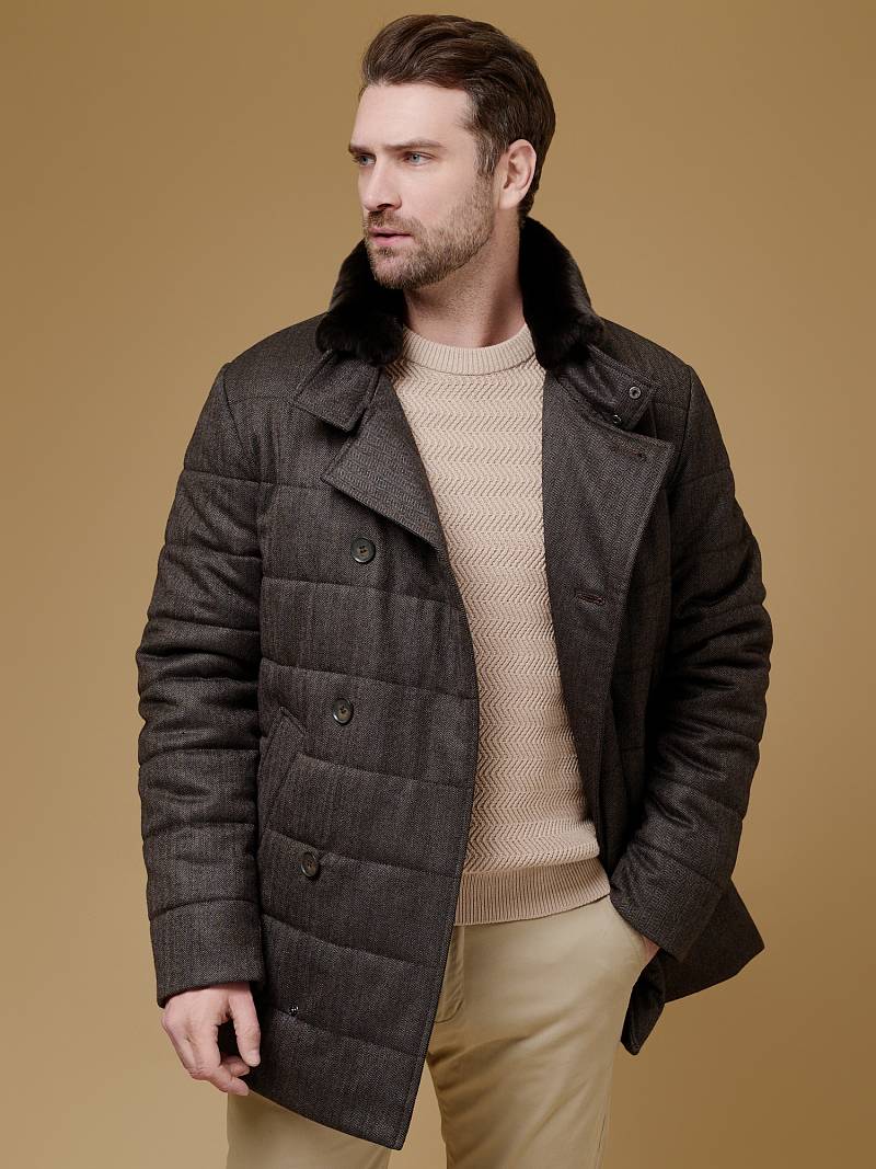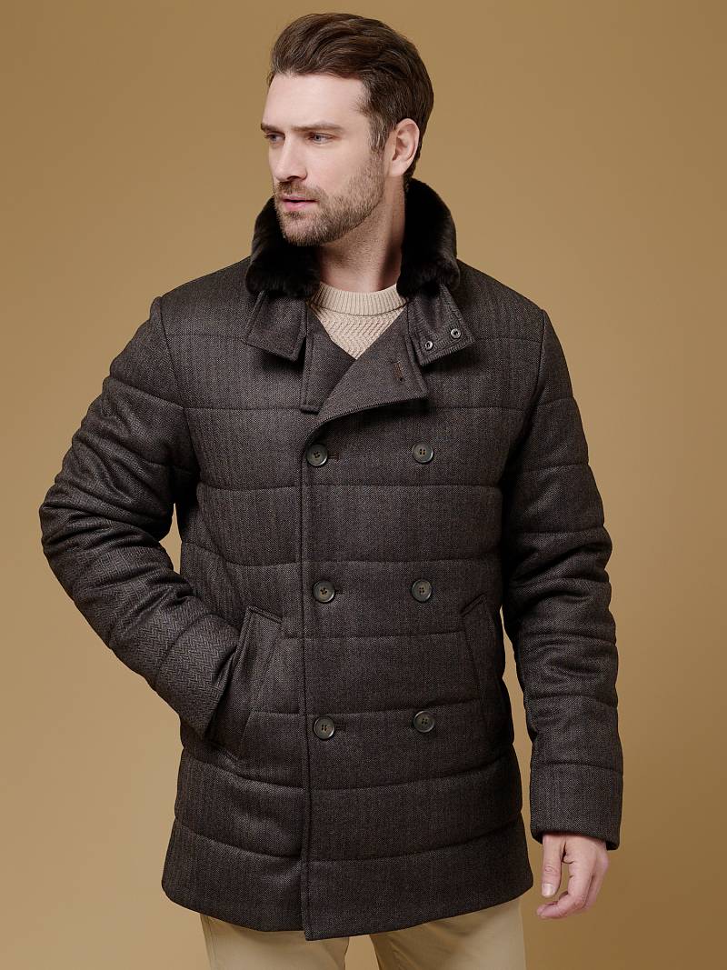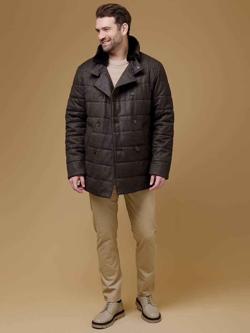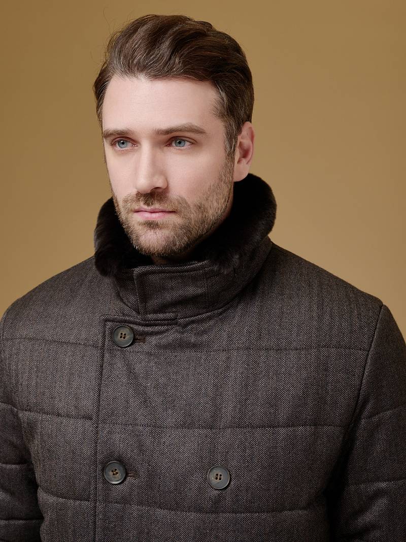 Куртка мужская двубортная утепленная из шерстяной ткани. Изделие с лацканами пиджачного типа и воротником -стойкой, застежка доверху на пуговицы. На стойке меховой отстегивающийся воротник из натурального меха, придает мягкость и создает комфорт в носке. Полочки, спинка, рукава простеганы, на полочках - два кармана с листочкой на скрытых магнитах. Мешковина карманов из велюра, придает мягкость, создает тепло и комфорт в изделии. Рукава втачные с локтевыми швами, по низу трикотажные манжеты . На подкладке - два внутренних прорезных кармана с листочками на молнии. Рекомендуется обработать изделие водонепроницаемым аэрозолем для защиты от неблагоприятных погодных условий. Длина по спинке-82см. Ткань верха: 100%шерсть. Подкладка: 100%полиэстер. Утеплитель: термоплюс 200гр/180гр. Воротник: натуральный мех REX