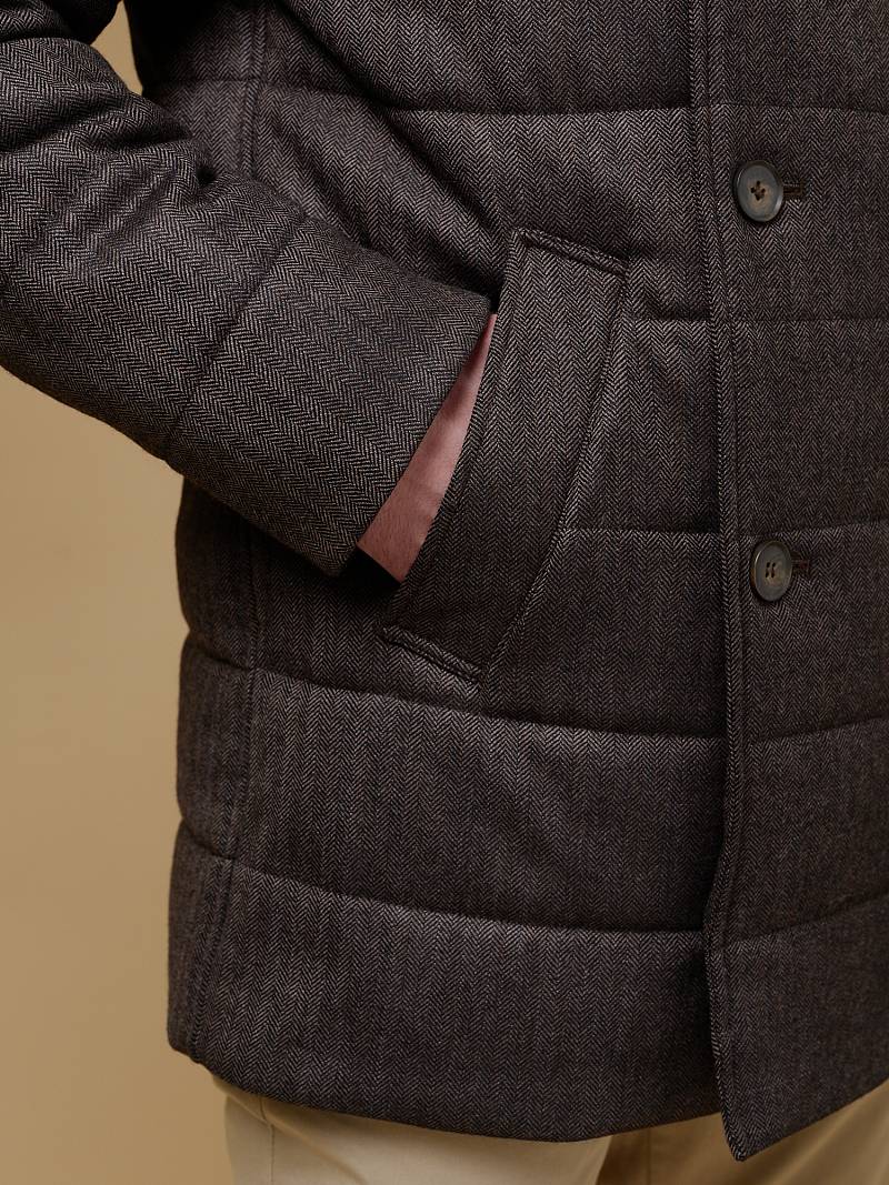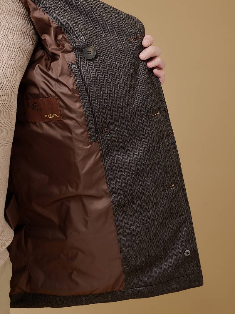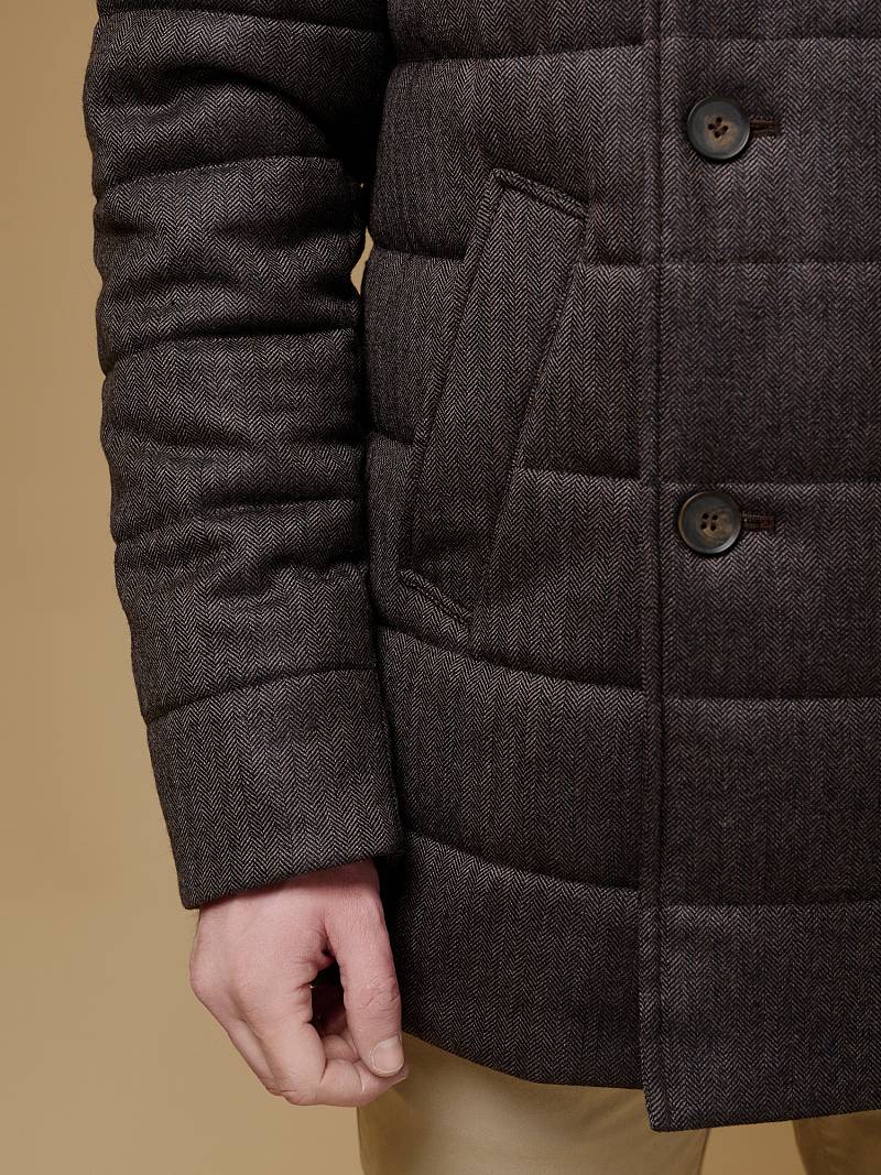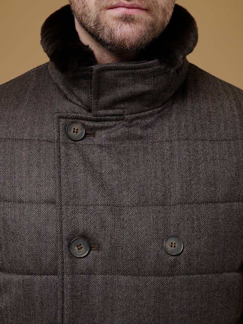 Куртка мужская двубортная утепленная из шерстяной ткани. Изделие с лацканами пиджачного типа и воротником -стойкой, застежка доверху на пуговицы. На стойке меховой отстегивающийся воротник из натурального меха, придает мягкость и создает комфорт в носке. Полочки, спинка, рукава простеганы, на полочках - два кармана с листочкой на скрытых магнитах. Мешковина карманов из велюра, придает мягкость, создает тепло и комфорт в изделии. Рукава втачные с локтевыми швами, по низу трикотажные манжеты . На подкладке - два внутренних прорезных кармана с листочками на молнии. Рекомендуется обработать изделие водонепроницаемым аэрозолем для защиты от неблагоприятных погодных условий. Длина по спинке-82см. Ткань верха: 100%шерсть. Подкладка: 100%полиэстер. Утеплитель: термоплюс 200гр/180гр. Воротник: натуральный мех REX