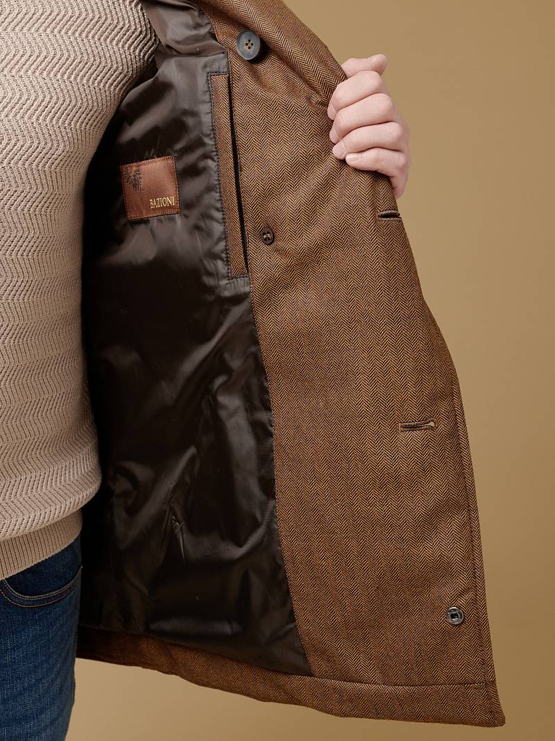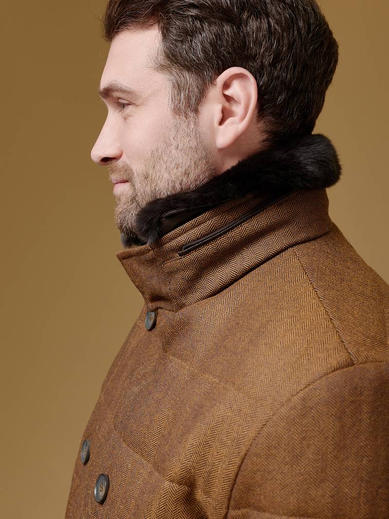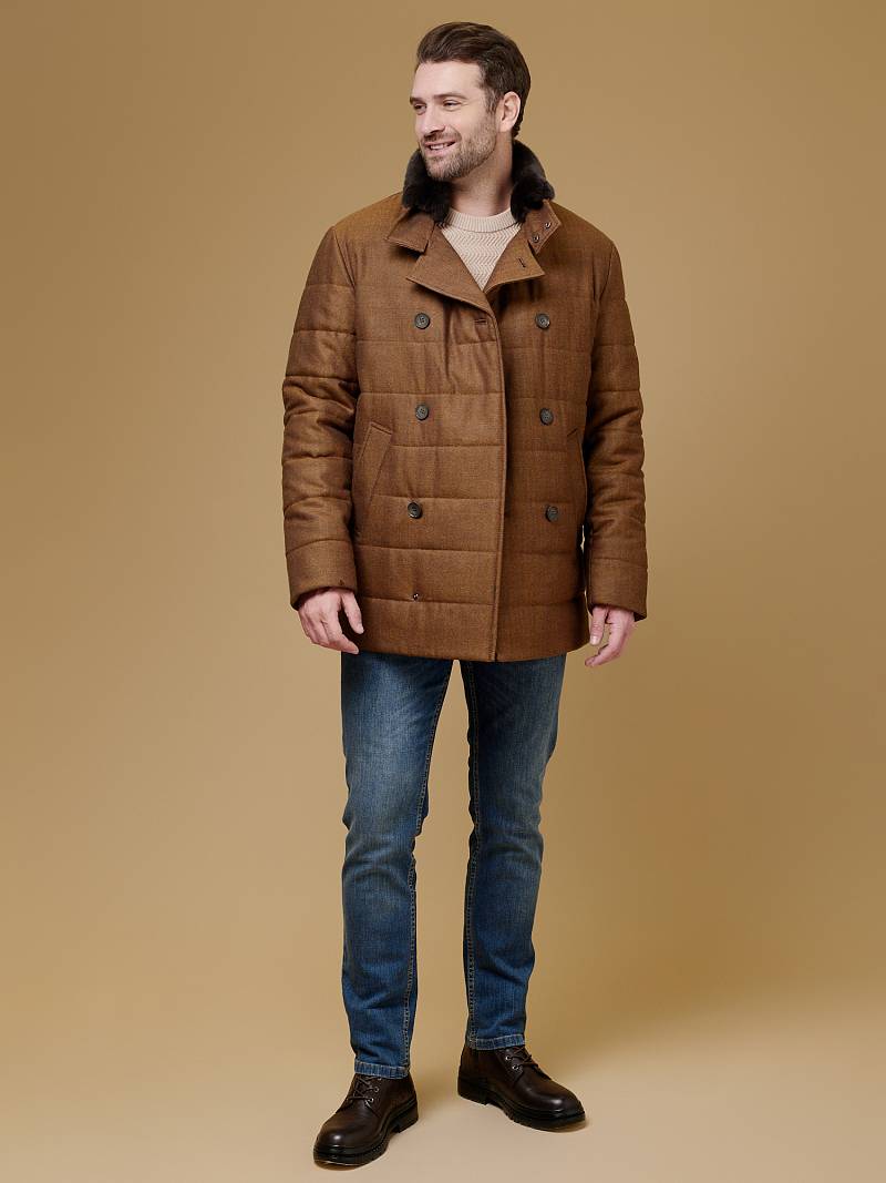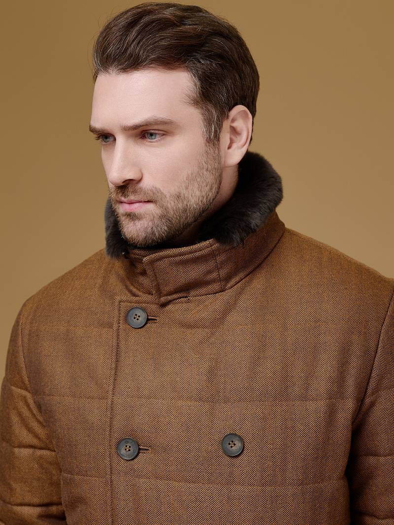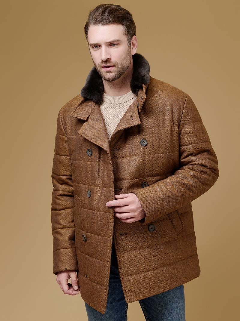 Куртка мужская двубортная утепленная из шерстяной ткани. Изделие с лацканами пиджачного типа и воротником -стойкой, застежка доверху на пуговицы. На стойке меховой отстегивающийся воротник из натурального меха, придает мягкость и создает комфорт в носке. Полочки, спинка, рукава простеганы, на полочках - два кармана с листочкой на скрытых магнитах. Мешковина карманов из велюра, придает мягкость, создает тепло и комфорт в изделии. Рукава втачные с локтевыми швами, по низу трикотажные манжеты . На подкладке - два внутренних прорезных кармана с листочками на молнии. Рекомендуется обработать изделие водонепроницаемым аэрозолем для защиты от неблагоприятных погодных условий. Длина по спинке-82см. Ткань верха: 100%шерсть. Подкладка: 100%полиэстер. Утеплитель: термоплюс 200гр/180гр. Воротник: натуральный мех REX
