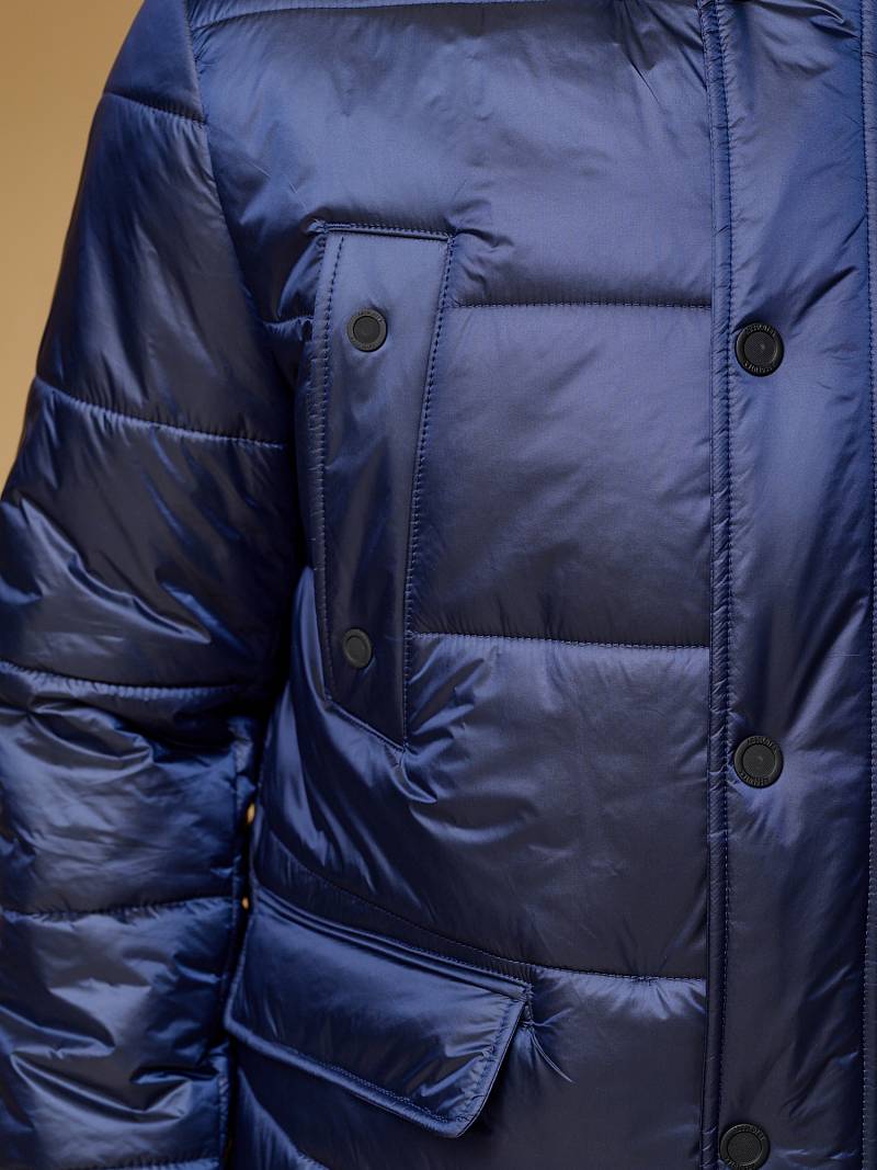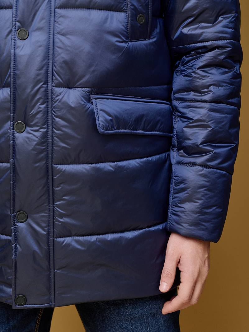 Куртка мужская из пуходержащей ткани с водоотталкивающей пропиткой WR, CIRE с высокой степенью влаго- и ветрозащитой. Ткань верха - легкая и имеет эффект- благородный блеск. Изделие - c двойным капюшоном и съемной манишкой, манишка с капюшоном - из отделочной ткани. Полочки, спинка, рукава- простеганы горизонтальной стежкой. На полочках - два нагрудных кармана с листочками и два нижних боковых кармана с клапанами на скрытых магнитах. Рукава втачные с локтевыми швами. На подкладке - два внутренних прорезных кармана на молниях. Длина по спинке для размера-роста 50/176 - 84см. Ткань верха: 100%нейлон. Подкладка: 100%полиэстер. Утеплитель: термоплюс 250гр/210гр.