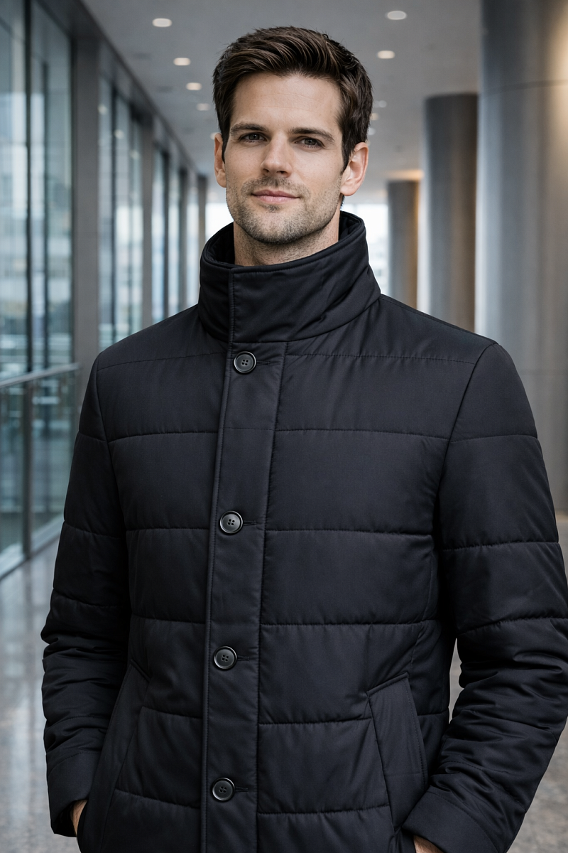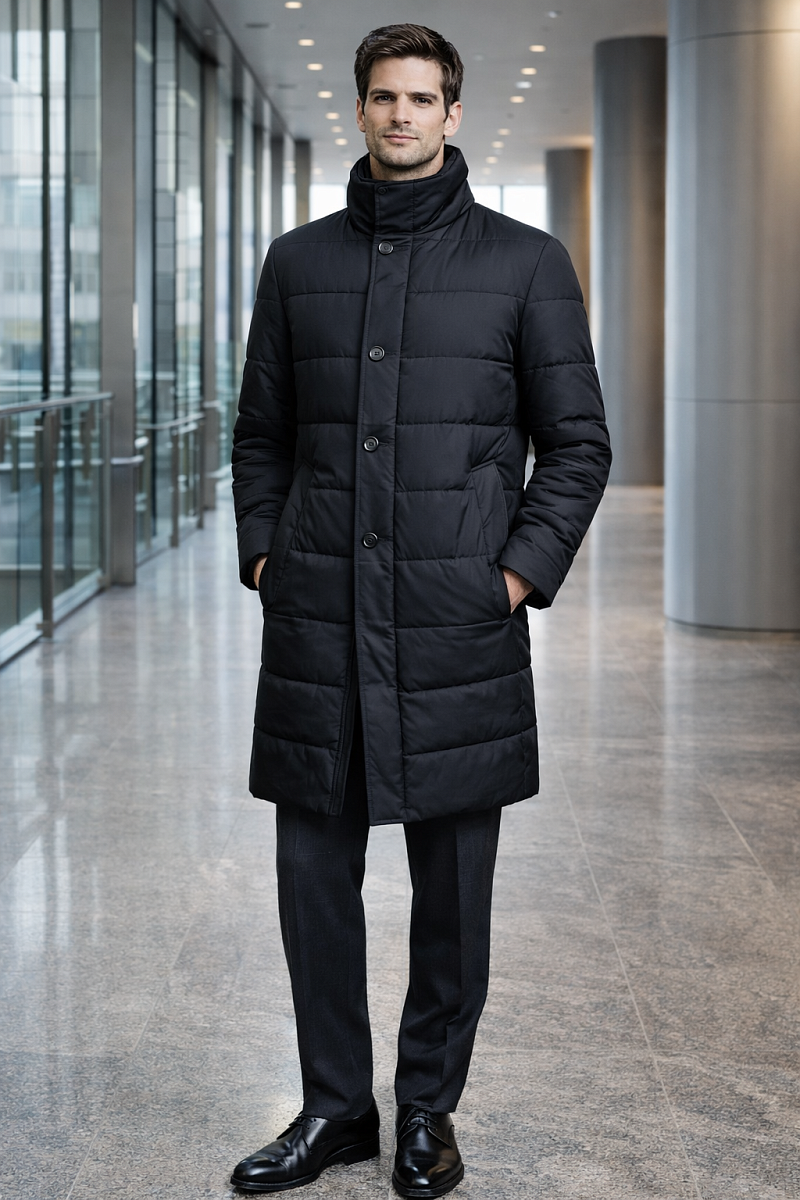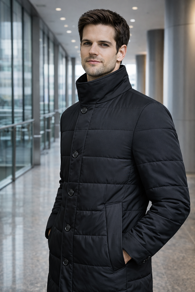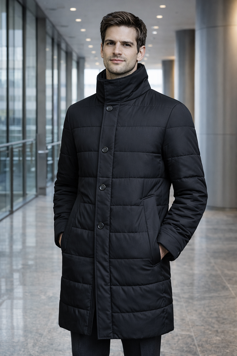 Мужская стеганая куртка - пальто из курточной ткани. Инновационная пуходержащая ткань верха с обработкой wr, cire (ветро и влаго защита). - мягкая, легкая, практичная, не мнется. Удобный, утепленный воротник -стойка на двух кнопках. Застежка изделия с планкой на молнию японской фирмы YKK, рассчитана на высокий цикл застегиваний и расстегиваний. Ветрозащитная планка на пуговицах от холода в непогоду. Полочки и спинка простеганы. На полочках - два теплых боковых кармана с листочкой на скрытых магнитах. Мешковина карманов из велюра, придает мягкость, создает тепло и комфорт в изделии. Спинка со шлицей. Рукава втачные с локтевыми швами. Технологичная внутренняя подкладка с защитой от миграции утеплителя, на подкладке - два вместительных внутренних кармана для документов с застежкой молнией. Длина по спинке-90см. Ткань верха: 100%полиэстер. Подкладка: 100%полиэстер. Утеплитель: термоплюс 200гр/200гр