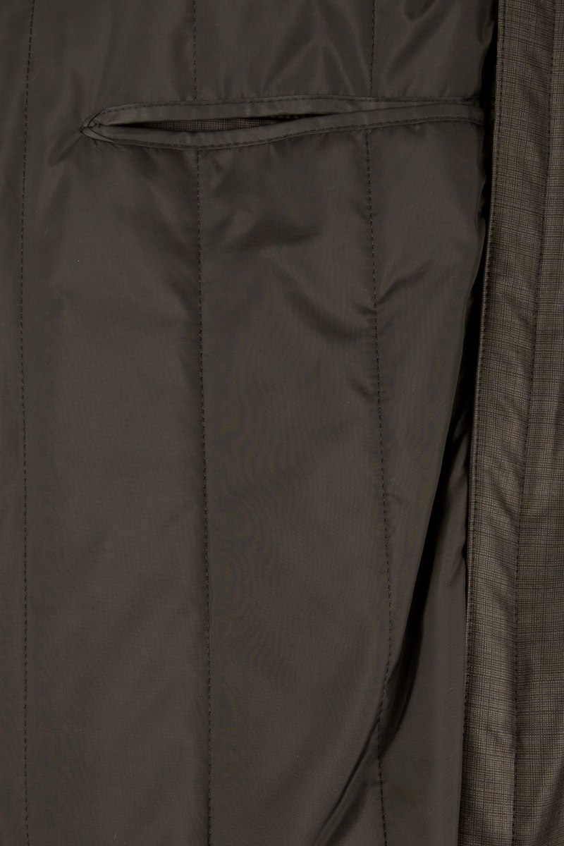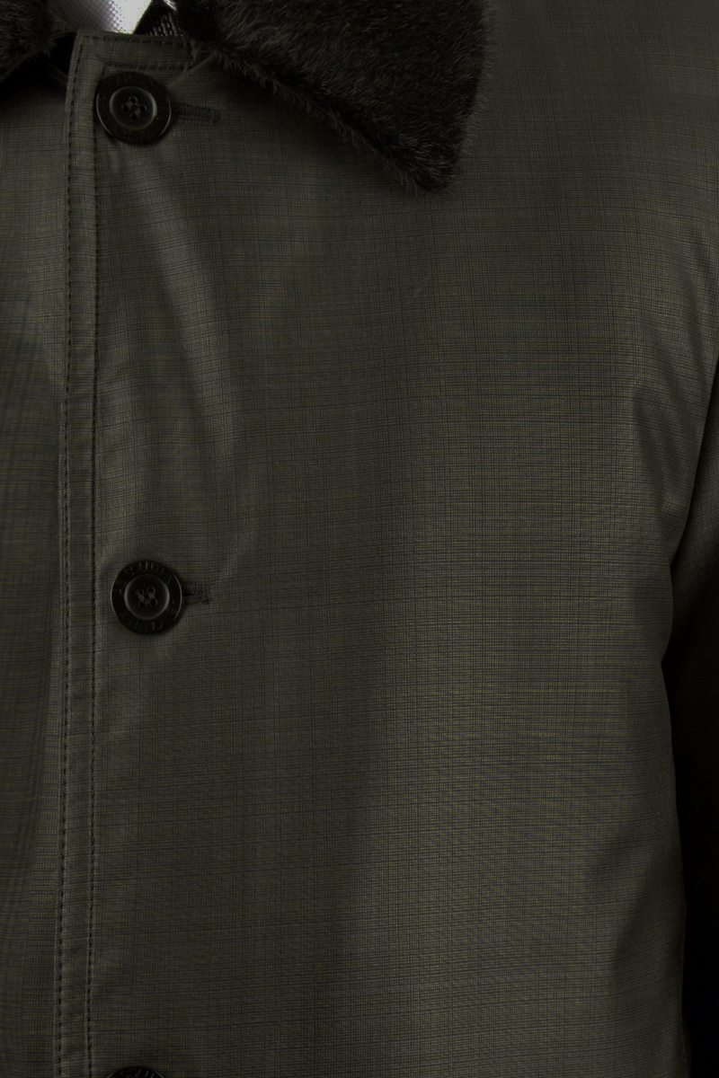 Плащ-пальто мужское прямого силуэта. Воротник отложной с мехом. Меховой воротник исусственный- сьемный на пуговицах. Застежка изделия на пуговицах, на полочках - прорезные карманы с листочками. Спинка со средним швом и шлицей.