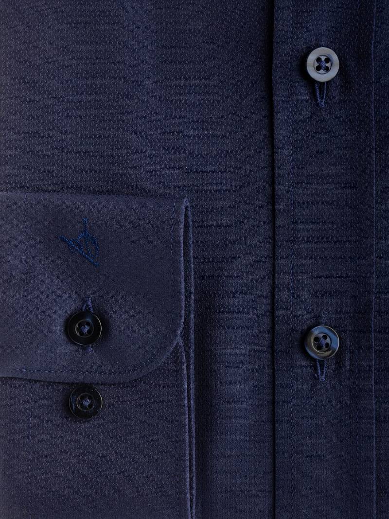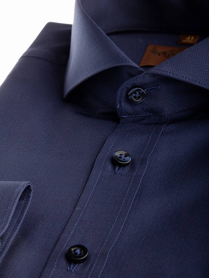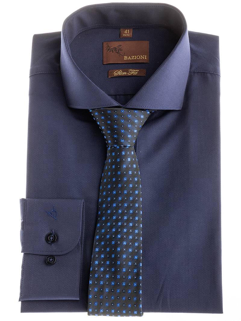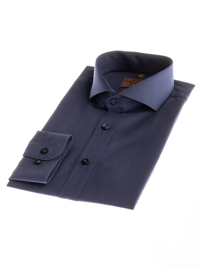 Slim fit, воротник - акула, манжет - с закругленными концами. Застежка - ложная планка